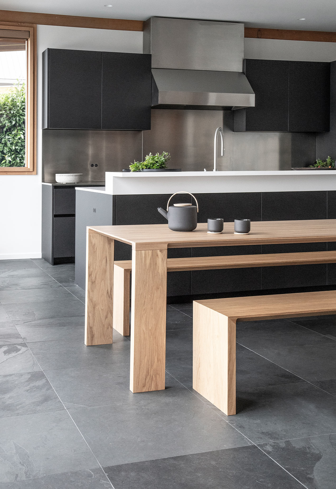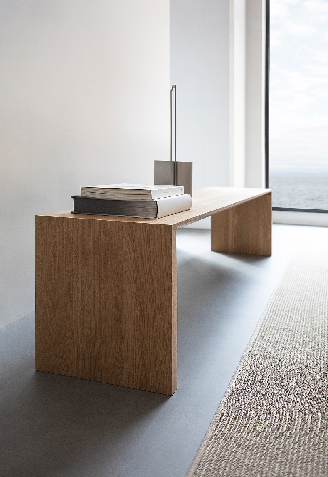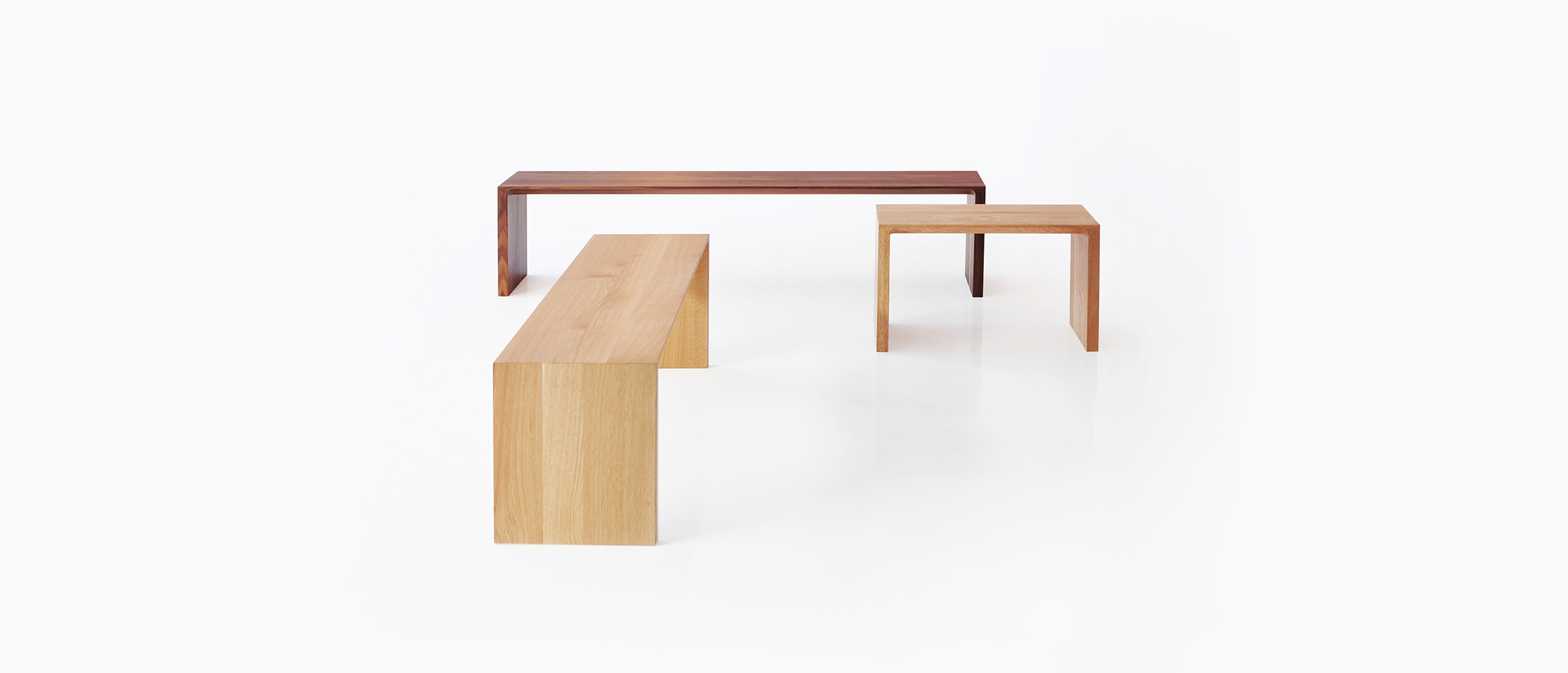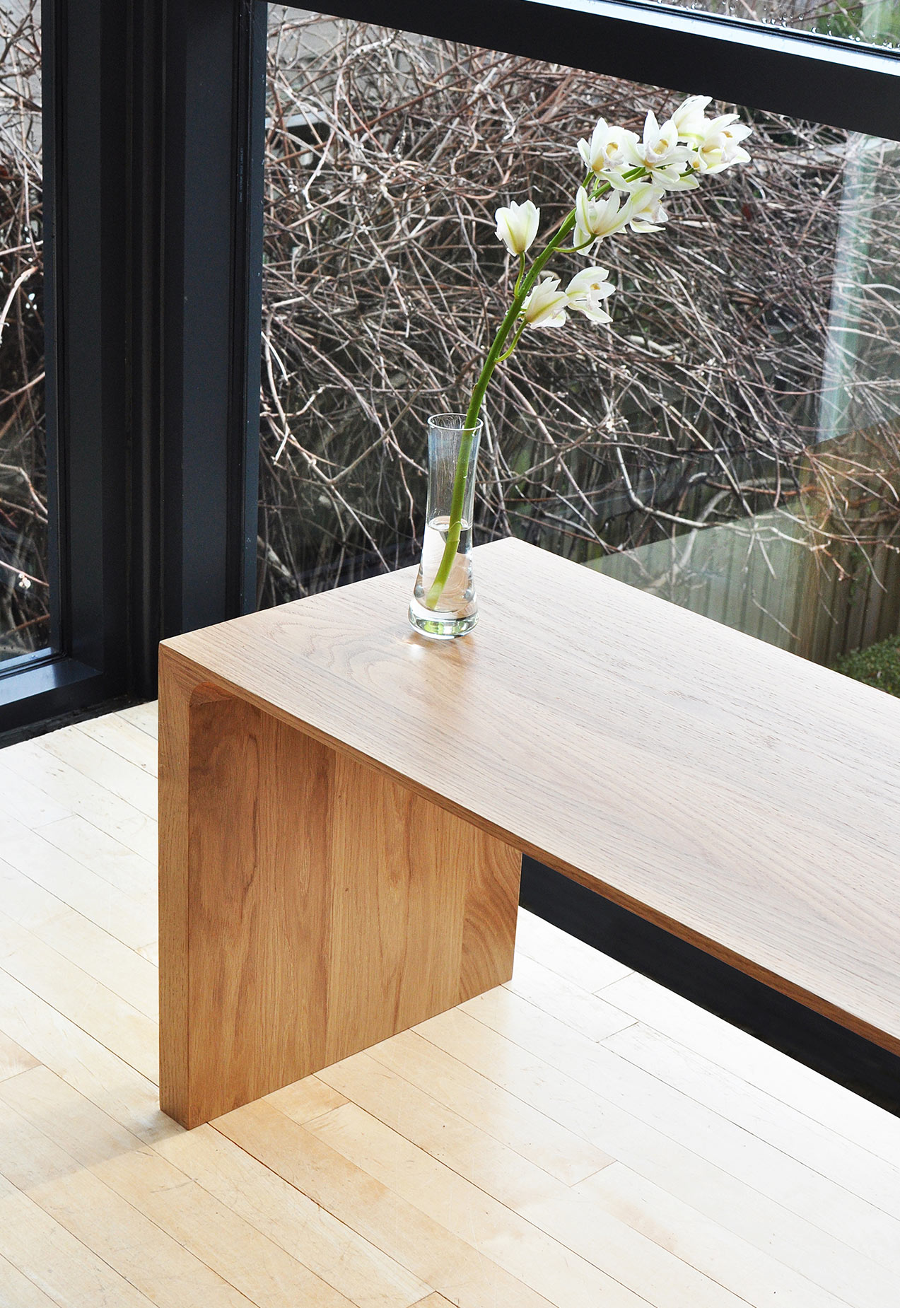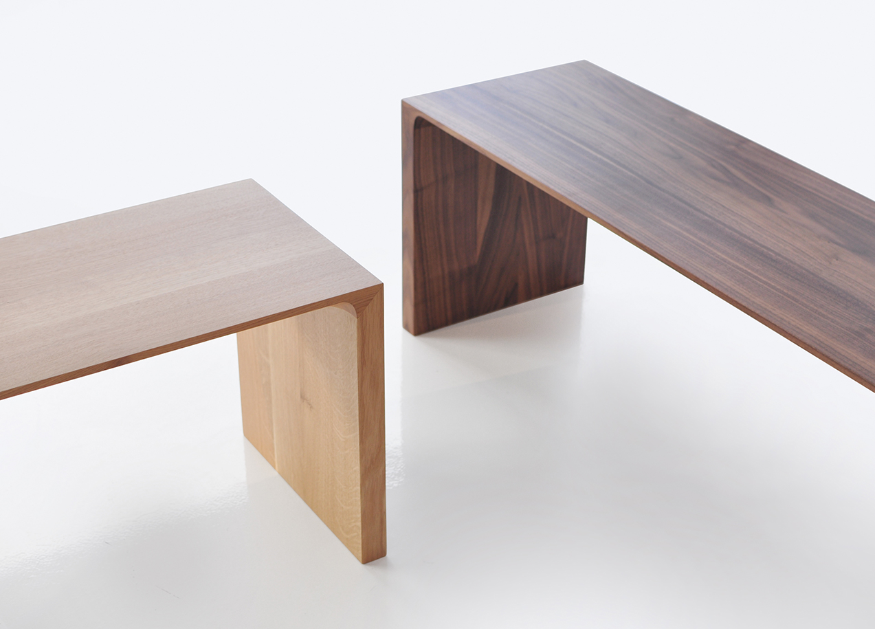 A solid wood bench with many applications. The signature radius bevel on the edge highlights the natural beauty of the wood grain.