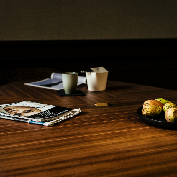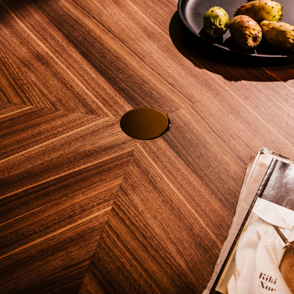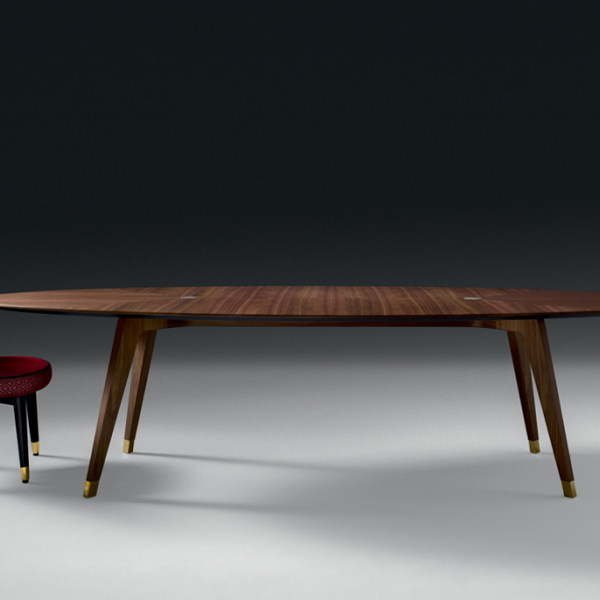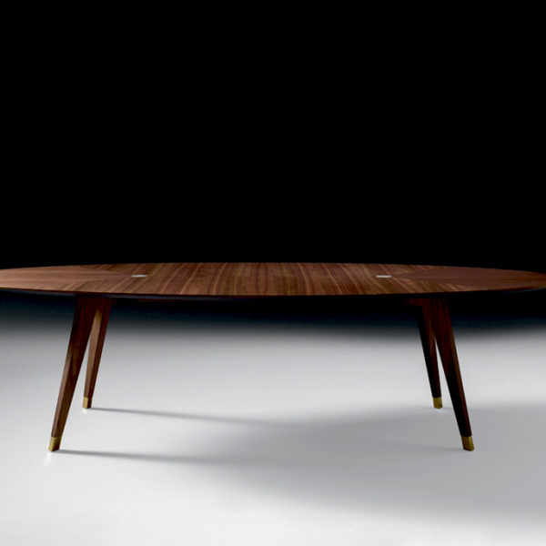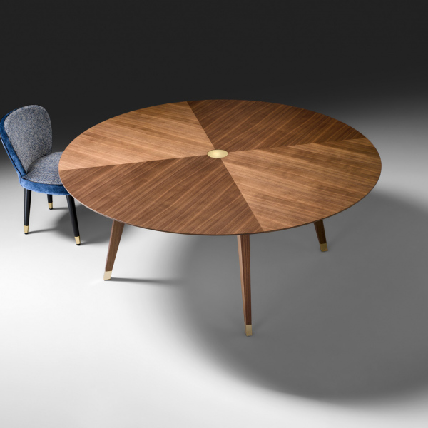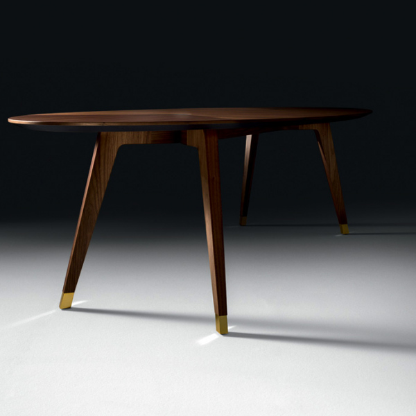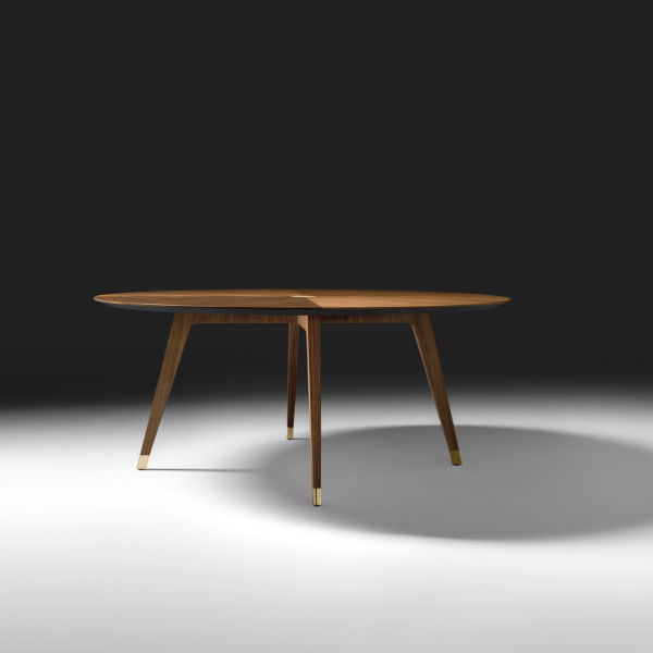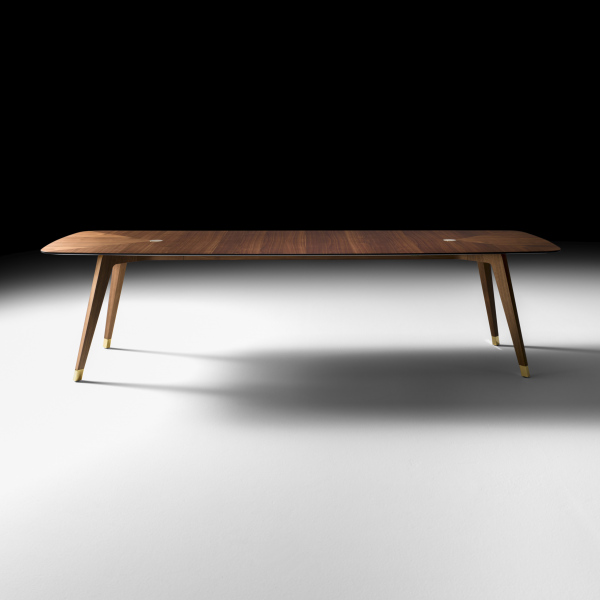 Tavolo con struttura in Noce Canaletto massiccio e piano in MDF impliacciato in Noce Canaletto. Puntali e inserti in