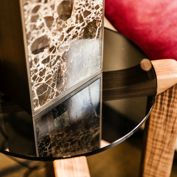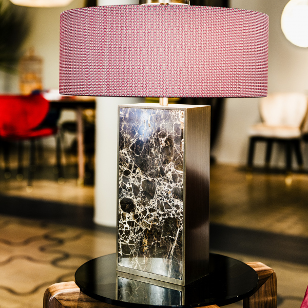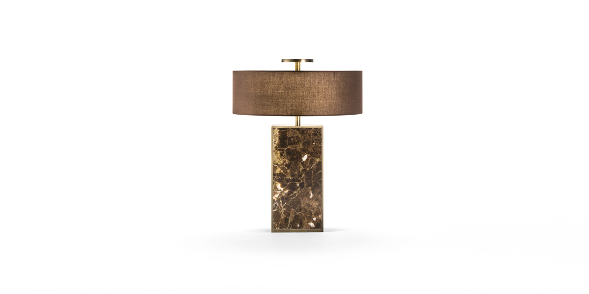 in marmo Emperador, elementi metallici in finitura bronzo scuro opaco. Diffusore in vetro opaco e paralume in
