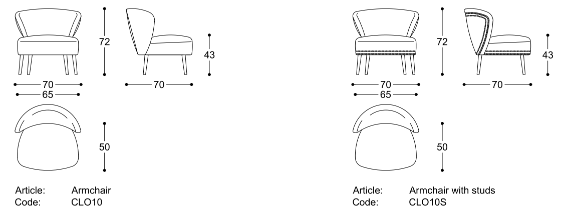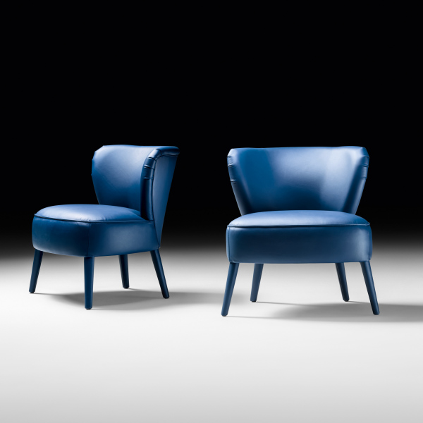 Armchair with structure in beech wood, seat and back in fire-resistant expanded polyurethane. Feet upholstered.