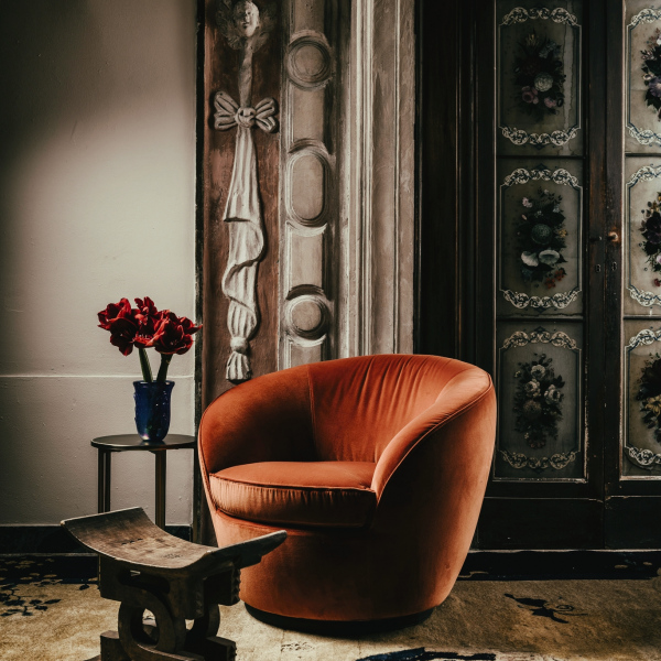 Swivel base (90° left and 90° right with return). Removable cover only the cushions.