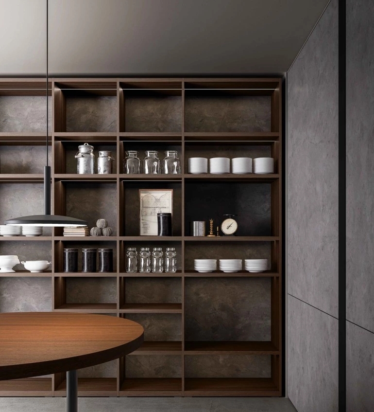 Modular system for open back wall-mounted or freestanding bookcases. It features the same vertical and horizontal thicknesses as Antibes, characterised by a great compositional flexibility, thanks to the various heights of the side panels and different widths of the shelves and base panels, while their thickness (side panels: 220 mm, shelves: 380 mm) and their depth (400 mm) do not change. The available finishes include matt lacquers and veneered wood species of the Boffi collections. The system allows to create floor-to-ceiling compositions also freestanding, which must necessarily be fixed to the ceiling. Antibes bookcase can be installed on kitchen worktop too, used as storage system. LED bar lightings complete the elegant architectural product. Design Piero Lissoni and C.R.S. Boffi.