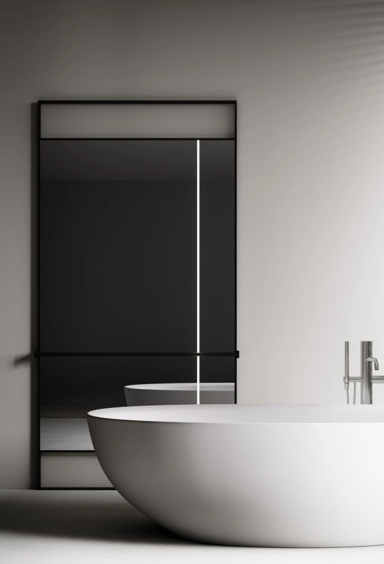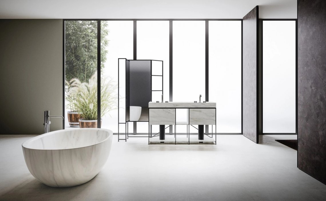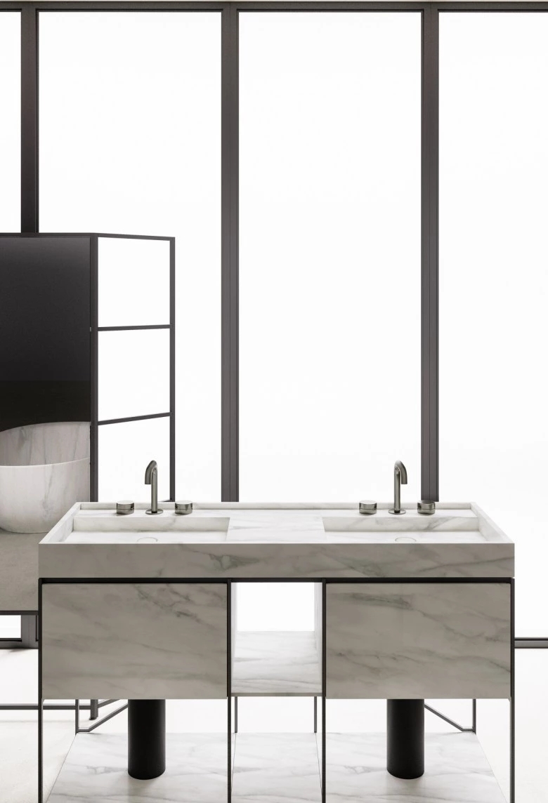 The acronym R.I.G. (Rudimentary Interior Geometry) defines a universal modular system for shelving and shelves based on a thin, linear structure made of AISI 304 solid stainless steel, in embossed black or brass painted. The R.I.G. system, developed in several versions that can furnish different spaces, has been designed by Mikal Harrsen, Danish industrial designer and founder of the MA/U Studio brand, which is part of the Boffi | De Padova group. In the version specifically designed for use in bathrooms, the elements of the metal structure - uprights, rods, stabilizers and supports - compose a sober and solid frame to support shelves, tops, fronts, panels and top-mounted washbasins, including some special models. The metal elements of R.I.G. are also developed as frames for mirrors (with or without integrated light), as for light bars and towel rails. The R.I.G. Bathroom system creates customised wall or island compositions thanks to the wide range of materials, colours and finishes available for tops and shelves, from lacquers to wood, from MDI composite to Corian?, from marble to stone and glass. The top-mounted washbasins can be chosen from the Boffi range or from the collection created specifically for this bathroom system - RD1 and R.I.G. models by Mikal Harrsen - available in various sizes and different materials (Corian?, stone, marble, MDI composite). Design Mikal Harrsen.