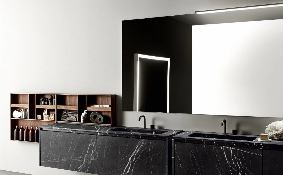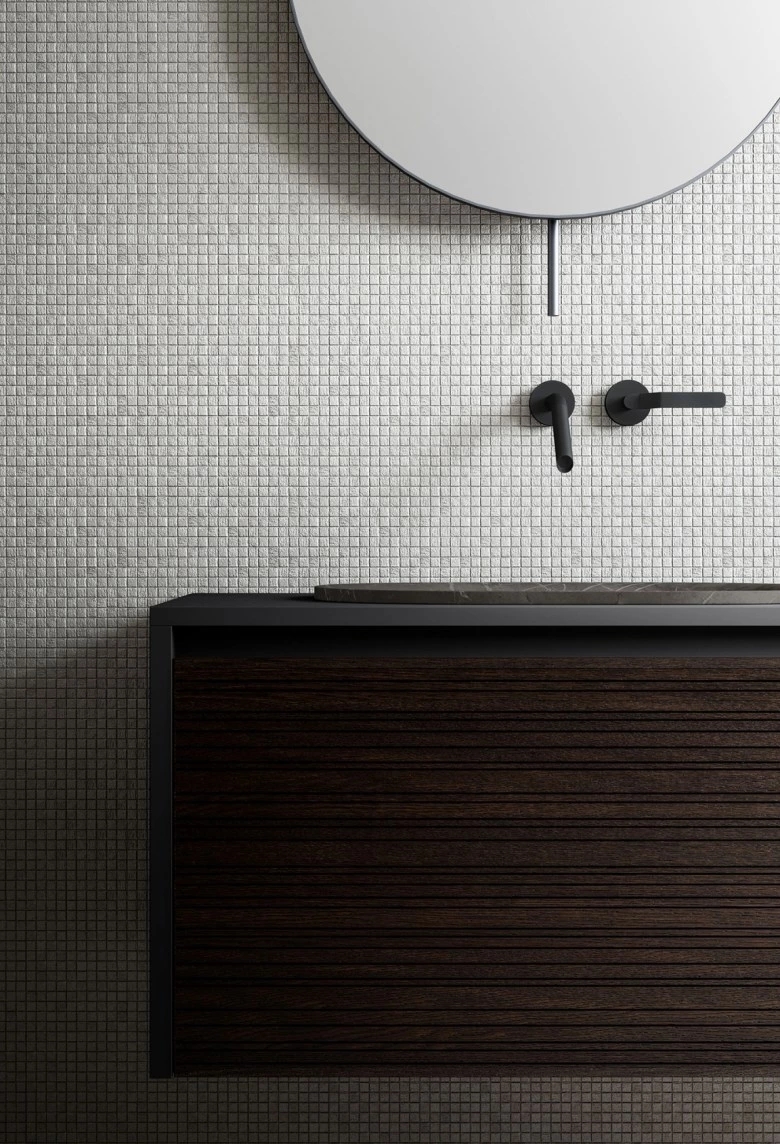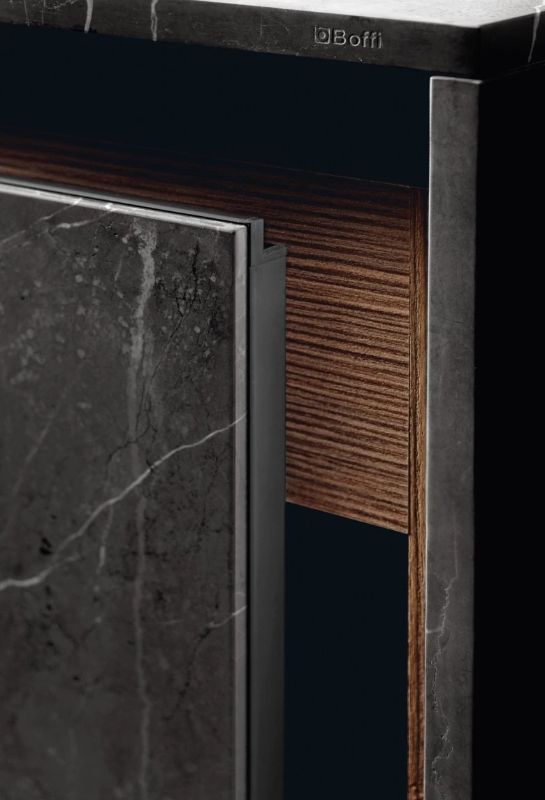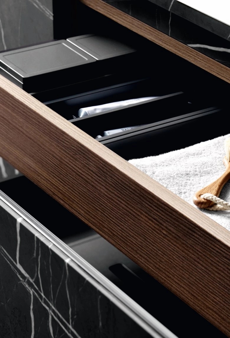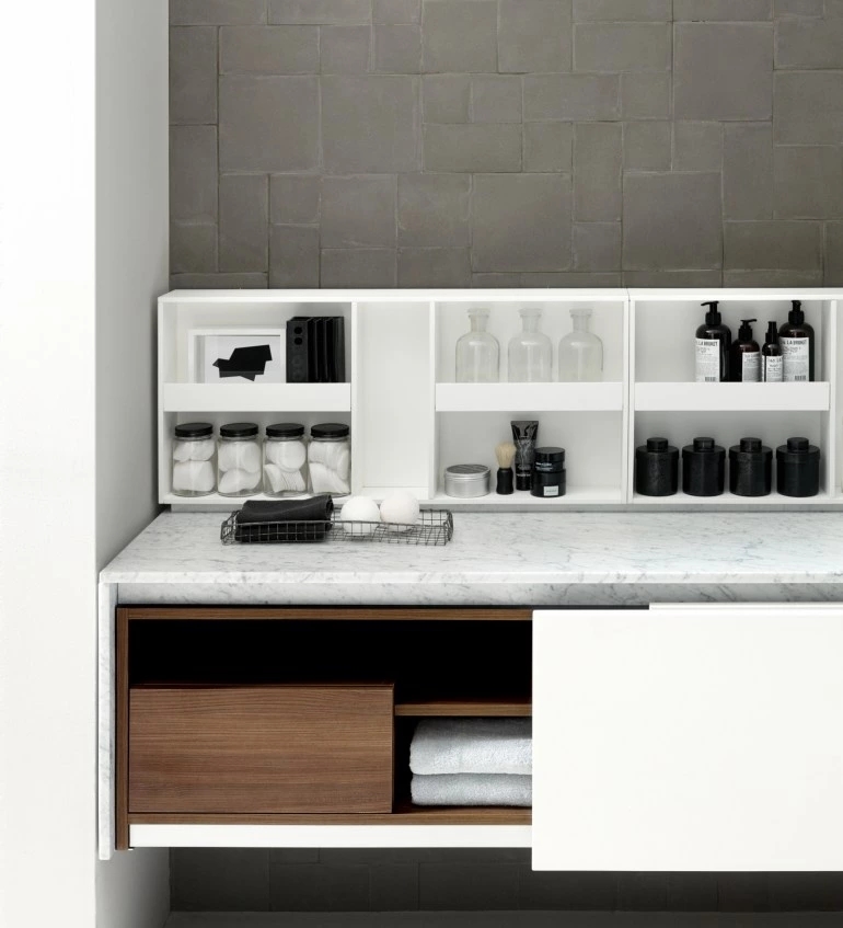 Wall hung, modular units with handle-less fronts and three different door opening methods: hinged, pull-out or coplanar sliding. The doors are gripped (and opened) through the specific handle-rail, mounted on the upper part of the cabinet. The aluminium handle-rail can be covered in the same finish as the top or the front to give a single-material look to the composition. Free Zone offers a wide range of composition possibilities, starting from the types of compatible washbasins with the square-edged top: top-mounted, built-in, under-mounted or moulded flush-mounted. A wall hung tall unit with door completes this bathroom collection. For the materials of tops, panels, fronts and doors, the choice ranges from all Boffi collections, from lacquers to woods, from stones to composites, from glass to metals. Among the latest novelties, it is possible to use the composite MDI and the solid wood finishes Freehand (characterized by irregular horizontal furrows and horizontal grain) and Shades (characterized by regular vertical furrows and vertical grain). Design C.R.S. Boffi.