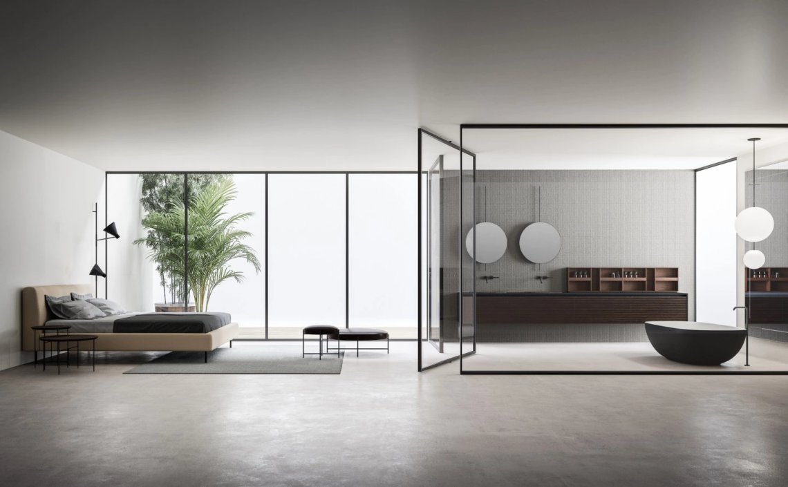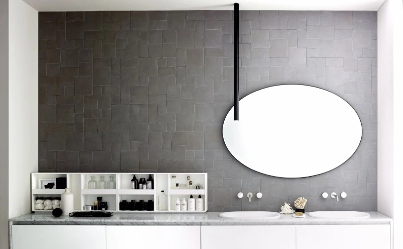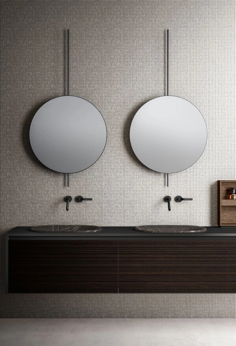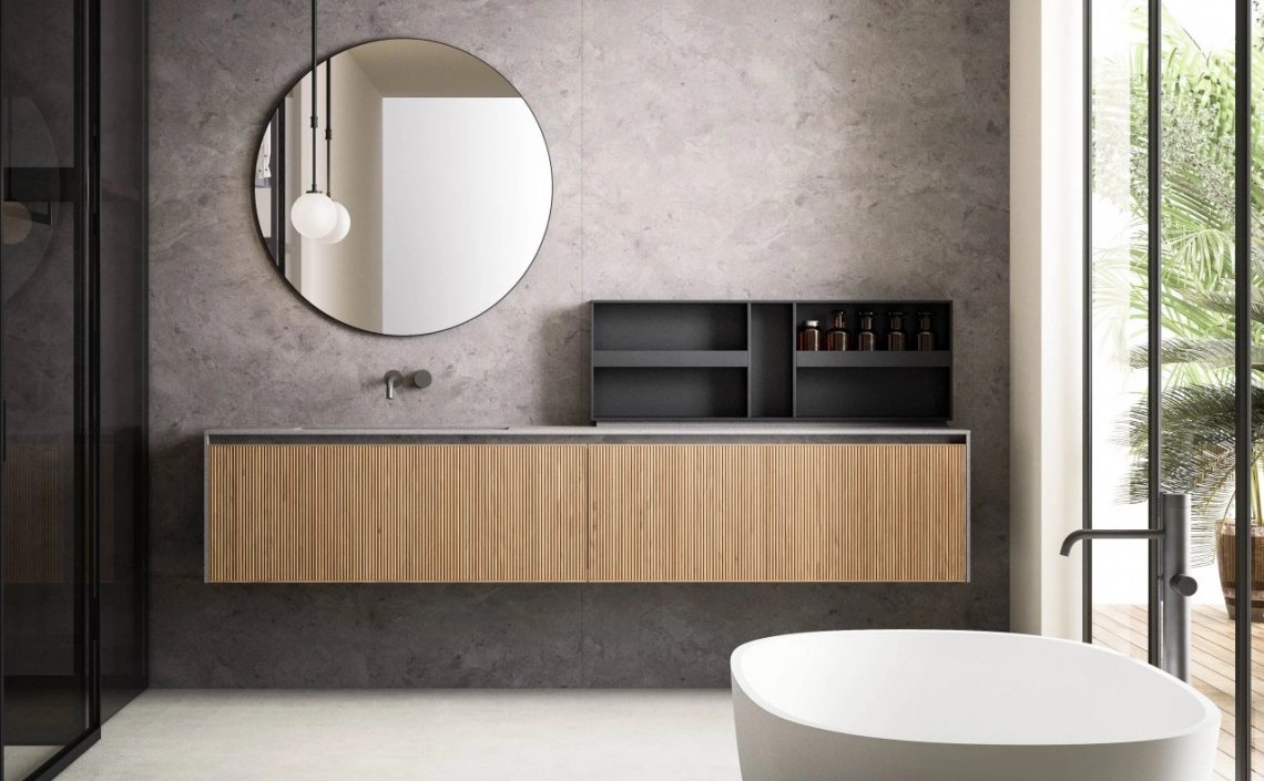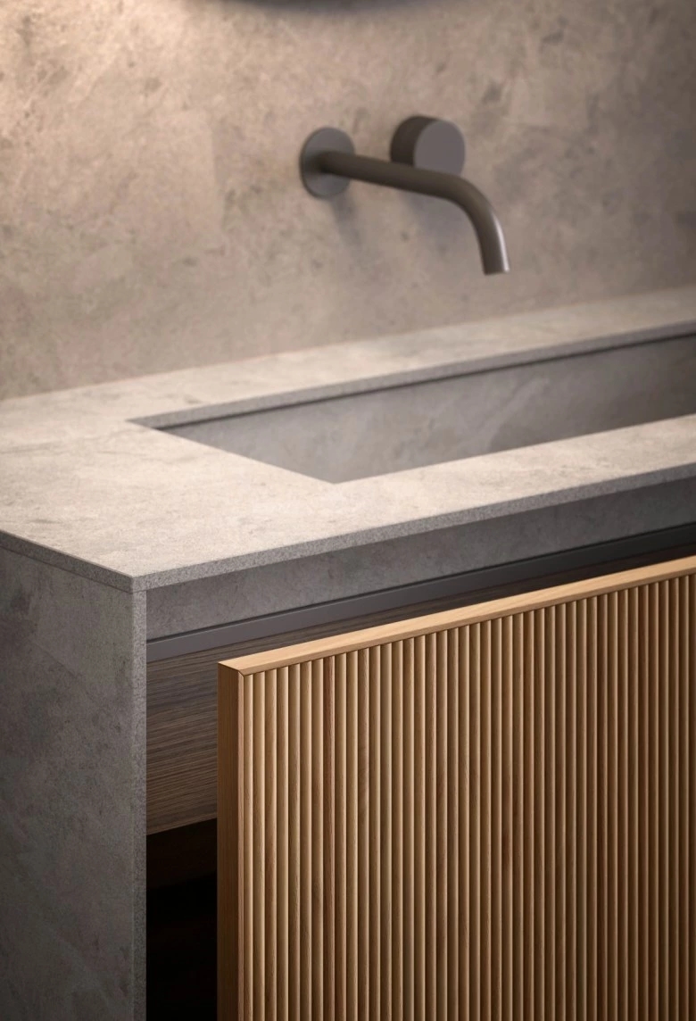 Wall hung, modular units with handle-less fronts and three different door opening methods: hinged, pull-out or coplanar sliding. The doors are gripped (and opened) through the specific handle-rail, mounted on the upper part of the cabinet. The aluminium handle-rail can be covered in the same finish as the top or the front to give a single-material look to the composition. Free Zone offers a wide range of composition possibilities, starting from the types of compatible washbasins with the square-edged top: top-mounted, built-in, under-mounted or moulded flush-mounted. A wall hung tall unit with door completes this bathroom collection. For the materials of tops, panels, fronts and doors, the choice ranges from all Boffi collections, from lacquers to woods, from stones to composites, from glass to metals. Among the latest novelties, it is possible to use the composite MDI and the solid wood finishes Freehand (characterized by irregular horizontal furrows and horizontal grain) and Shades (characterized by regular vertical furrows and vertical grain). Design C.R.S. Boffi.