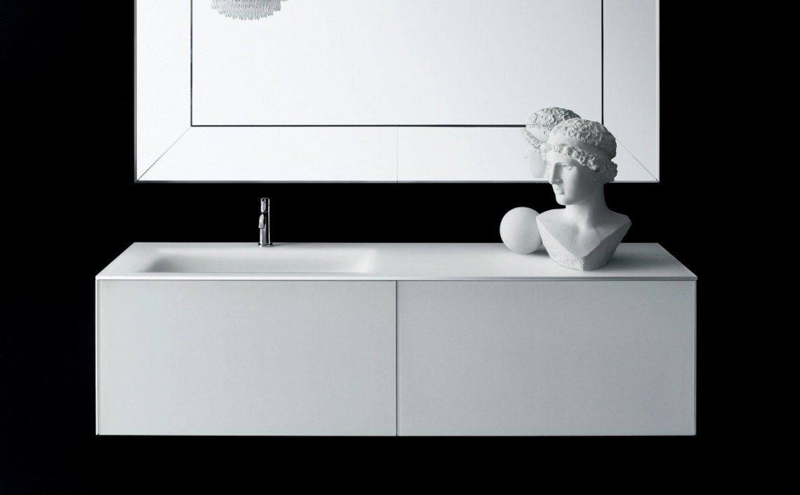 Wall hung, modular base units without handles, characterised by extreme formal and essential lines and doors in painted extralight frosted glass. The base units, available in two heights and four widths, have a single front equipped with the automatic Tip-On push-opening mechanism. In the taller version the base unit can contain an additional drawer. The tops are available in ex-tralight frosted or sanded painted glass, in Cristalplant?, in stone, marble and granite, in Dekton? and MDI composite. The compatible washbasins are top-mounted, built-in, under-mounted and moulded flush-mounted. The glass top version has an integrated thermo-formed washbasin with an exclu-sive and sophisticated design. Design Piero Lissoni e C.R.S. Boffi
