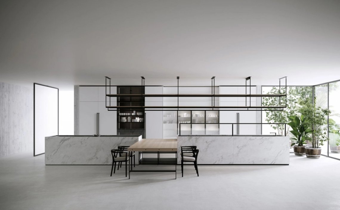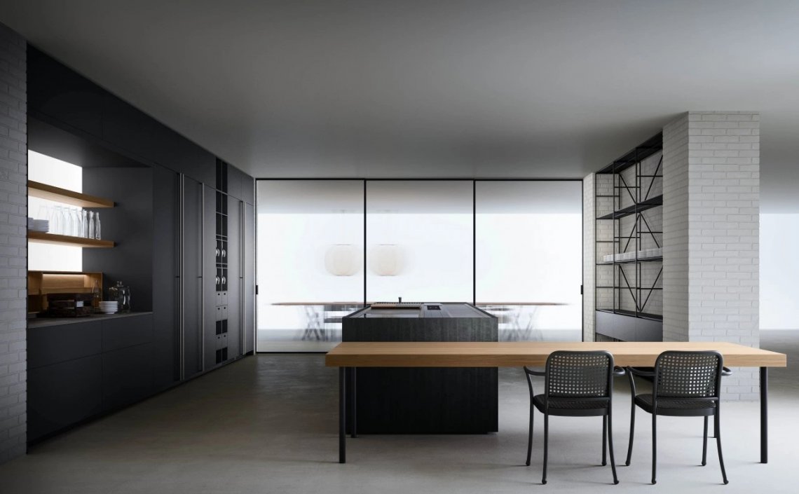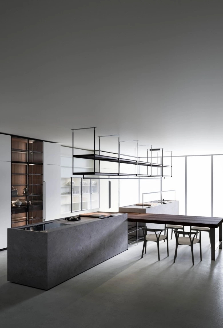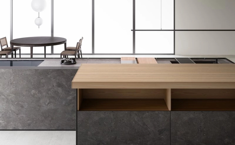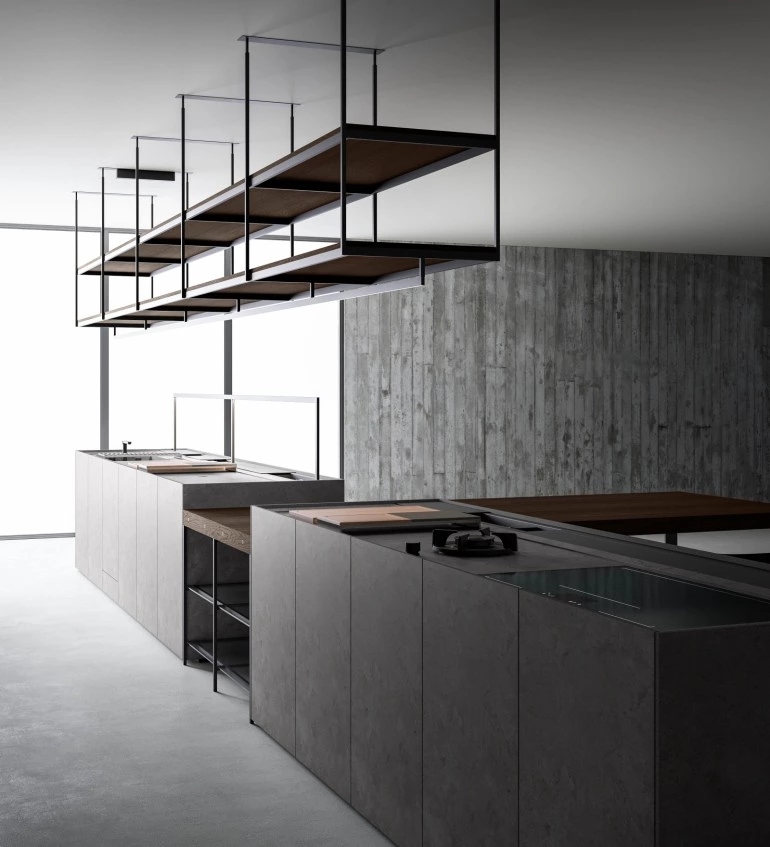 In the Evolution version, the Combine monobloc kitchen is enriched with new solutions, creating more composition possibilities and more function modules. The kitchen blocks for washing and cooking area and the block with preparation/working area are now connected by a metal structure equipped with wooden drawers, housing a big snack table made of solid wood staves. An equipped track for countertops, called Inside System, has been integrated in this kitchen. It is positioned in the back of cooking and washing areas, equipped with some sliding lids that cover storage compartments fitted with accessories of Inside series, such as cutlery trays, knives holders, spice holders, oil bottle holder, electric sets with hidden sockets. In addition to the totally integrated downdraft hood, the worktops house an elegant long hanging bar for ladles or other accessories, equipped with LED lighting. The higher doors than standard (+2 cm), make the monobloc kitchen even more sophisticated and monolithic. The surfaces and doors are available in the new composite MDI: a high-performance material, made of high-purity minerals soft to the touch and feasible in the two exclusive colours Devon (light grey) and Surrey (dark grey). This composite is hygienic and nontoxic, highly resistant, made of recycled materials, so totally ecological. Combine Evolution furnishes the environments, offering lots of compositional, functional and material possibilities to create a complete, sophisticated and contemporary kitchen system.