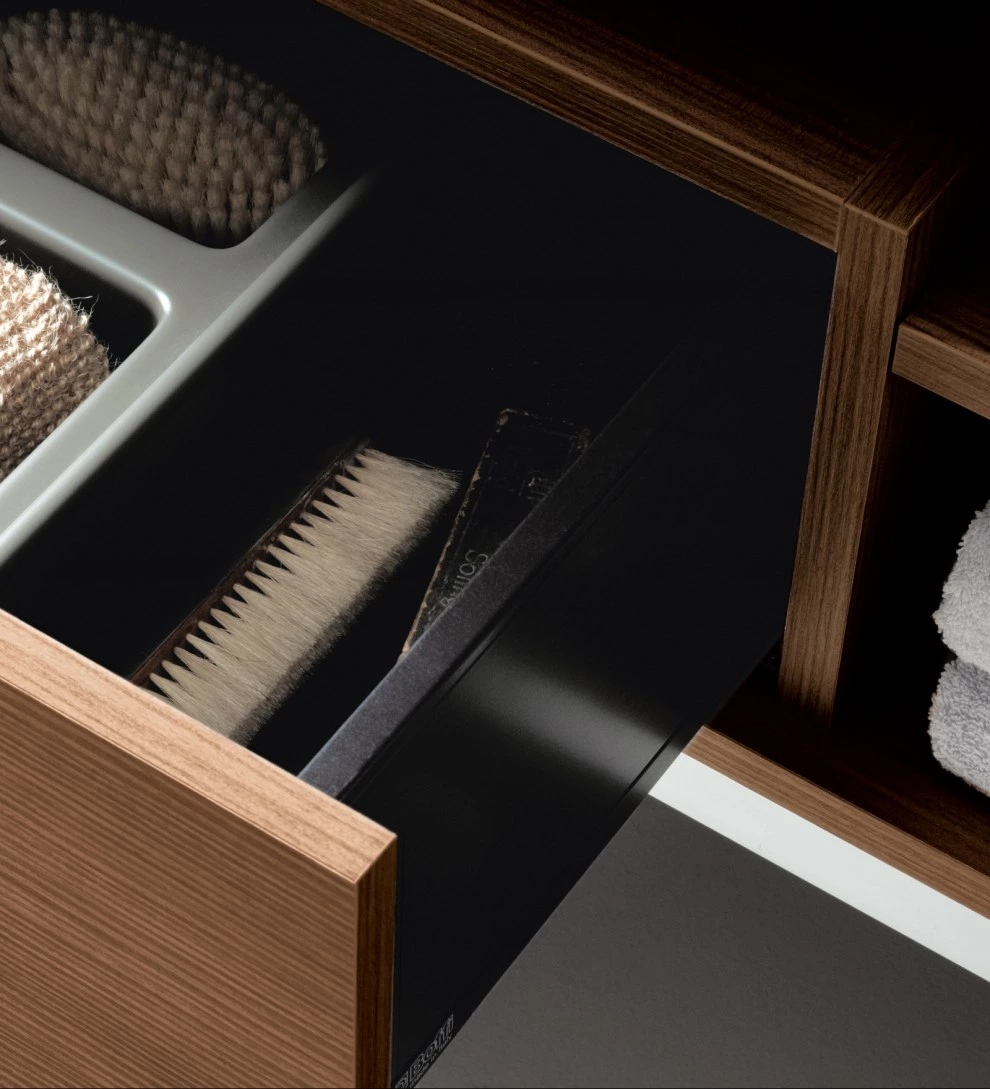 The bathroom system is now enhanced with a choice of combinations of elements, materials, colours and finishes , yet retaining its distinctive opening with coplanar sliding doors, pull-out or hinged.