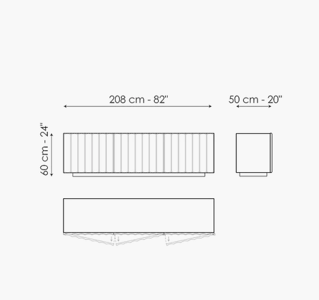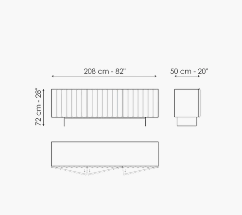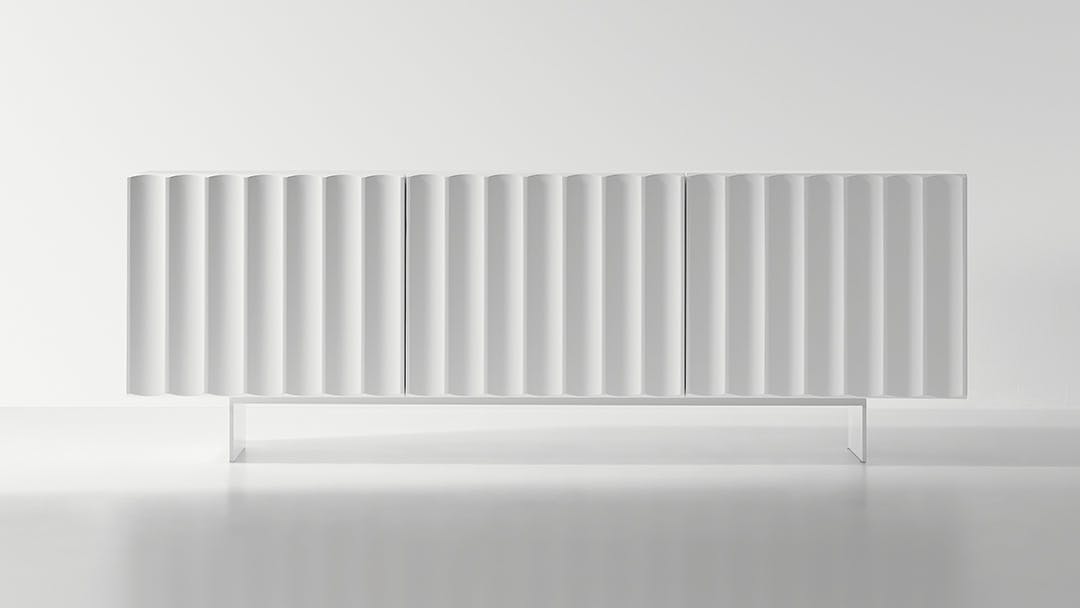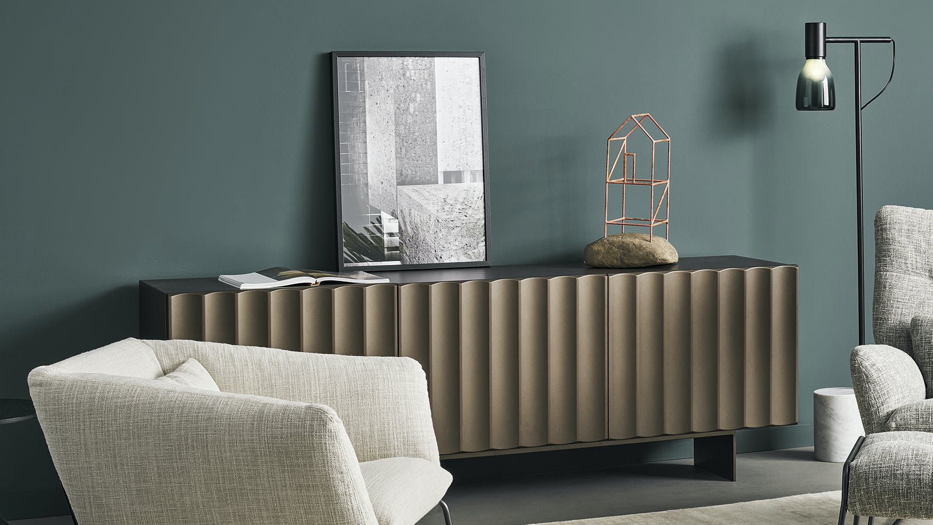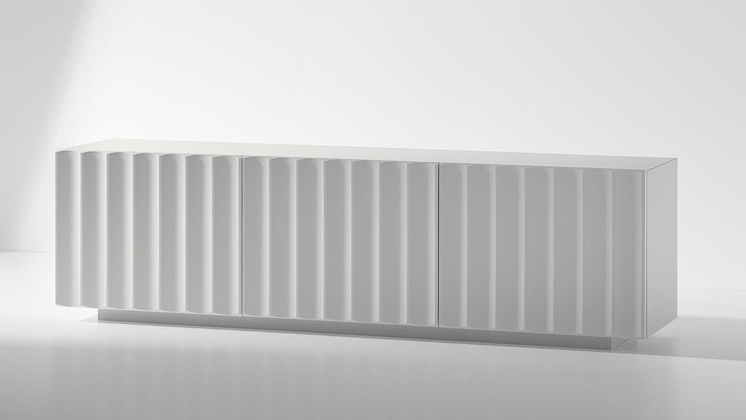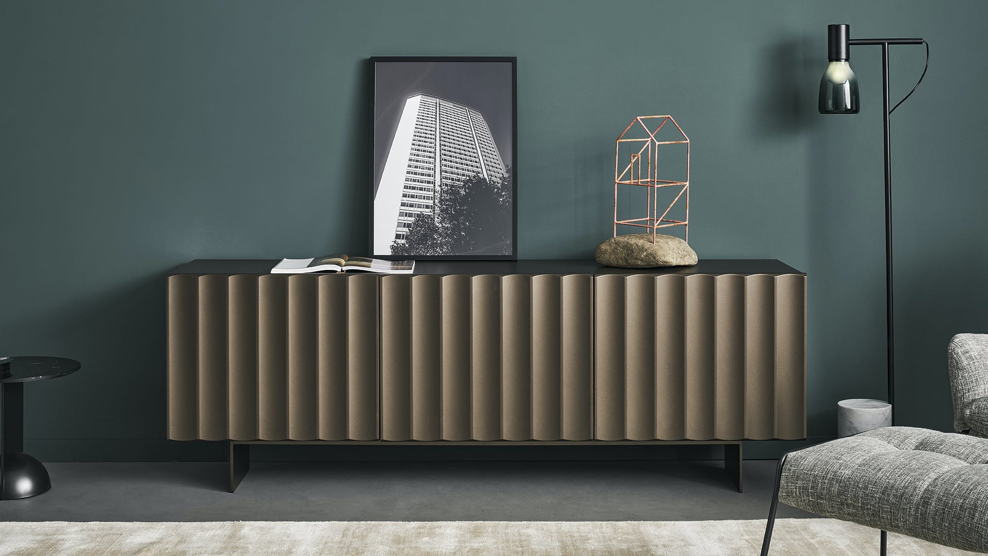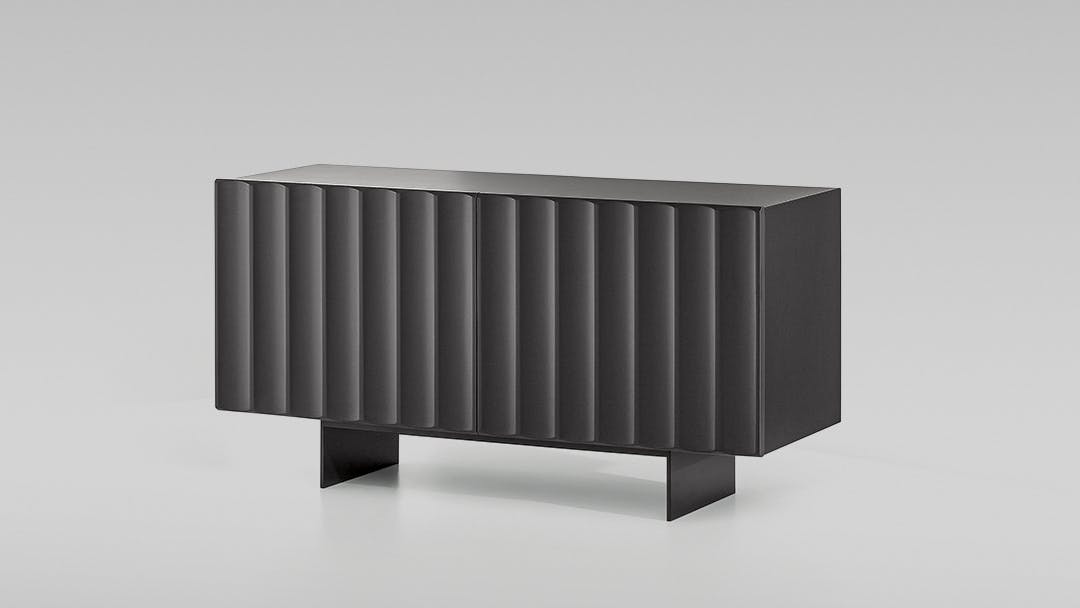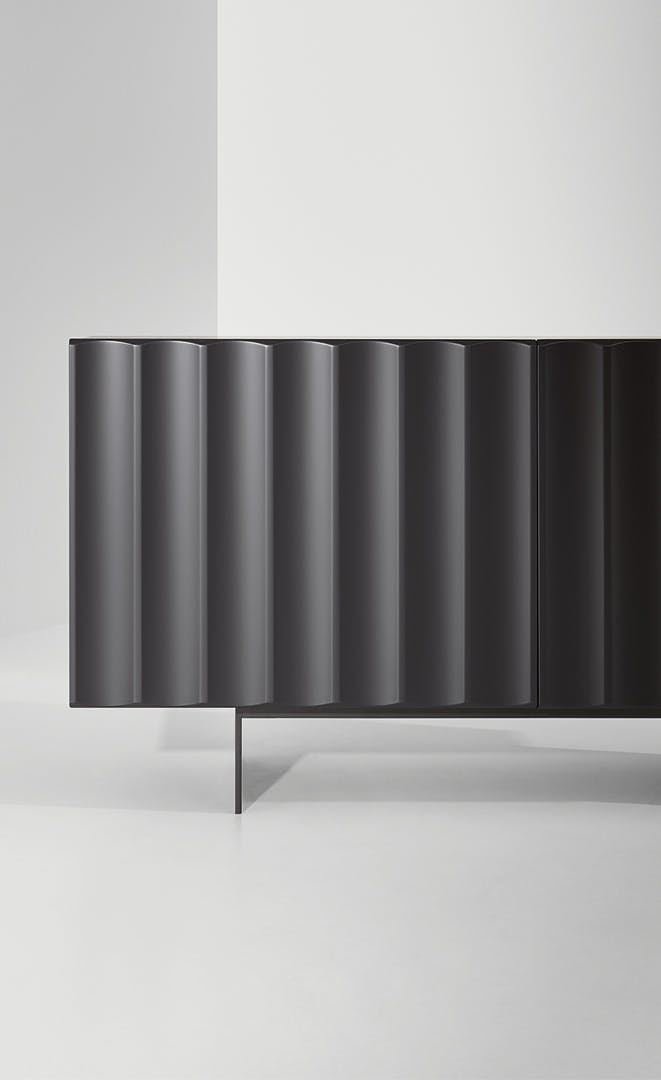 The signature feature of the Dorian contemporary sideboard is the wide vertical groove highlighted in its doors. The sense of movement thus created by the doors of the Dorian sideboard breaks up the linearity of the wall on which it rests, thus adding visual appeal to the intrinsic function of the sideboard. The doors and frame of this sideboard are made of wood, a material which adds elegance to the overall look, painted in white, bronze or lead finishes. The base is available in the version with two feet for a lighter visual effect or in the version with a plinth for a more compact look.