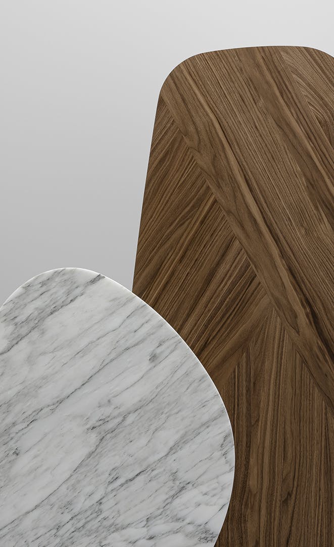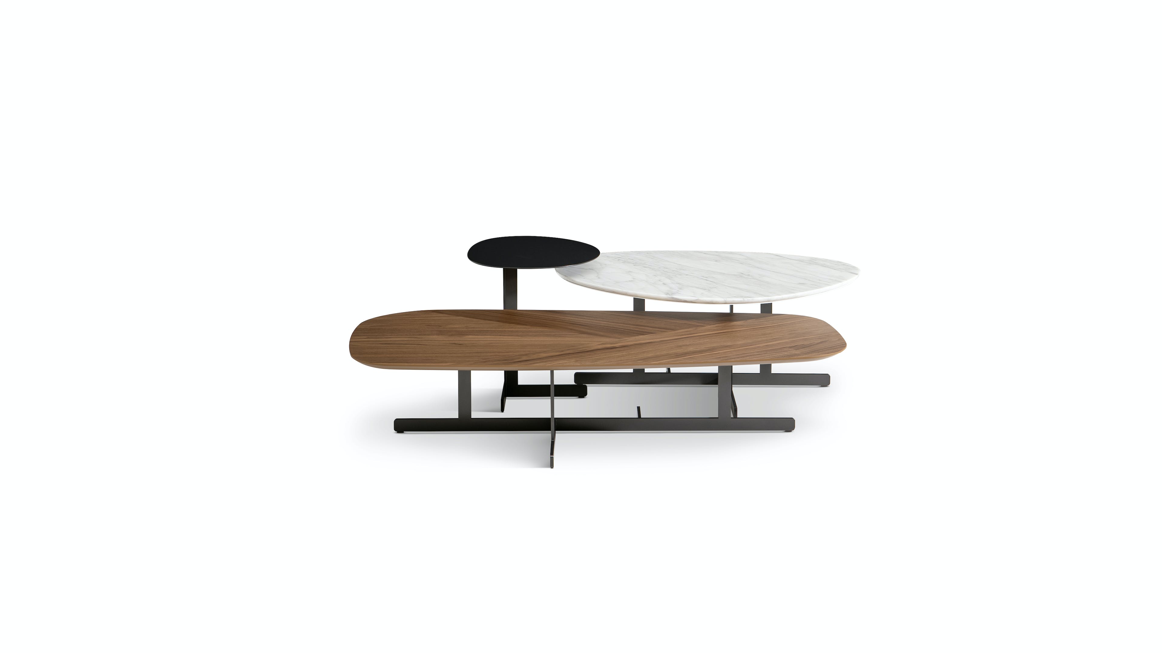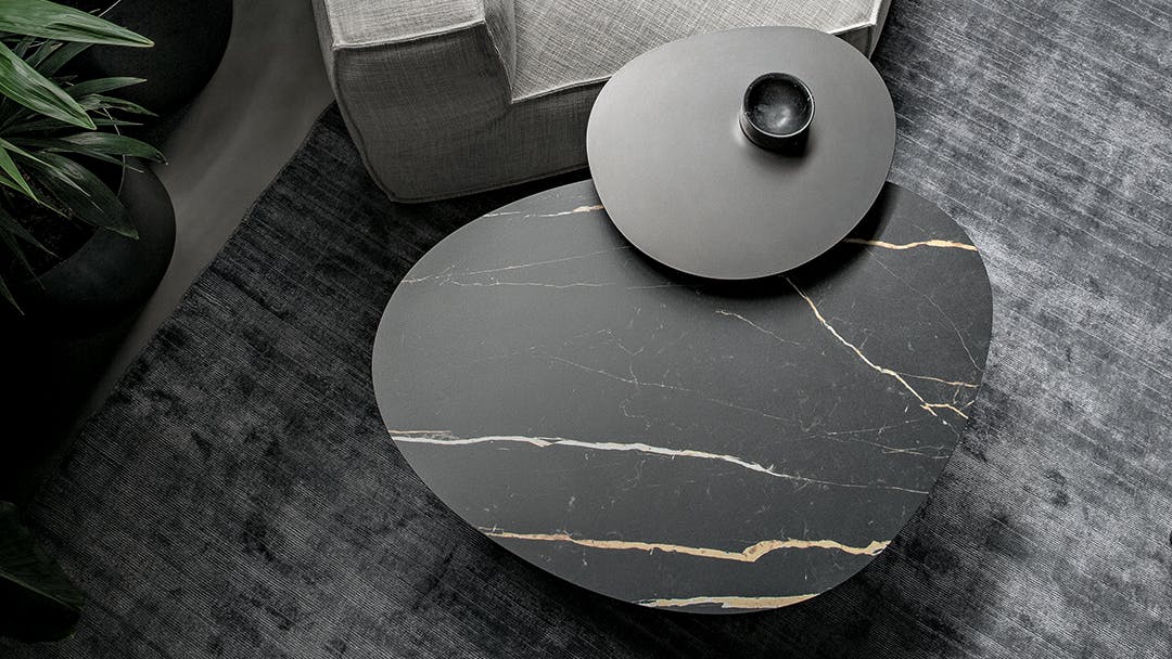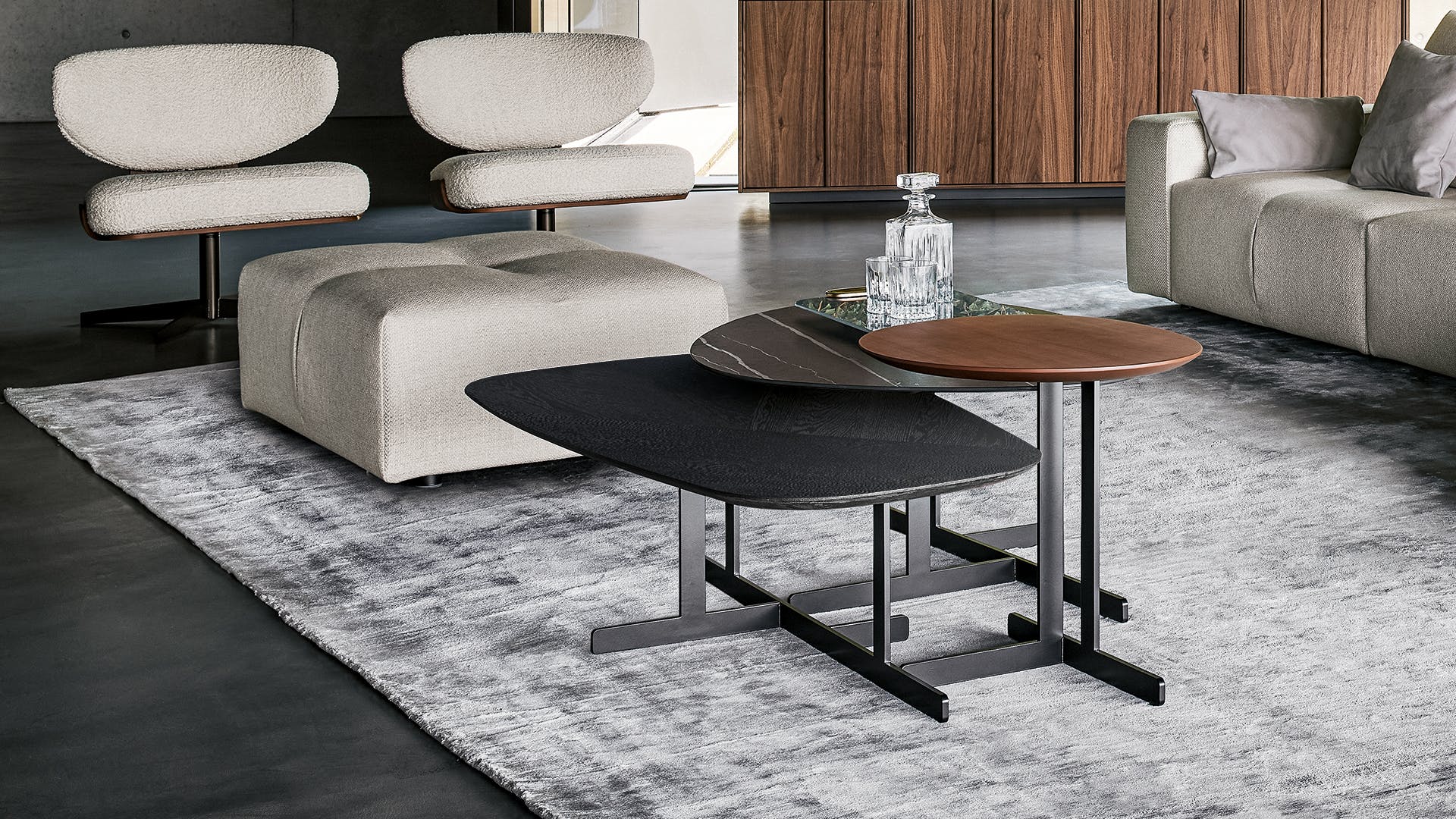 To create these sets of modern nesting coffee tables, architect Mauro Lipparini focused on a minimalist design and combined the bold geometric shape of the metal support with the curved contours of the tops, available in a variety of finishes, creating a formal contrast expressed with the utmost lightness. They are perfect either positioned in the middle of the room or to the side of the sofa.
