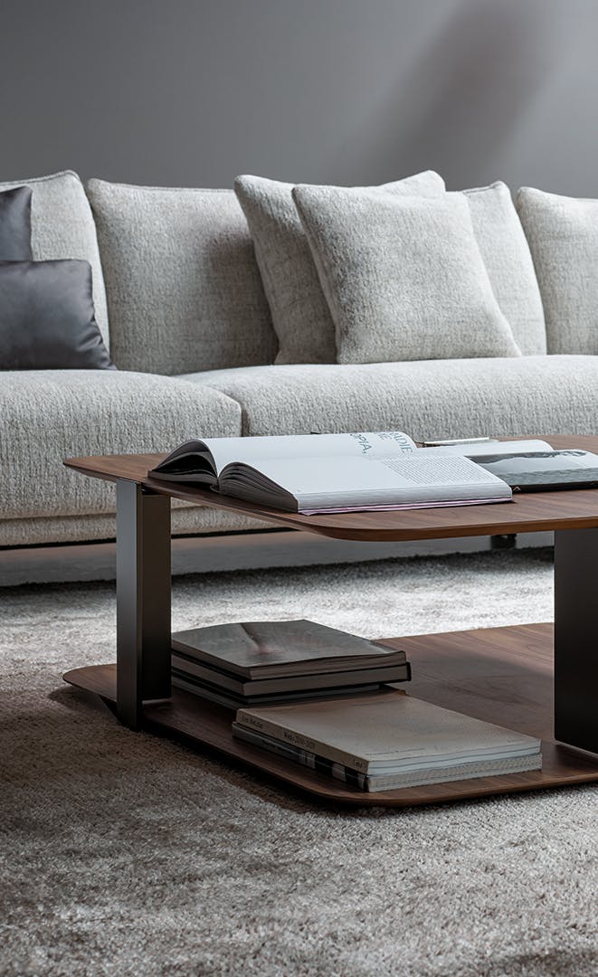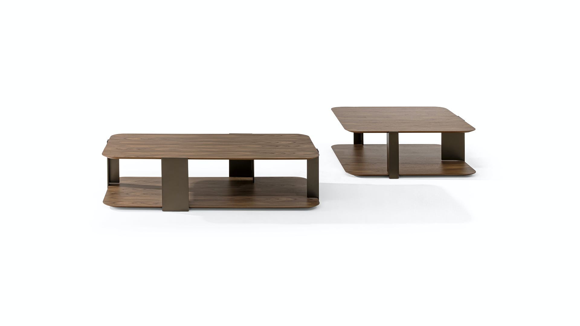 With shapes inspired by the typical sports paddle to which it is an explicit tribute, Paddle is a collection of tables by Mauro Lipparini with a light and linear design. Available with two table tops (in Canaletto walnut or coal oak), the coffee tables are completed by a load-bearing structure in bronze or lead painted metal. The modern wooden coffee tables are distinguished by the clear-cut shapes of the tops and profiles and softened by the rounded edges. Arranged individually or in combination with other elements, they offer ample possibilities for insertion in the most disparate domestic and hospitality spaces.