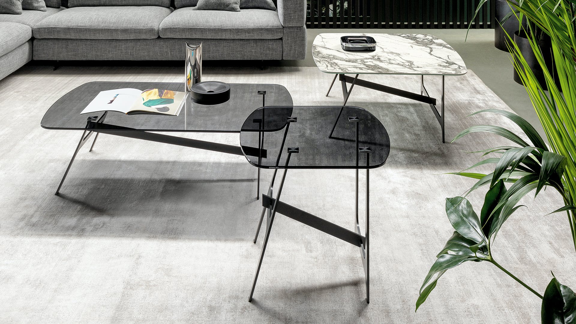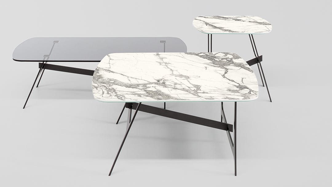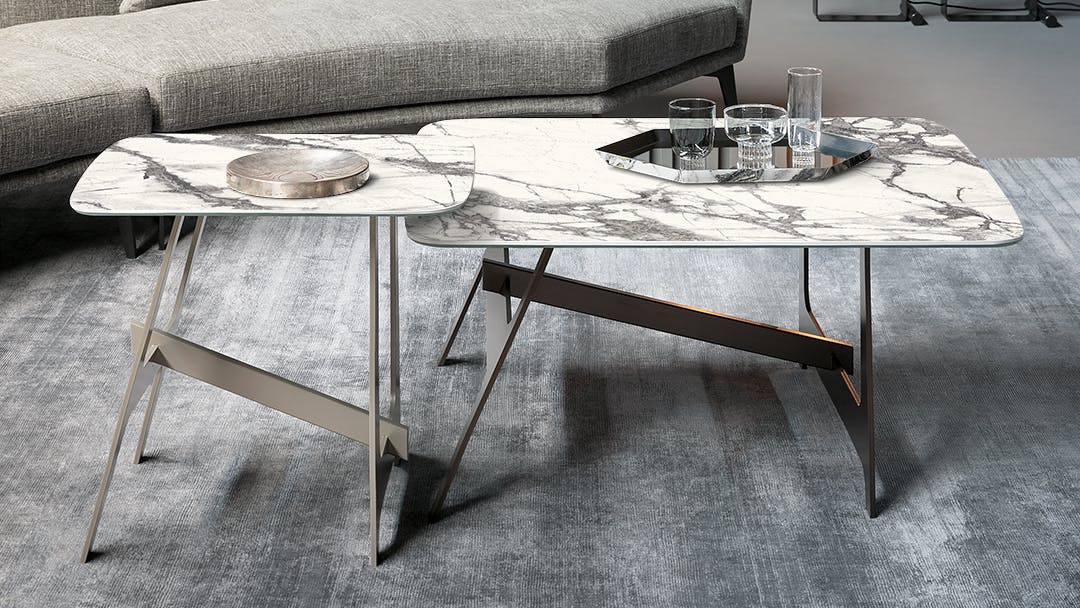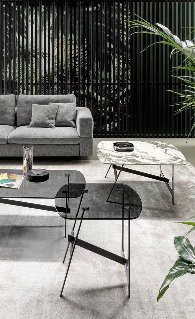 For this collection, designer Giuseppe Viganò has drawn inspiration from the world of geometry, from which he has borrowed different shapes and harmonized them in a single design. The collection of living room sofa side tables plays with minimal shapes expressed in space: the horizontal top is supported by two stands with a characteristic H shape, one vertical and one slanted, united by a transverse element that conveys a sensation of movement. The legs and central stem are made of metal, while the top with rounded corners is available in numerous ceramic and crystal finishes, creating combinations of materials that are always different and can respond to any furnishing and style requirement.