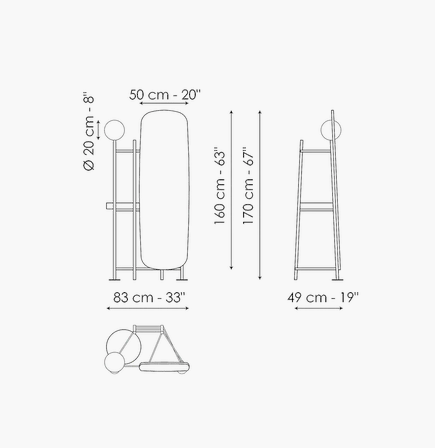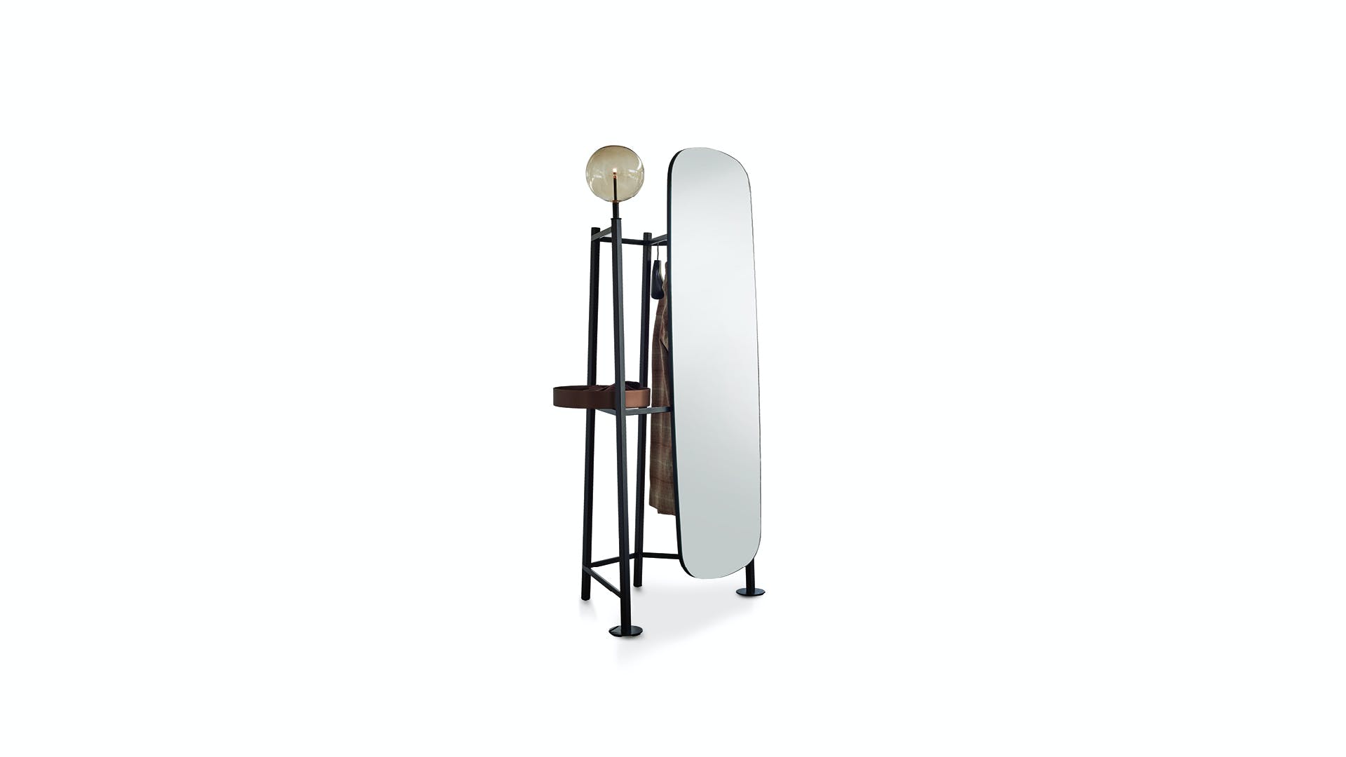 Perfect in its dynamic as a holder, every detail of the Salomé clothes valet stand contributes to the overall balance. Its design consists of delicate geometric shapes marked by precise vertical signs in which the luminous patterns of the transparent globe seem to dance with mirrored re?ections. Lights, lines and materials as fundamental features of an object destined to perform a daily service that becomes an emblem of an intimate relationship with the sleeping area: the beauty of the Salomé bedroom valet stand lies in the charm of the harmony between the forms and the intensity of its presence, a strongly scenographic design. The Salomé valet stand comes with a metal frame and tray in different finishes. A version with lampshade is also available.