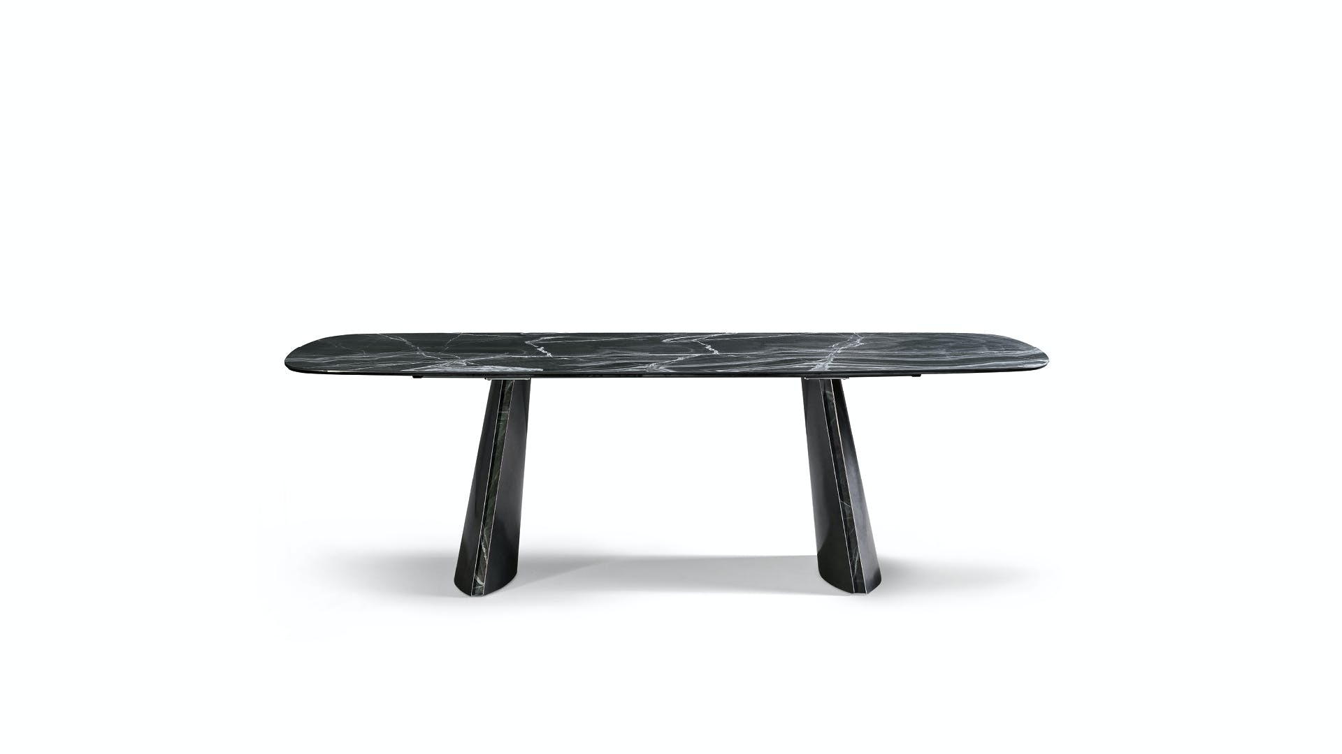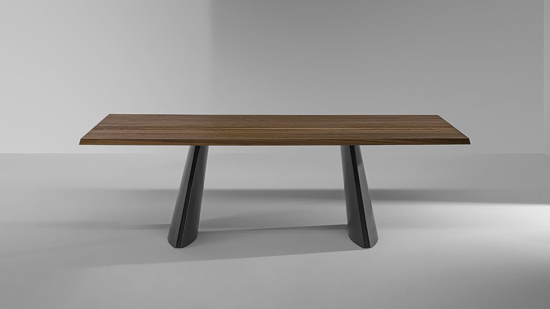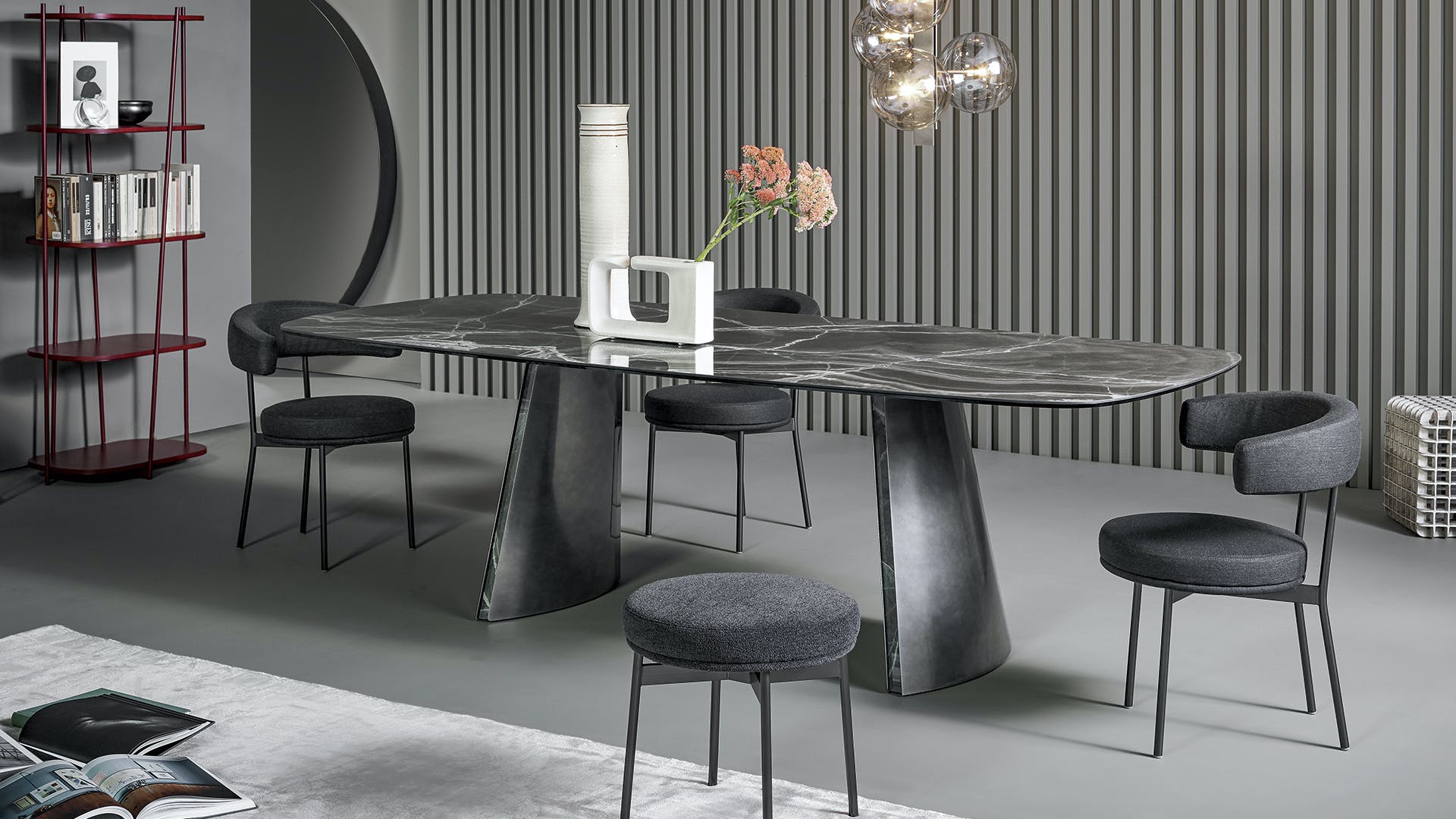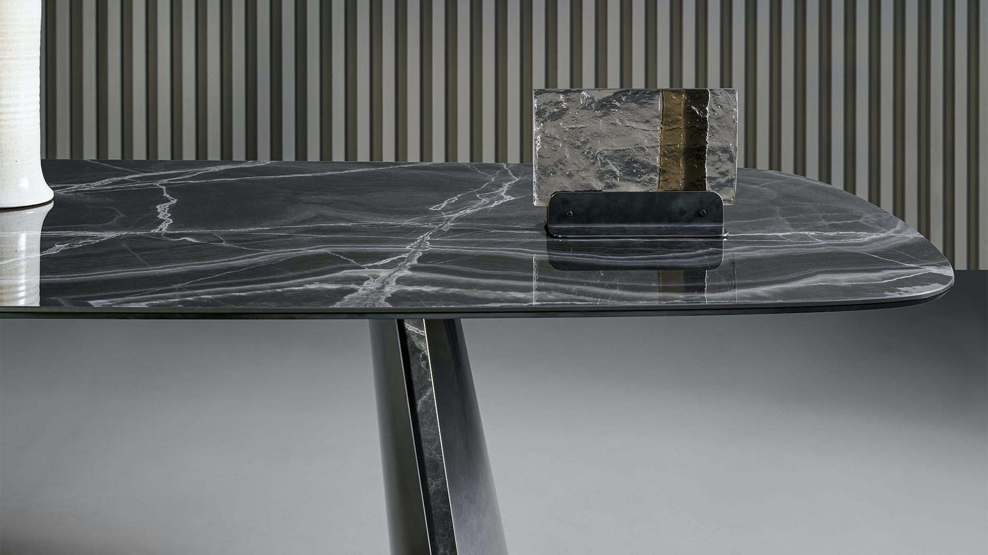 Inspired by the architecture of traditional Japanese Shinto temples, which give rise to the name “Torii”, it stands out on account of the “tectonic” qualities of the base, composed of two slightly inclined metal elements. The elegant design is completed by the rigorous top which is available in wood, ceramic or marble. The formal qualities of this elegant dining table designed by Marconato & Zappa emerge forcefully in the version which offers a single-material finish both for the top and the decorative inserts of the legs.
