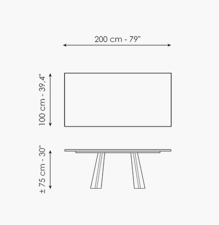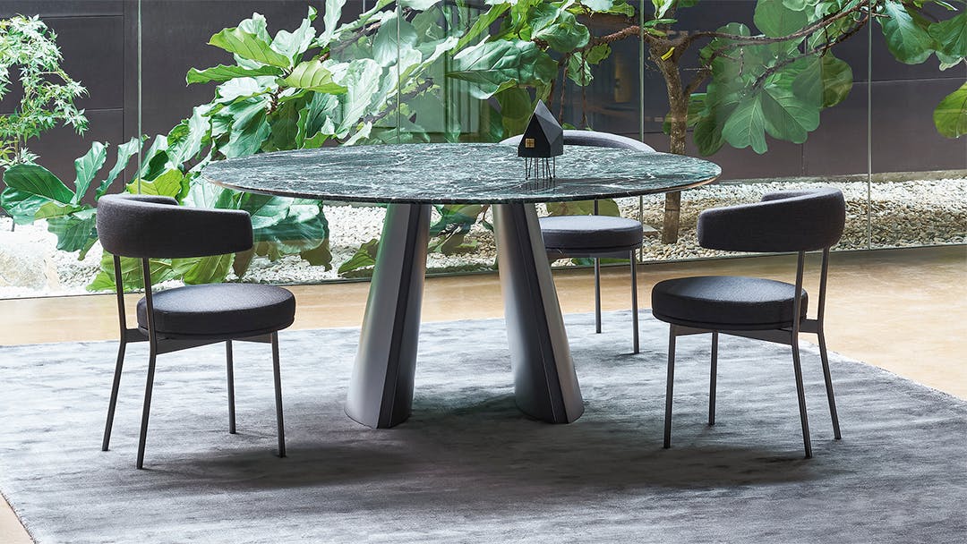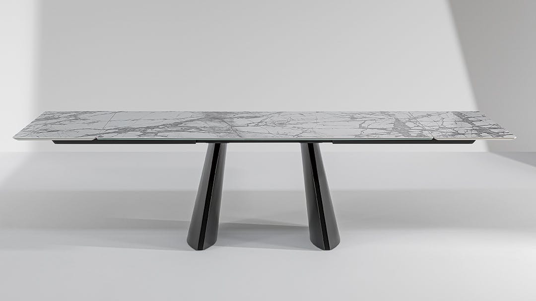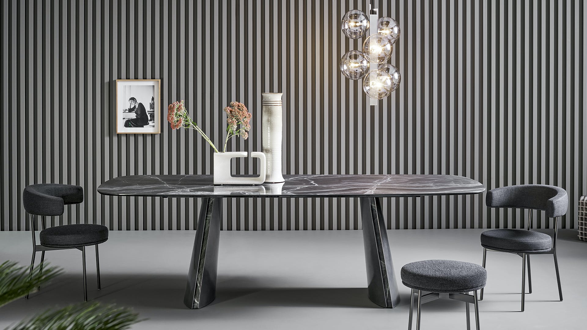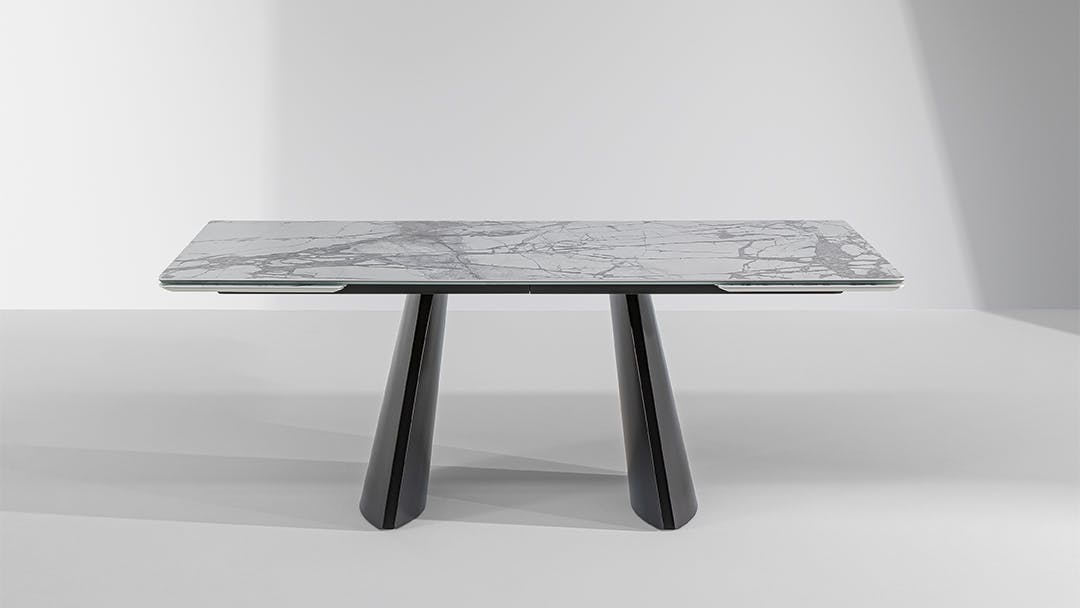 Inspired by the architecture of traditional Japanese Shinto temples, which give rise to the name “Torii”, it stands out on account of the “tectonic” qualities of the base, composed of two slightly inclined metal elements. The elegant design is completed by the rigorous top which is available in wood, ceramic or marble. The formal qualities of this elegant dining table designed by Marconato & Zappa emerge forcefully in the version which offers a single-material finish both for the top and the decorative inserts of the legs.