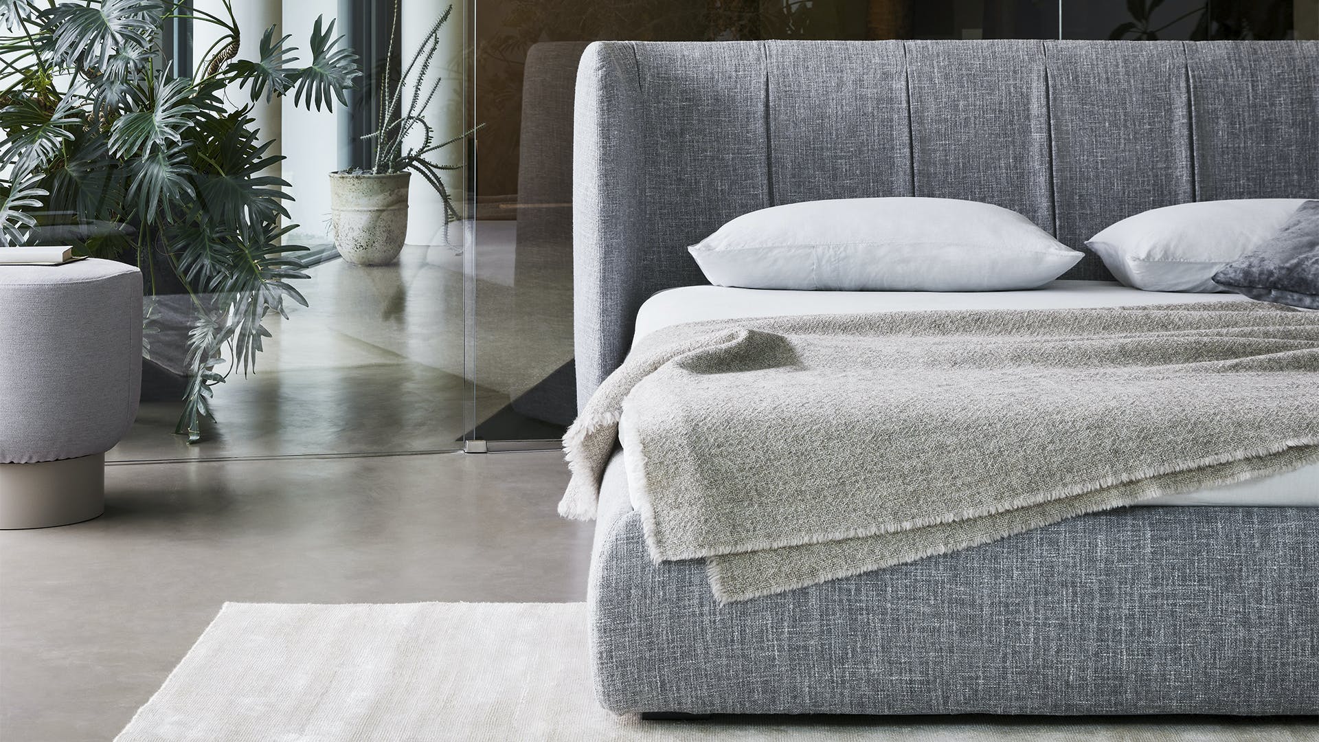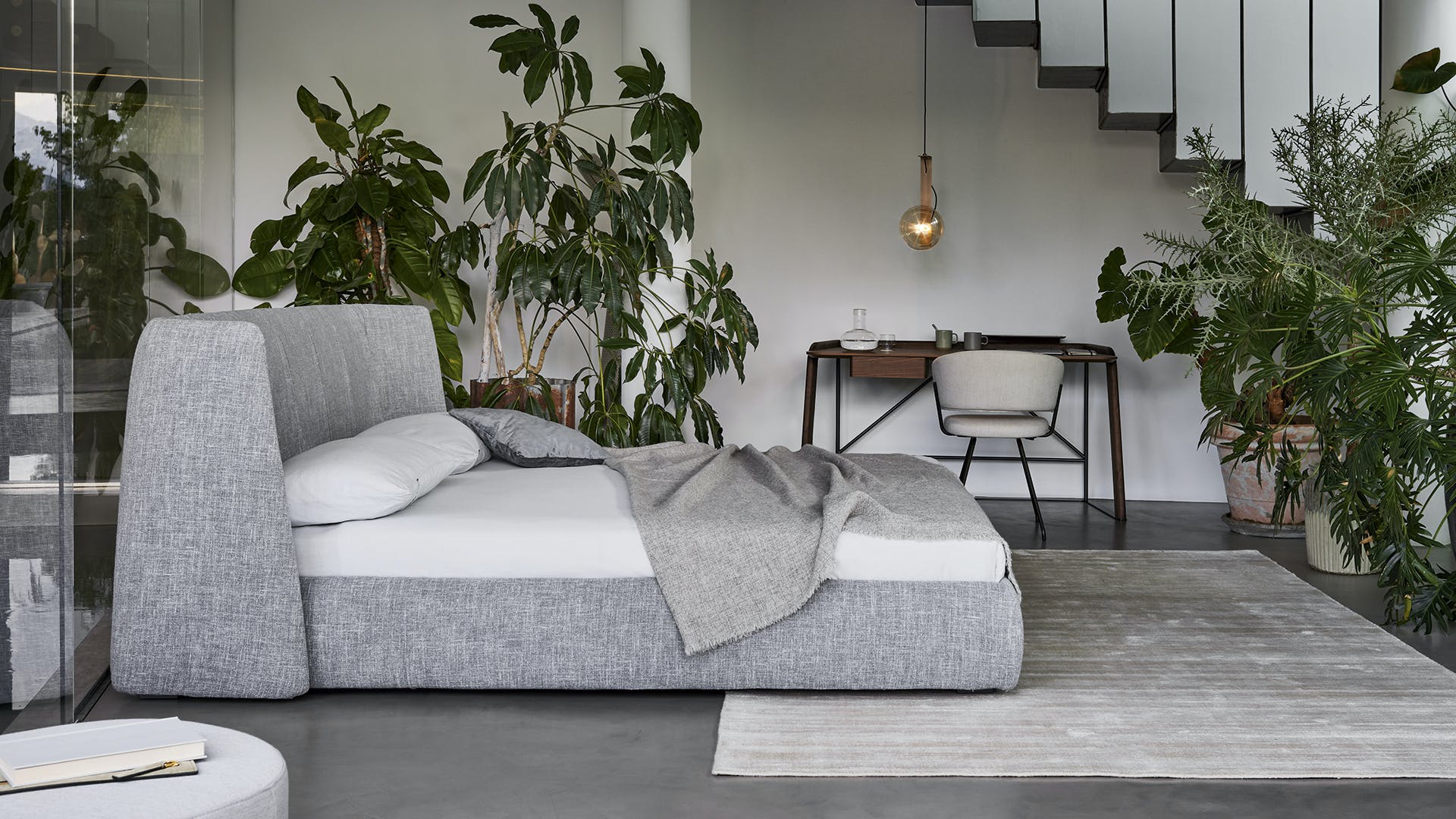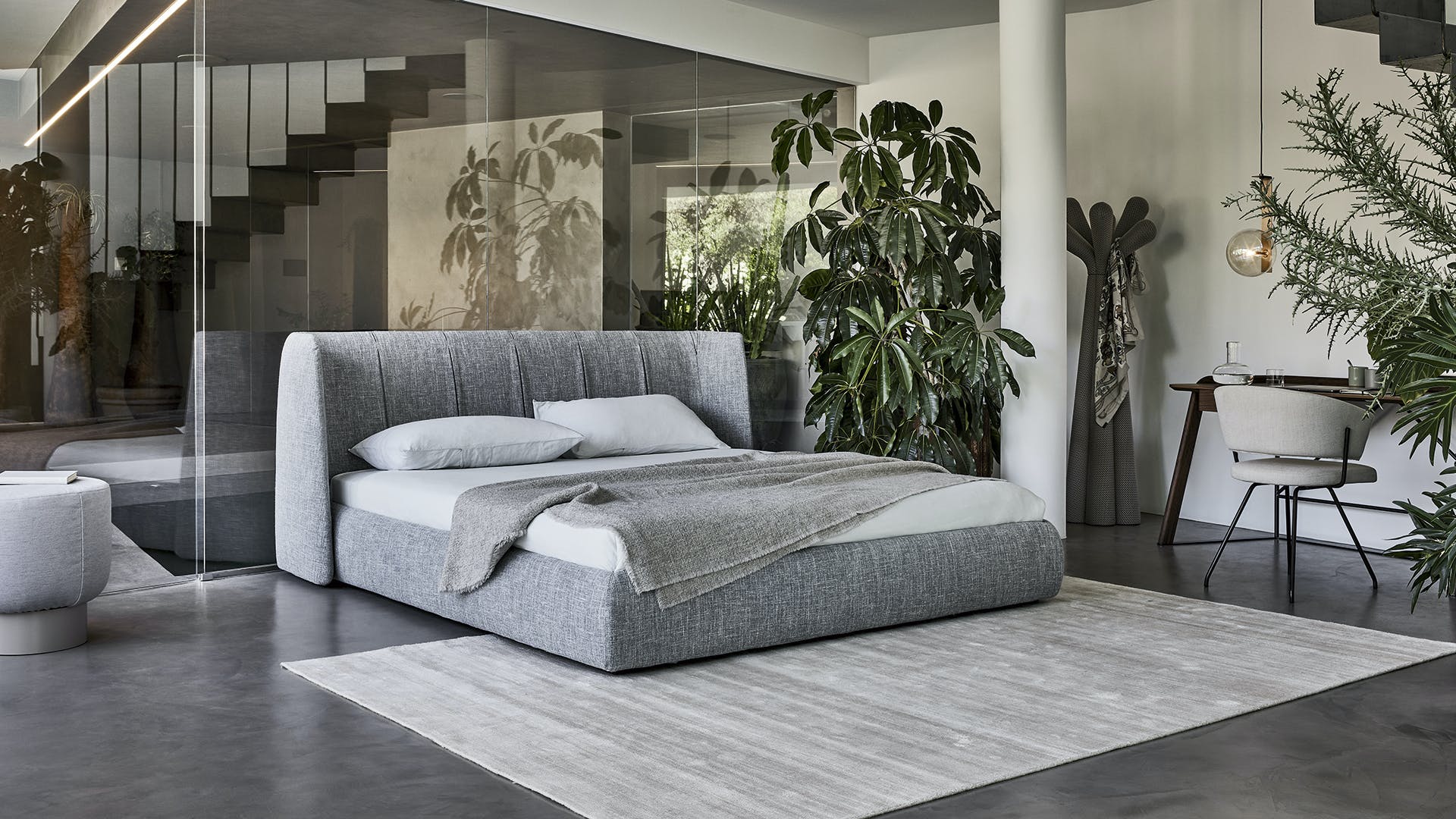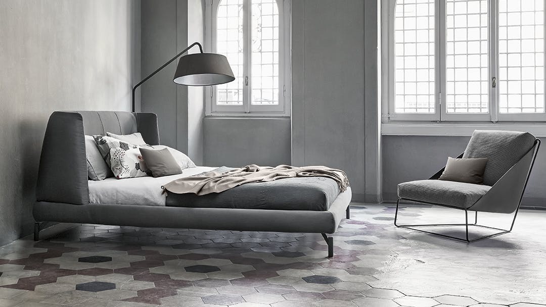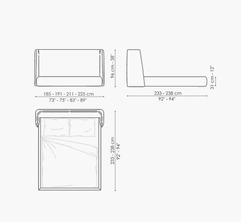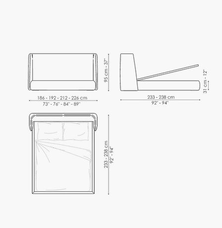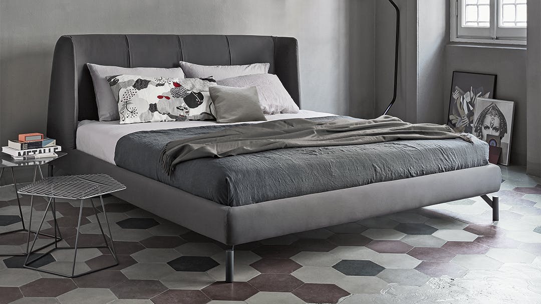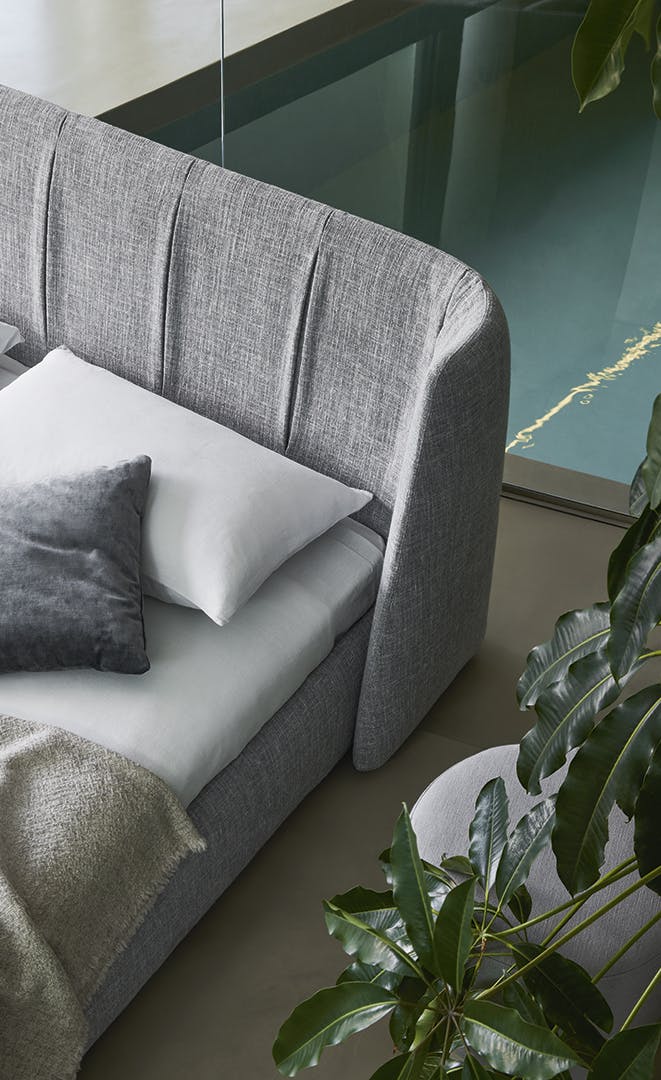 The Basket unique bed headboard has been designed by calibrating large shapes with soft, enveloping lines. This double bed is covered in fabric, leather or eco-leather, completely removable. There are many variations to the design: in addition to Basket, there is the Basket plus model, featuring sophisticated tucks on the headboard; Basket high, which displays the sophistication of the volumes, thanks to the more imposing headboard; Basket air, whose painted metal feet have slender elegant lines and the Basket air plus, with metal feet and headboard embellished with tucks. The Basket, Basket plus and Basket high are also made in the “open” version: the practical unit provides valuable additional space for storing covers, cushions and everything necessary for the bedroom.