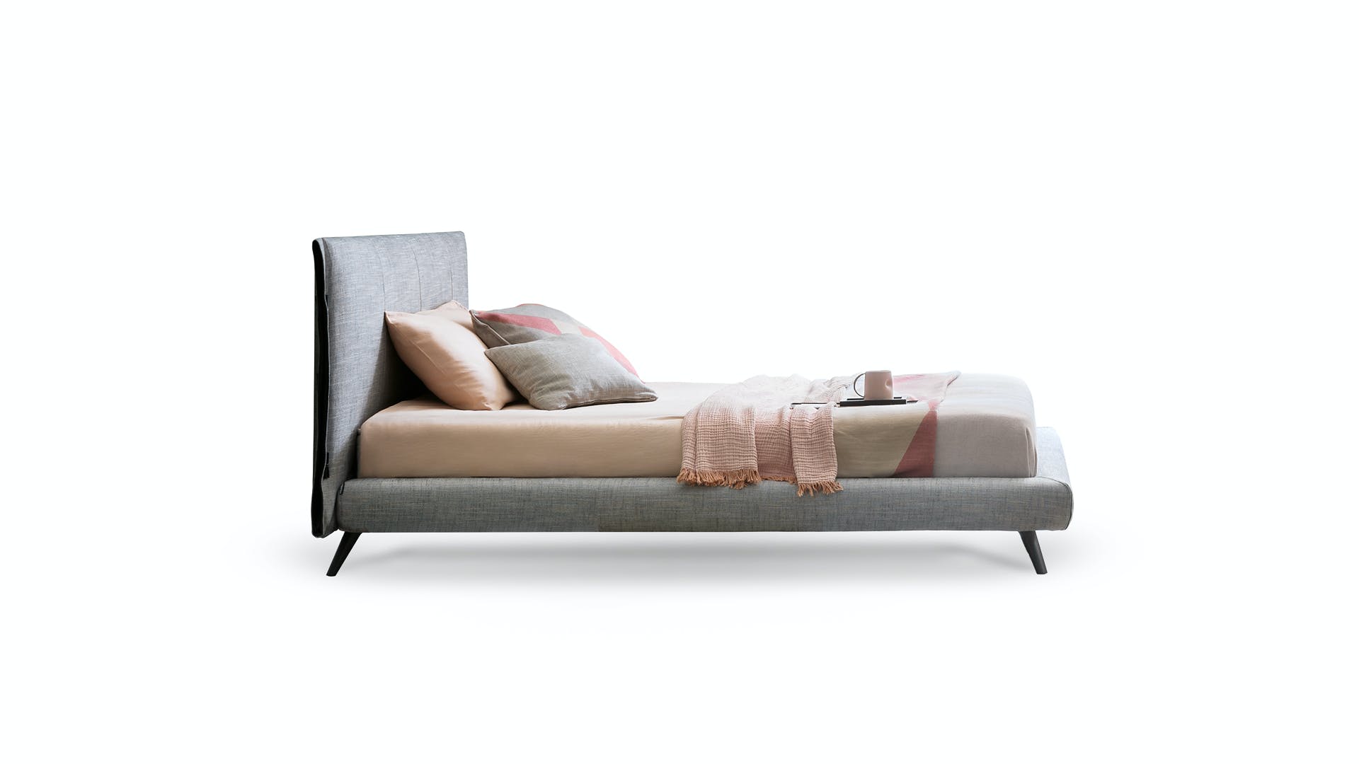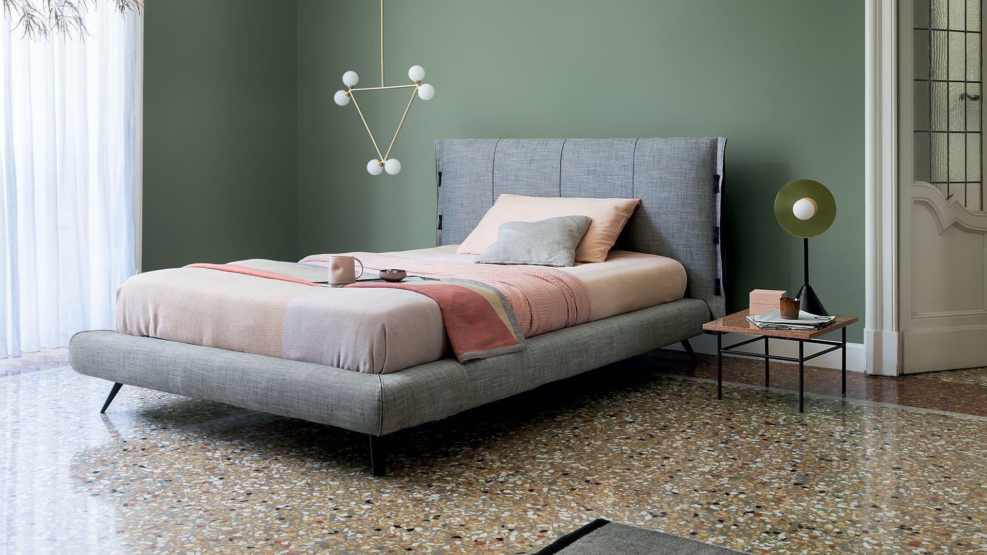 Available in double or single versions,Cuff is a bed made elegant by the exquisite details that characterize it: from the frog fastenings that adorn the two flaps which cover the padded headboard, to the pleating that runs vertically and the leather inserts that also enrich the modern single bed. Available with completely removable cover in fabric, leather or eco-leather, the Cuff modern single bed is produced in various versions: with feet in painted metal (Cuff), higher headboard (Cuff hi), thicker bed frame, low feet in painted wood and low (Cuff plus) or high (Cuff hi plus) headboard. In the versions with storage (Cuff open and Cuff hi open), valuable additional space is provided for storing covers, cushions and everything necessary for the bedroom.