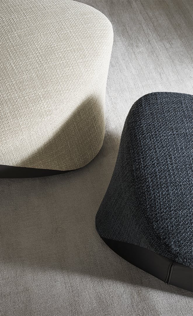 The Seki modern floor poufs, reminiscent of stones polished by the wind and rain, create a sculptural, eye-catching shape which fits seamlessly into any space. Due to the absence of edges and right angles their seemingly irregular frame takes on different shapes depending on the angle from which they are observed. The cover, divided in half by a curved line, makes it possible to play with different materials: the lower part, in contact with the floor, recalls the shoreline, while the upper part reproduces the shape and faces of the stone. The Seki poufs are available in two sizes and can be upholstered in fabric or leather; it is also possible to choose the version with covers in two different colours or materials.