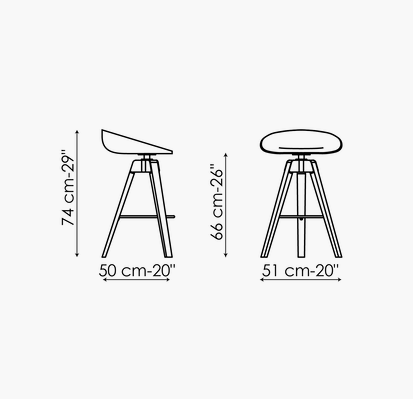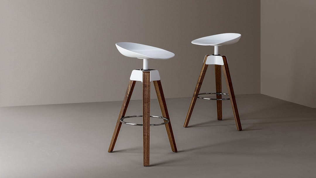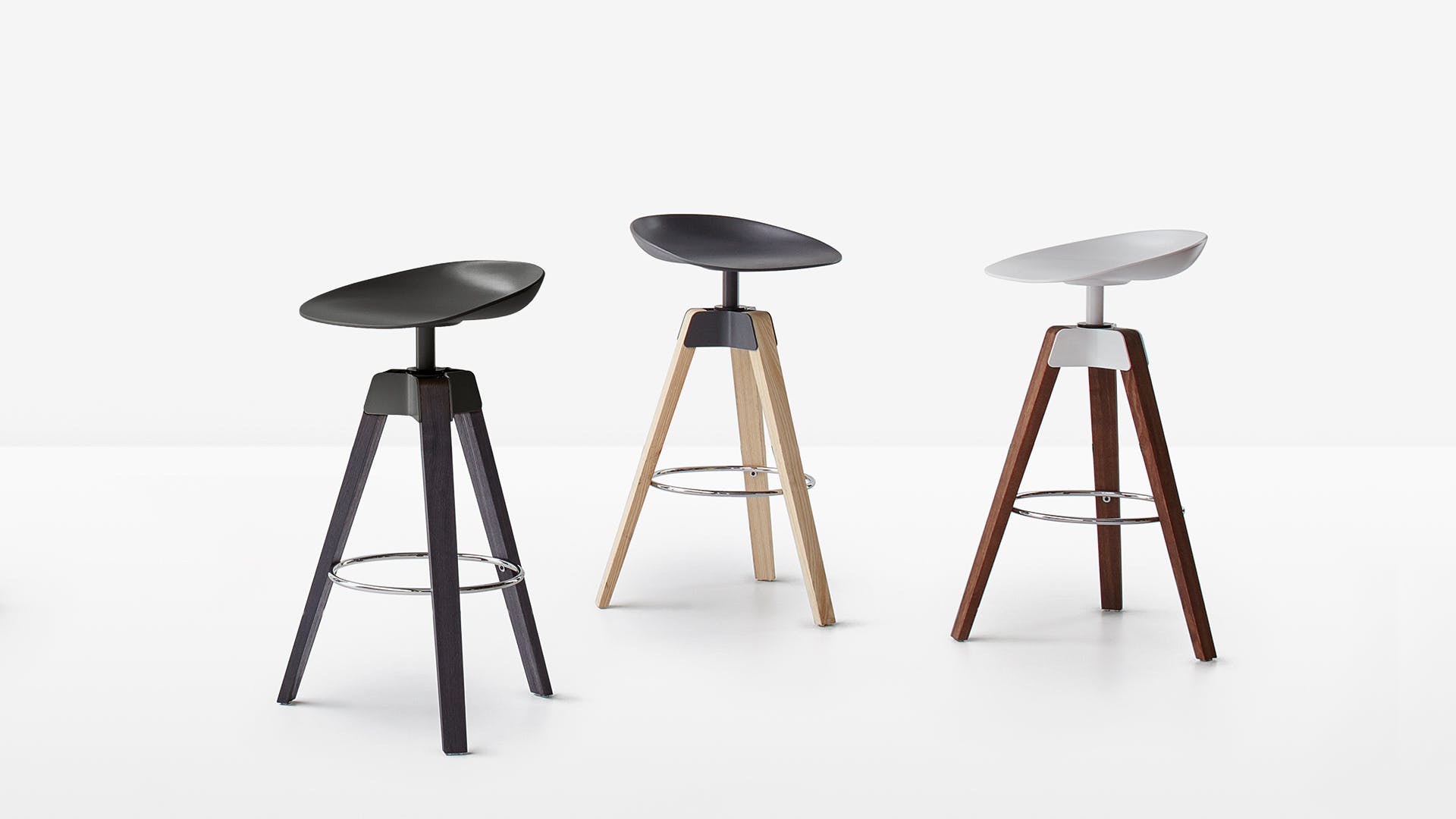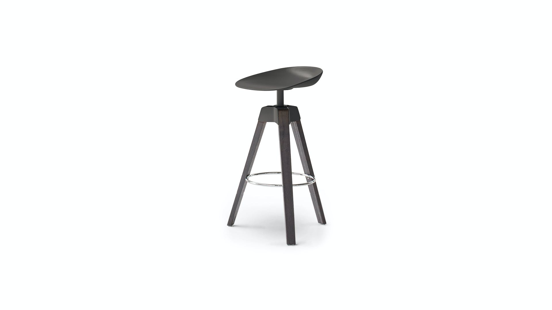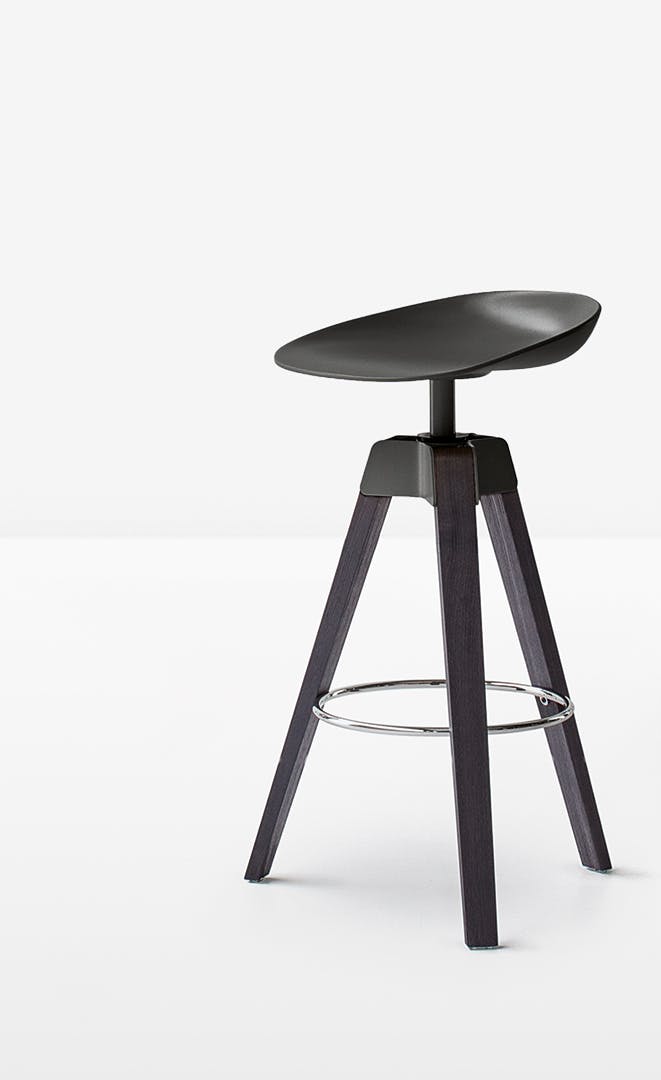 The compactness and simplicity of the design that characterises the Plumage bar stool ensure an effect of maximum lightness. Designed by Dondoli and Pocci, the stool draws its inspiration from the shape of the Eiffel Tower. The sleek and slender line of Plumage can satisfy the need for space and functionality in both the home and contract sector. Available in two different heights, the elegant stool is distinguished by the contrast between the swivel seat in plastic and the legs, made of solid ash-wood. The four colours available for the seat, combined with the three wooden finishes in which it is possible to choose the legs, allow one to create elegant tone-on-tone combinations or bold compositions.
