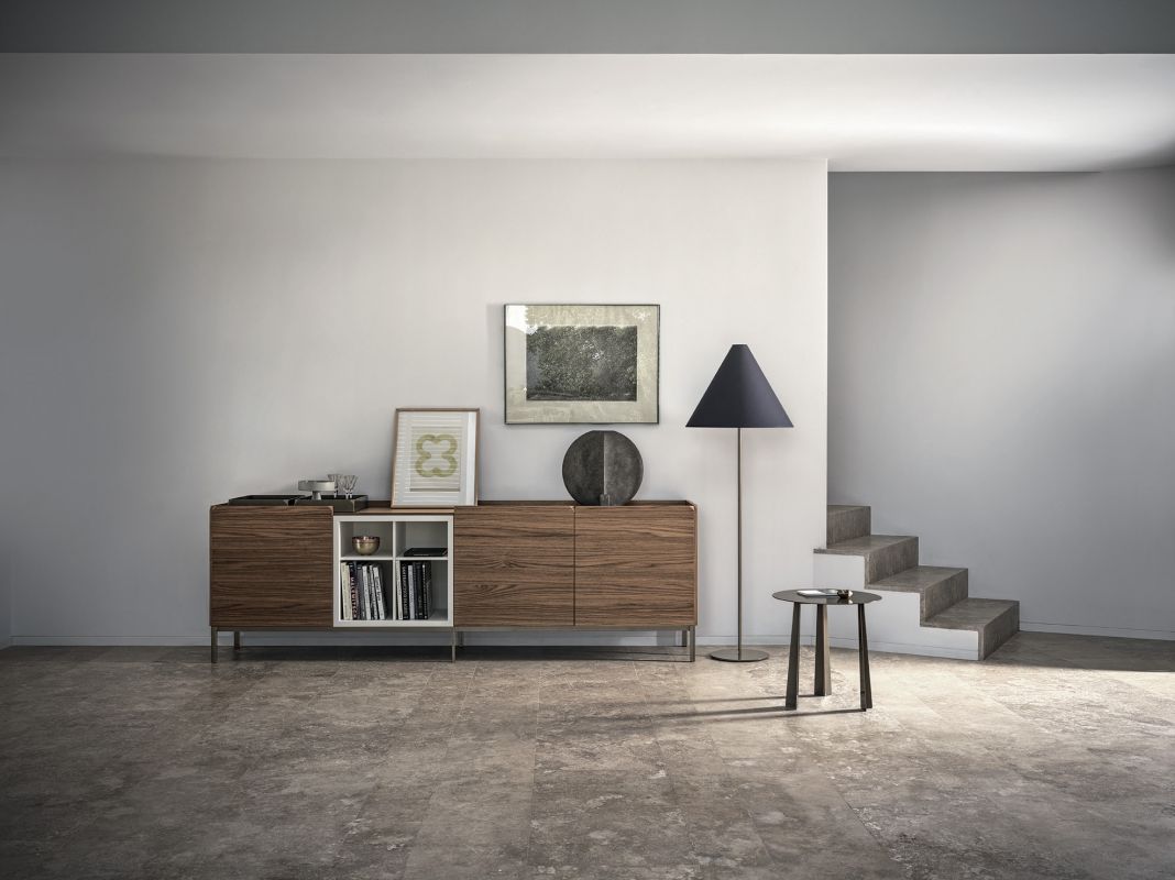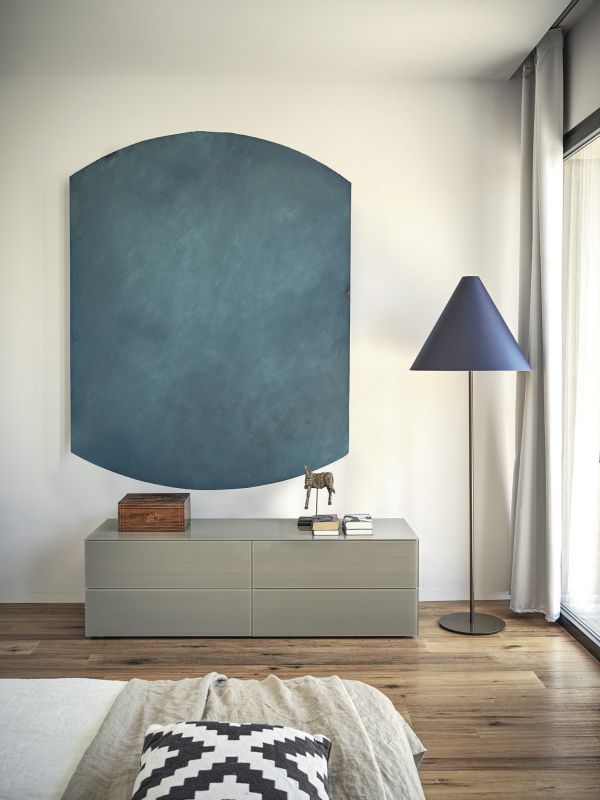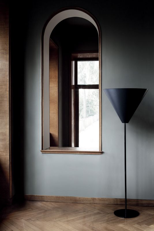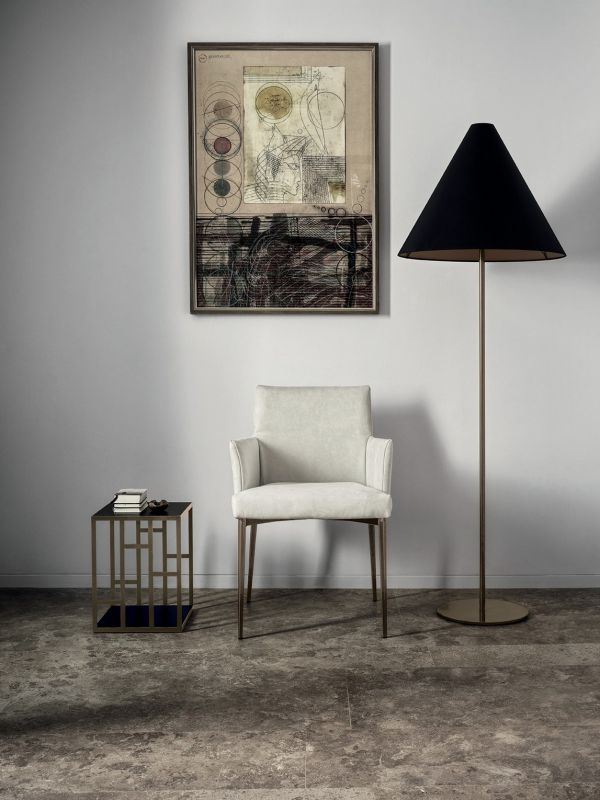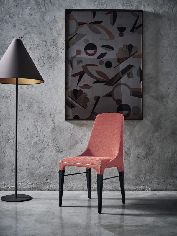 Program of ceiling lamps and floor lamps with metal lacquered frame and fabric lampshade.