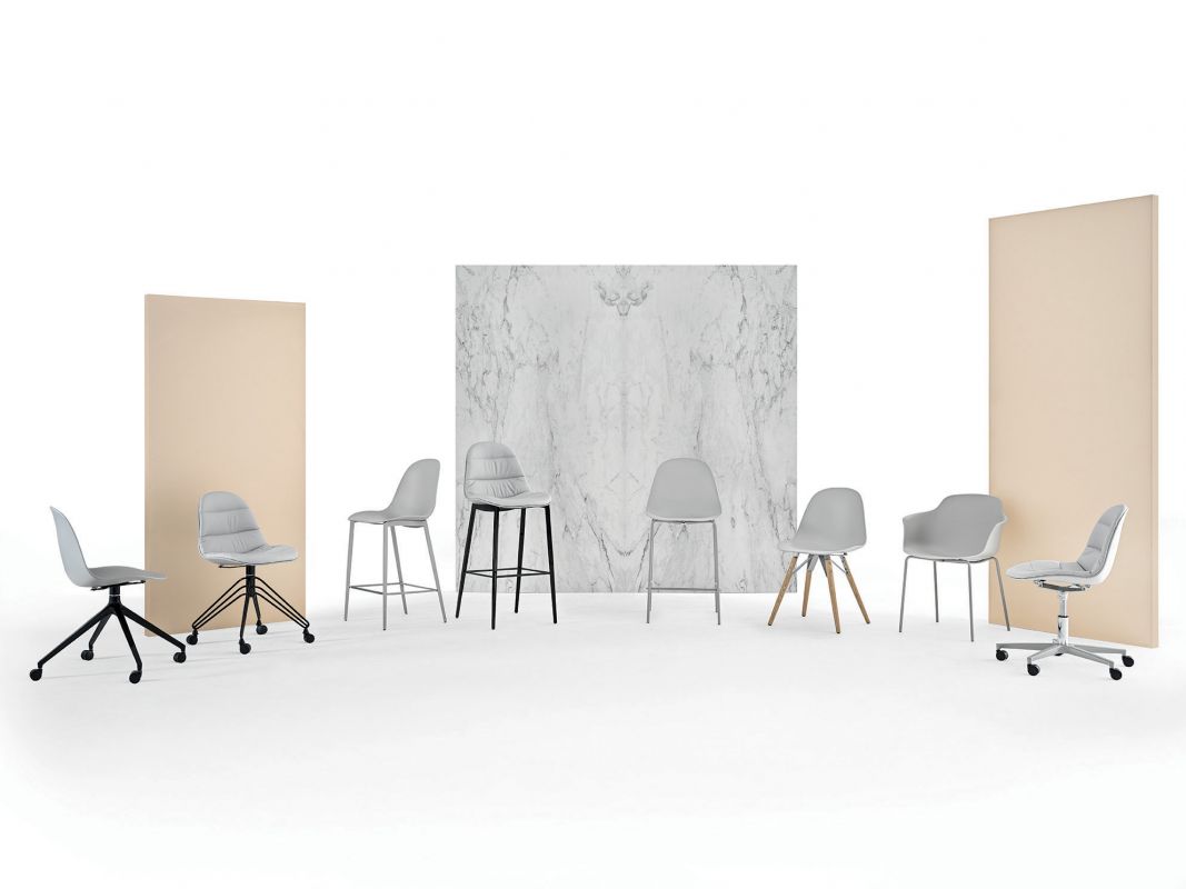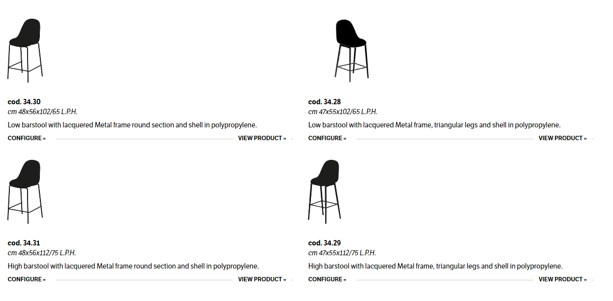 Barstool with lacquered Metal frame round section and triangular legs, shell in polypropylene.