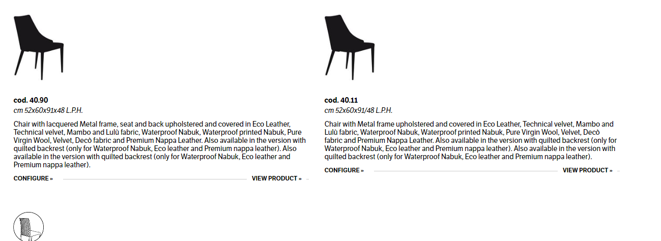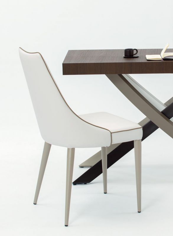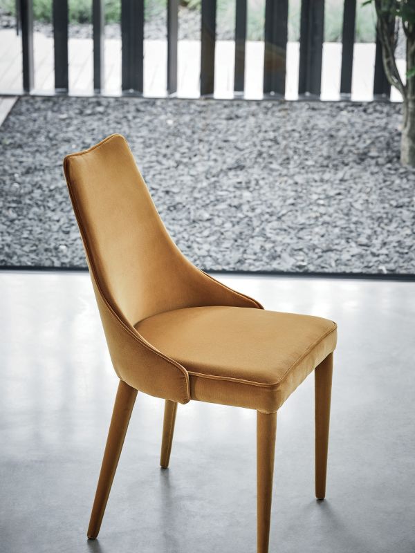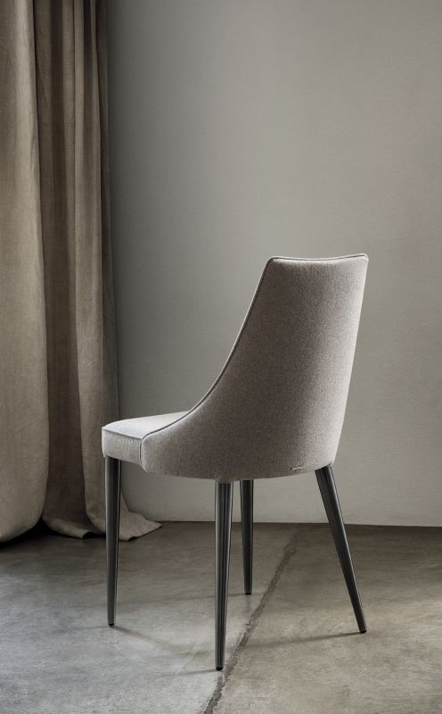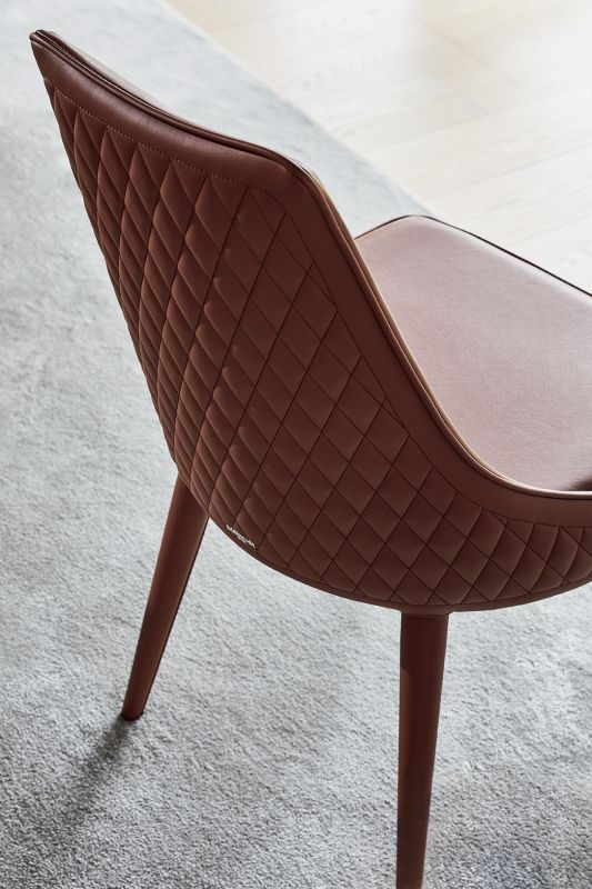Chair padded and totally upholstered or with the legs in lacquered Metal frame. Piping can be in matching colour or contrast colour. Also available in the version with quilted backrest (only for Waterproof Nabuk, Eco leather and Premium nappa leather).