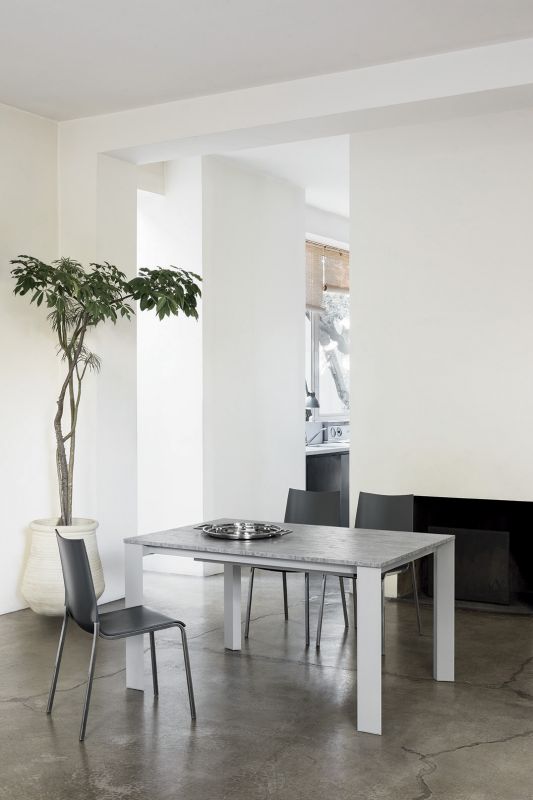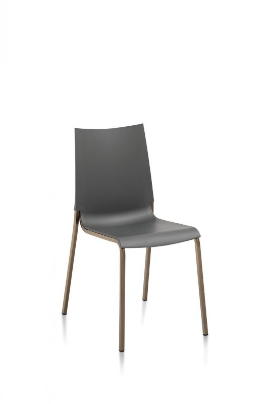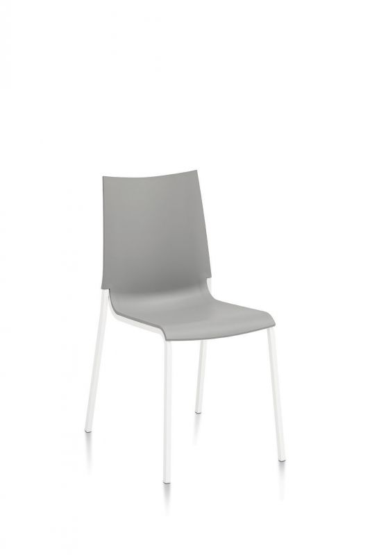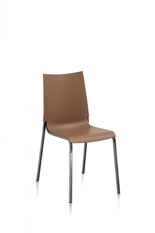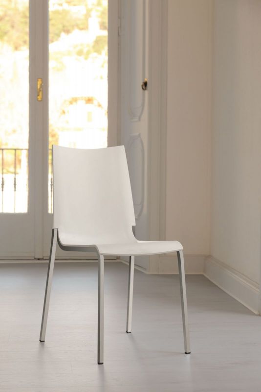 Stackin chair with lacquered or chrome Metal frame and shell in Polypropylene.