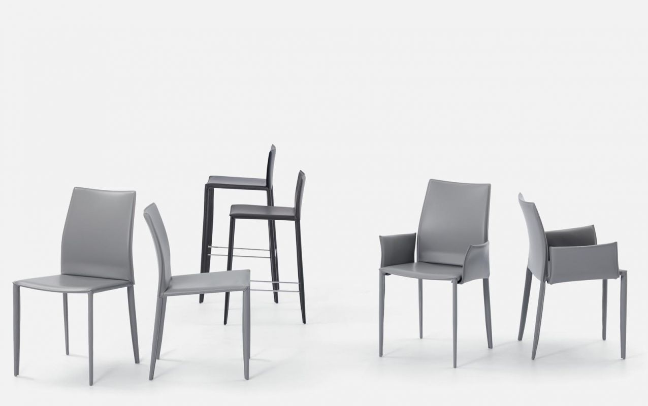 Chair and armchair with metal frame, completely padded and upholstered.