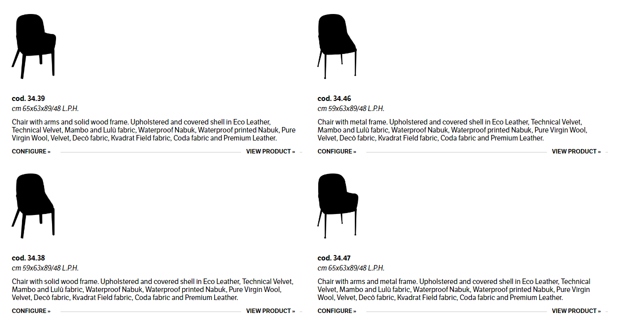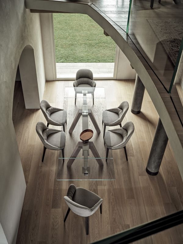 Chair with or without arms,with solid wood or metal frame,upholstered and covered in Eco Leather, Technical Velvet, Mambo and Lulù fabric, Waterproof Nabuk, Waterproof printed Nabuk, Pure Virgin Wool, Velvet, Decò fabric, Kvadrat Field fabric, Coda fabric and Premium Leather.