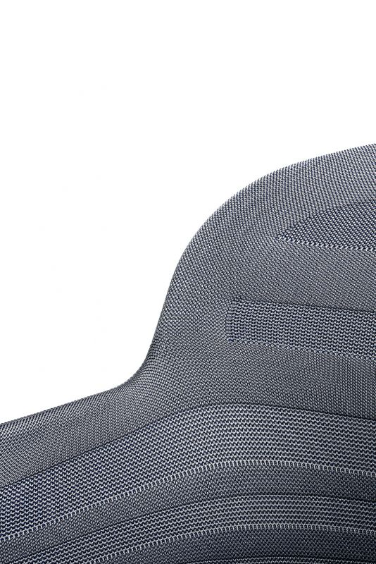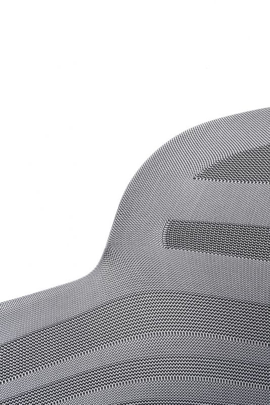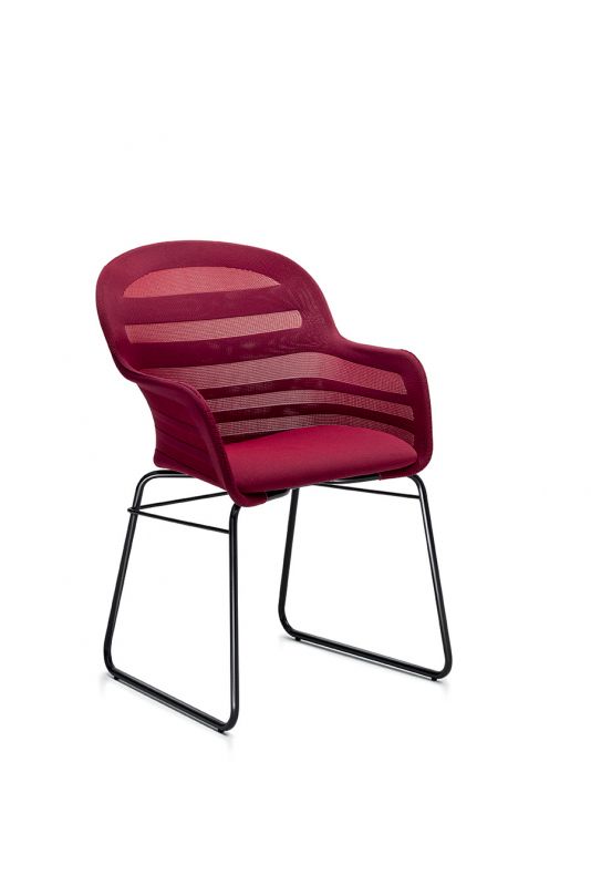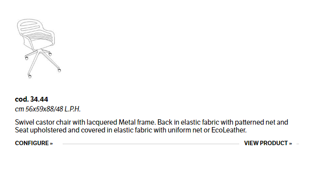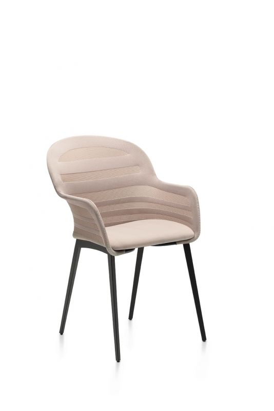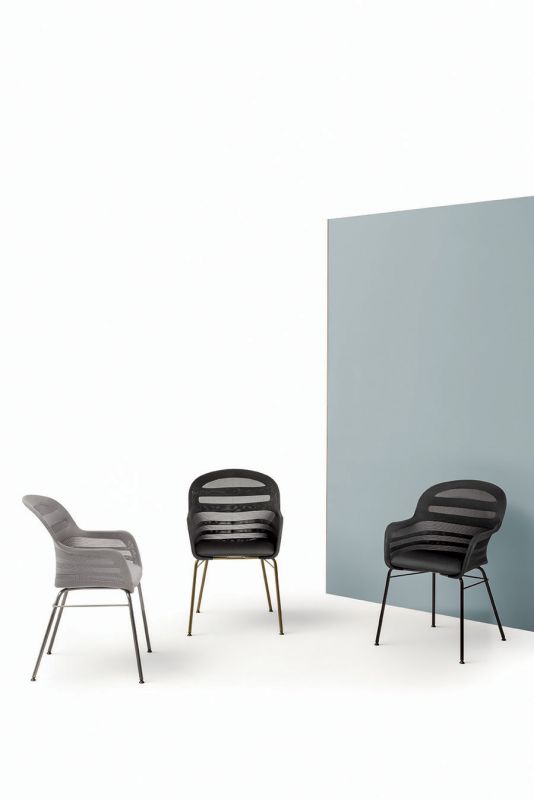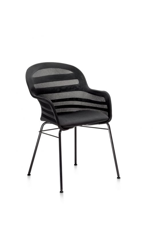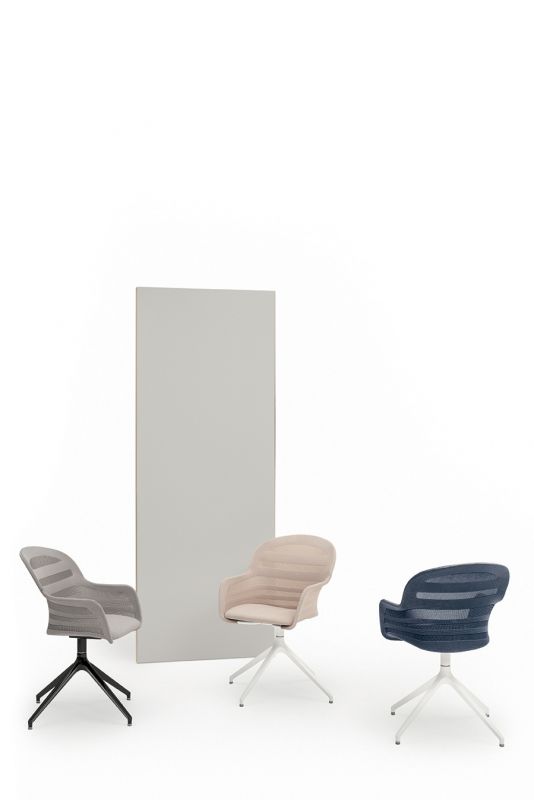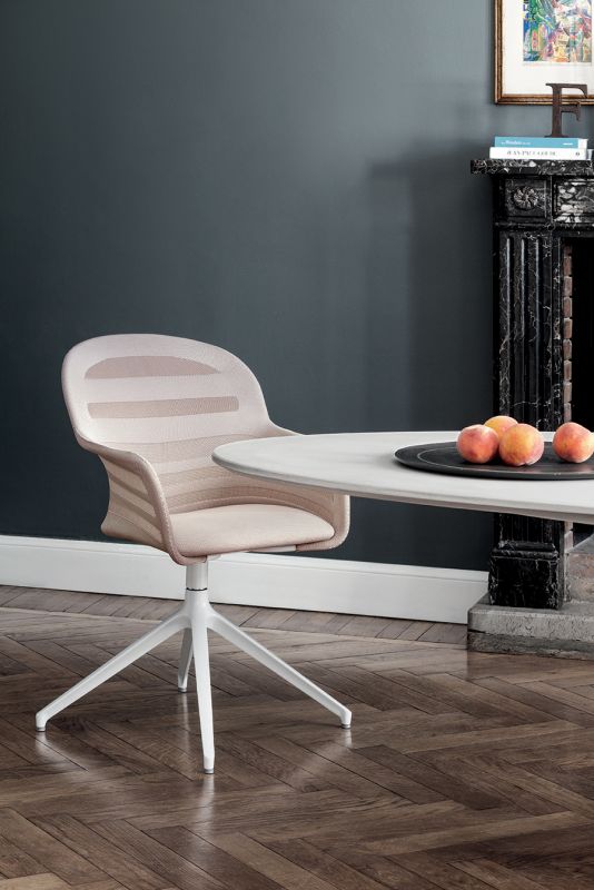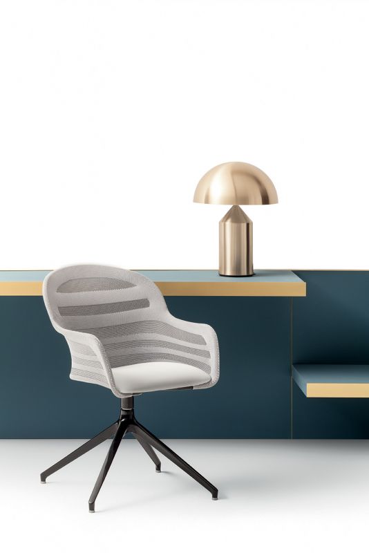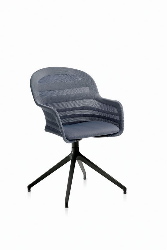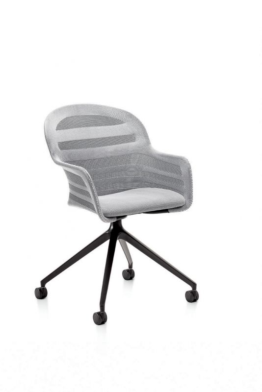 Chair with arms, swivel chair, swivel castor chair with lacquered Metal frame. Back in elastic fabric with patterned net and Seat upholstered and covered in elastic fabric with uniform net or EcoLeather.