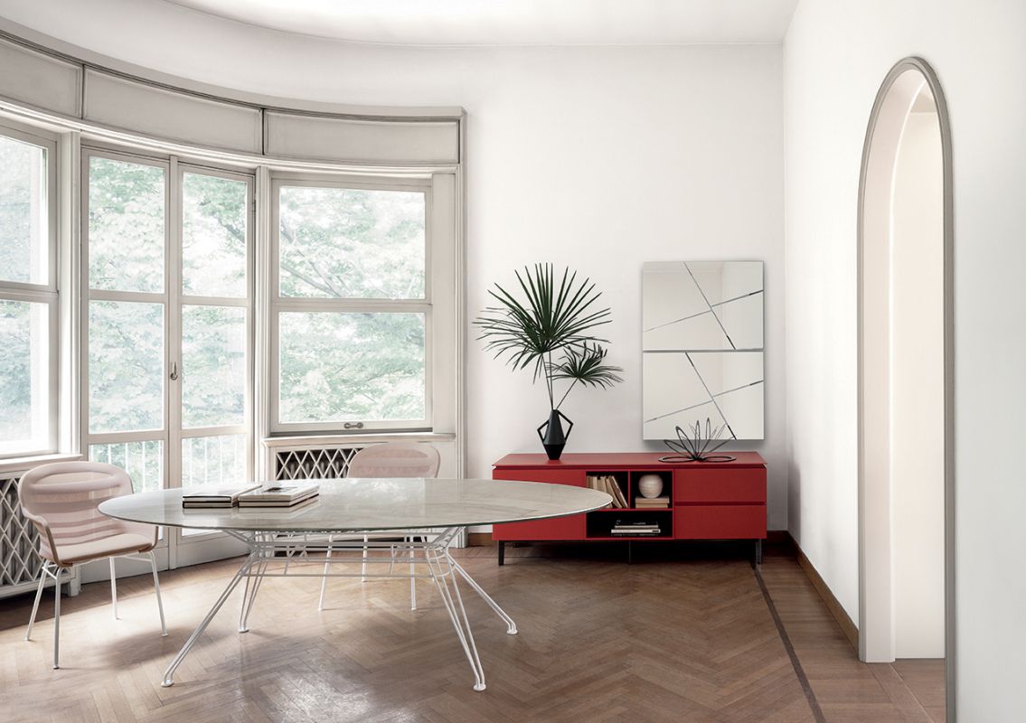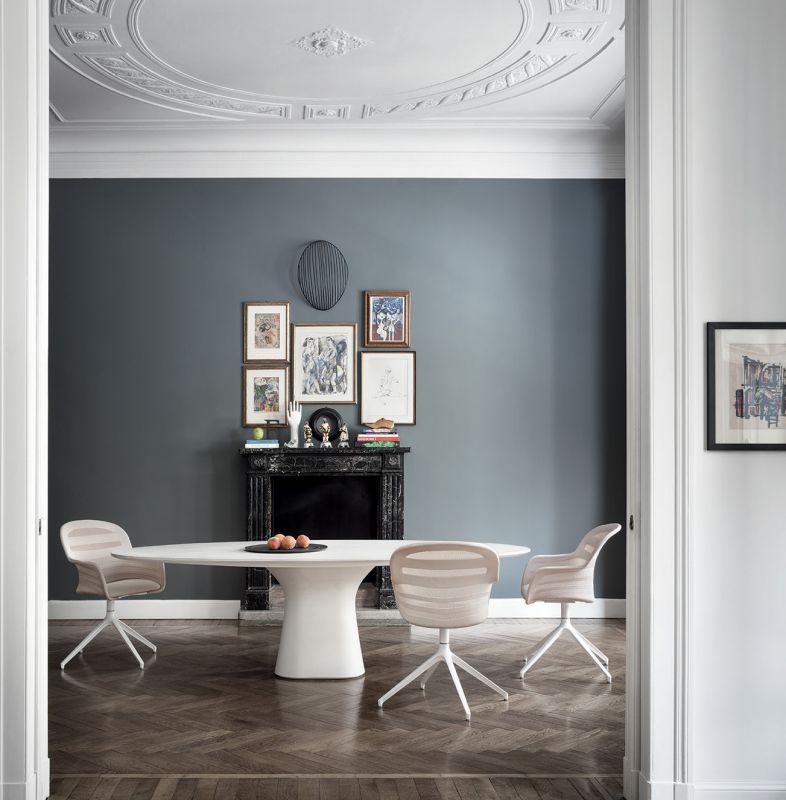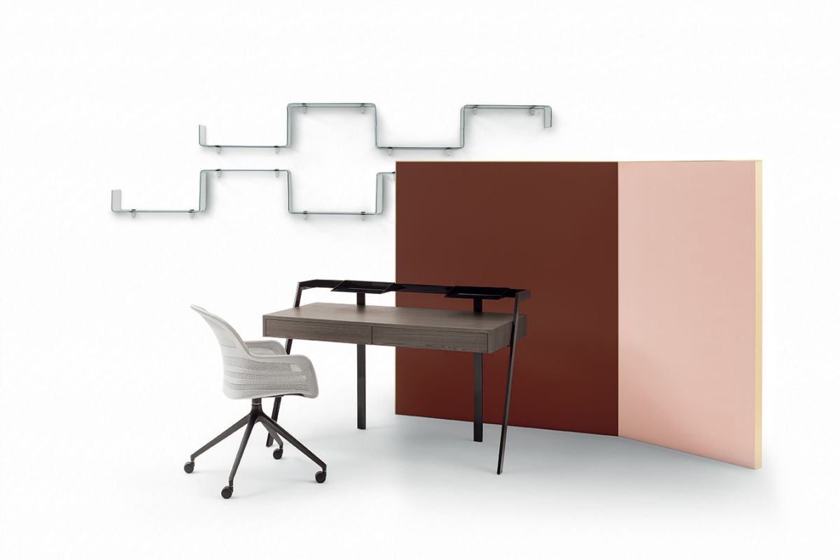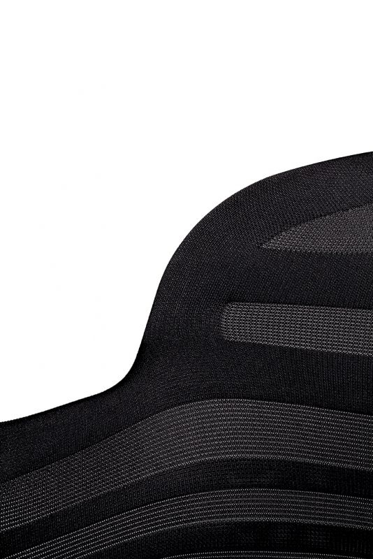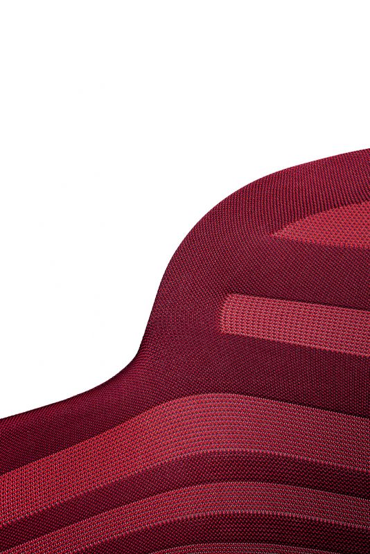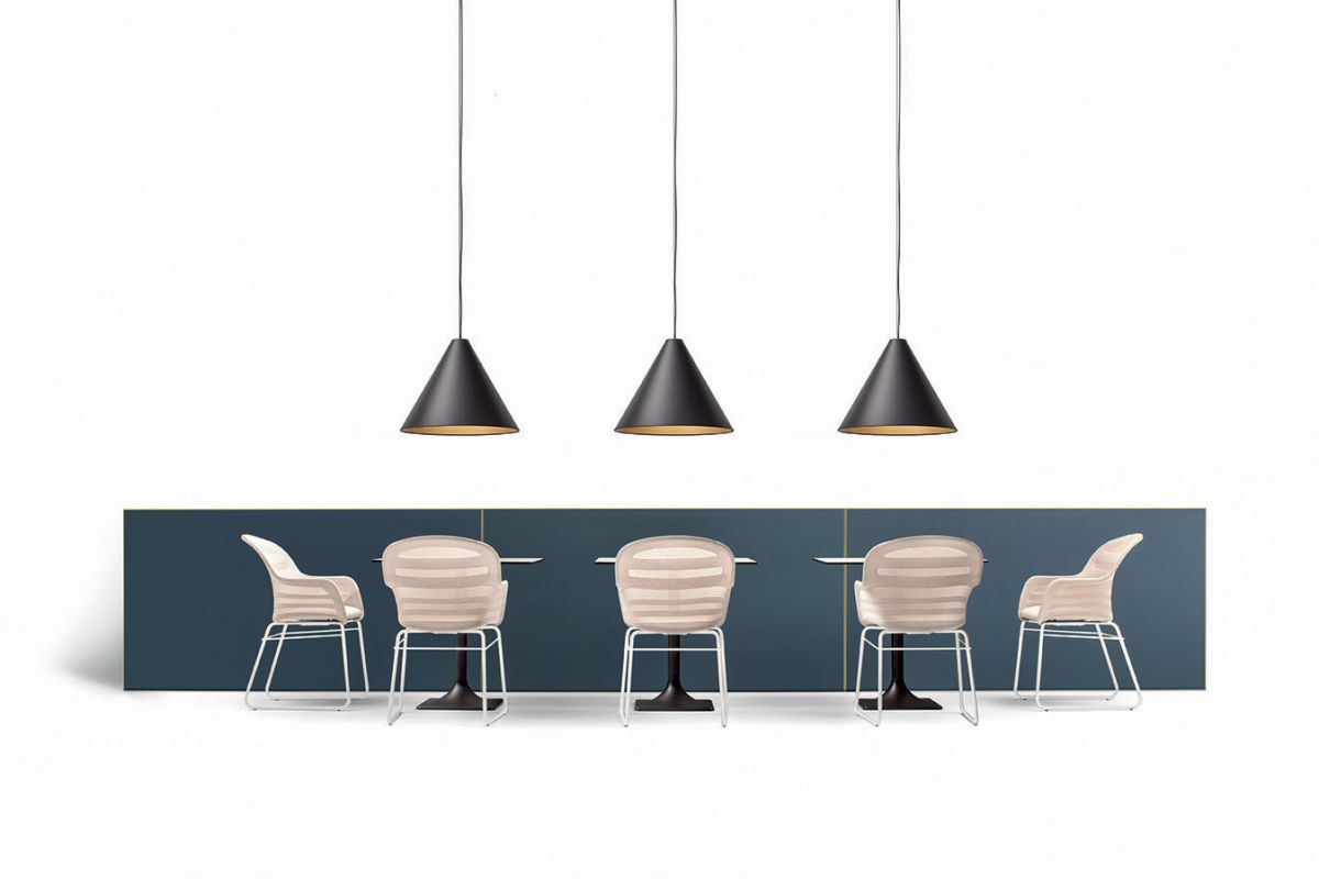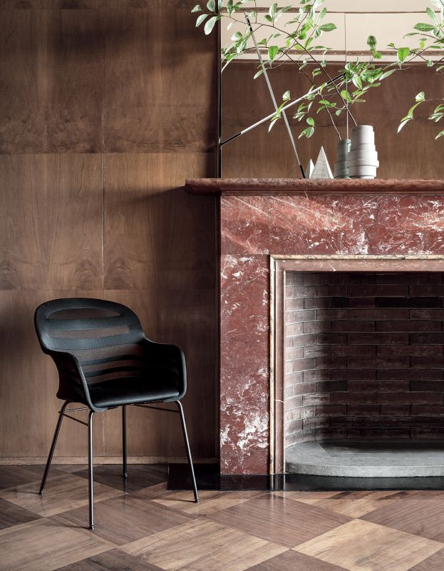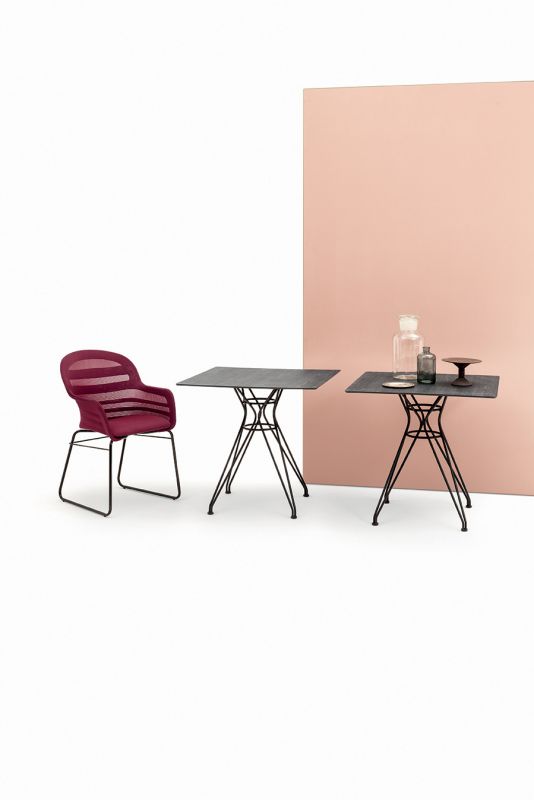 Chair with arms, swivel chair, swivel castor chair with lacquered Metal frame. Back in elastic fabric with patterned net and Seat upholstered and covered in elastic fabric with uniform net or EcoLeather.