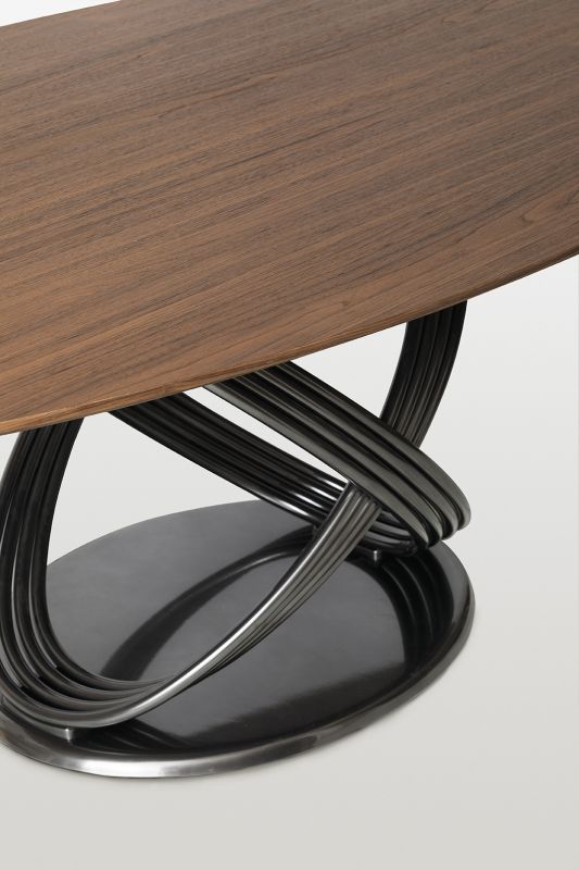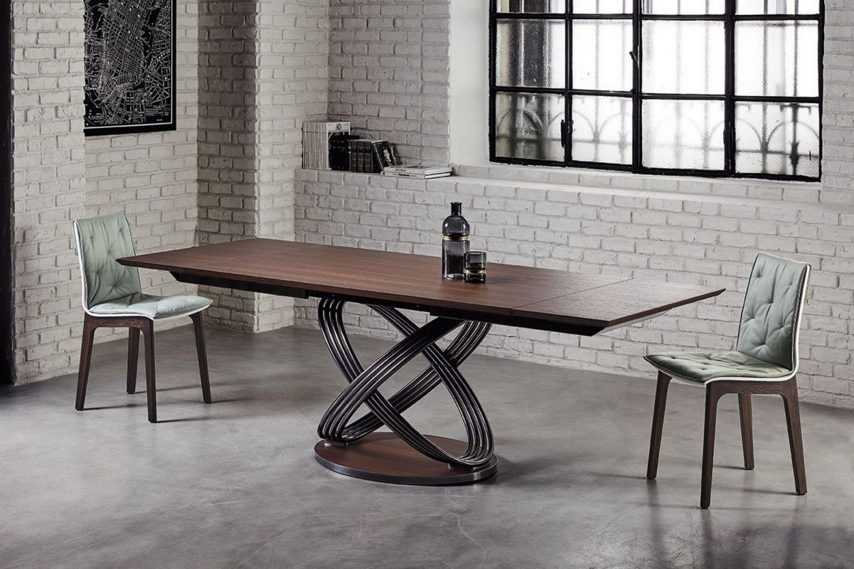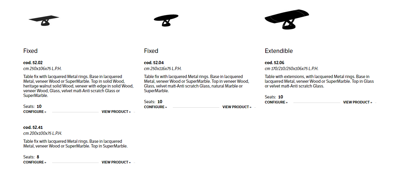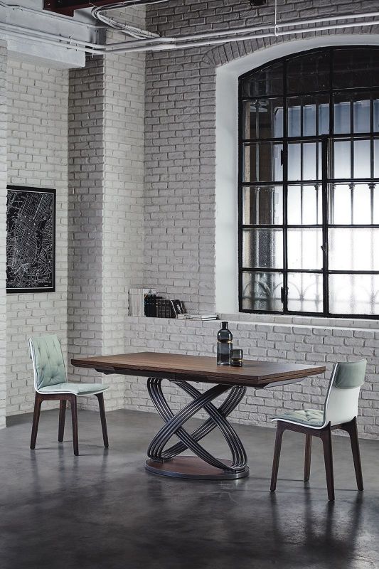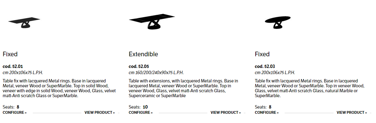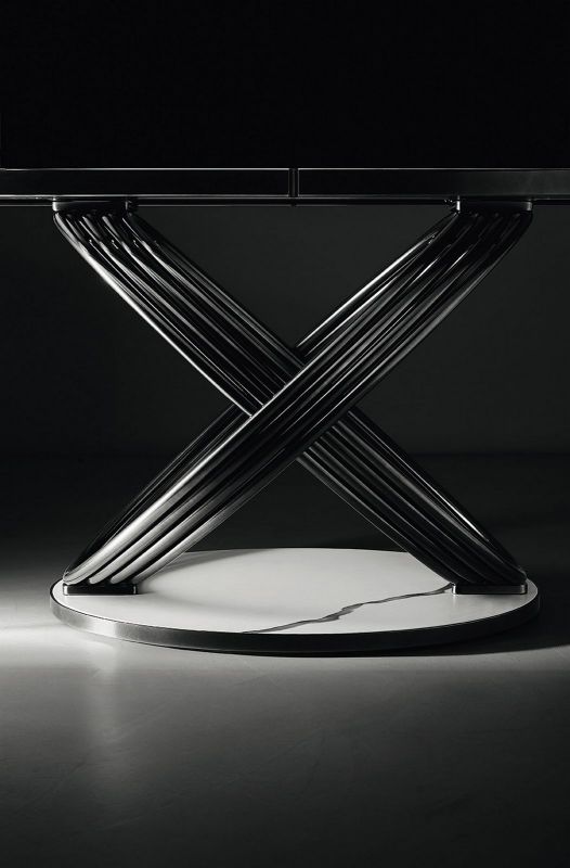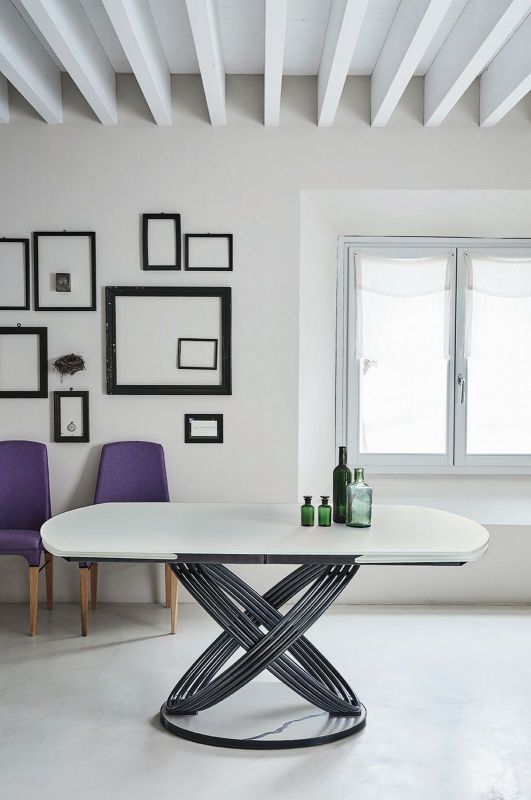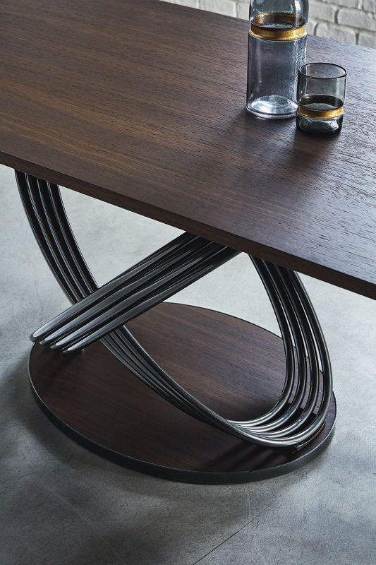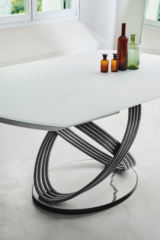 Table fix or with extensions with lacquered Metal rings. Base in lacquered Metal, veneer Wood or SuperMarble. Top in solid Wood, heritage walnut solid Wood, veneer with edge in solid Wood, veneer Wood, Glass, velvet matt-Anti scratch Glass natural Marble, SuperMarble or SuperCeramic