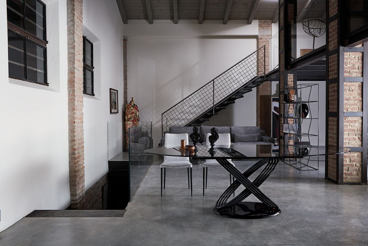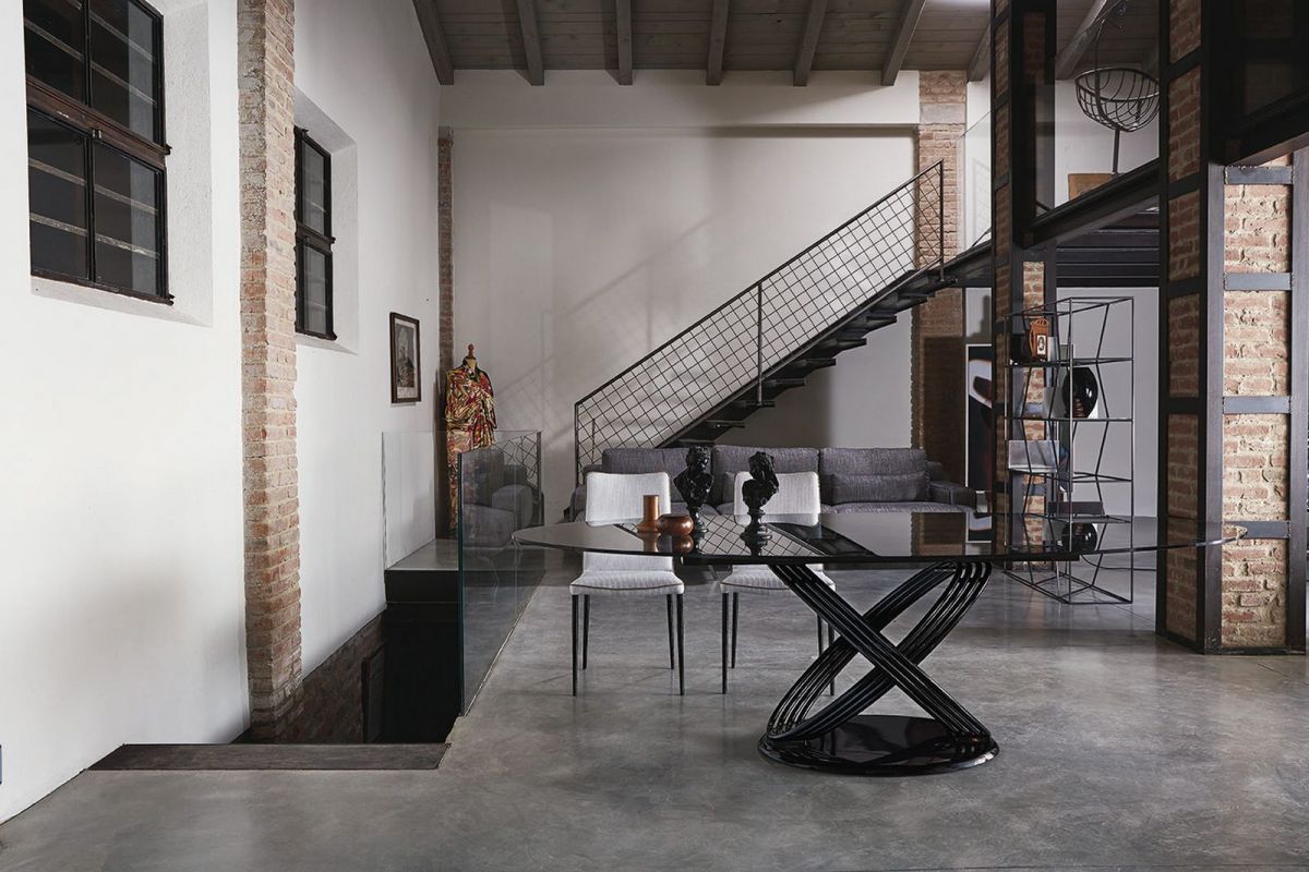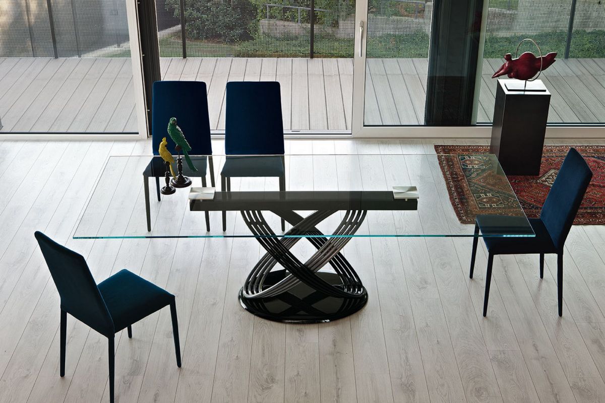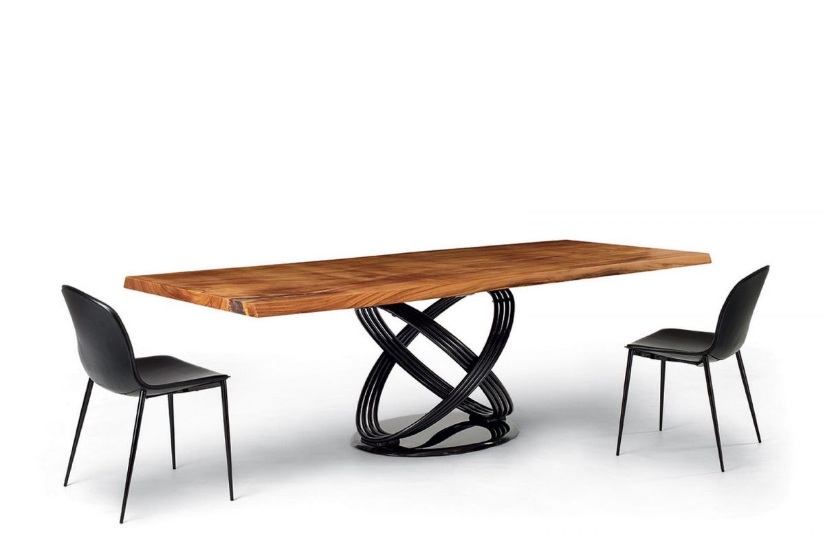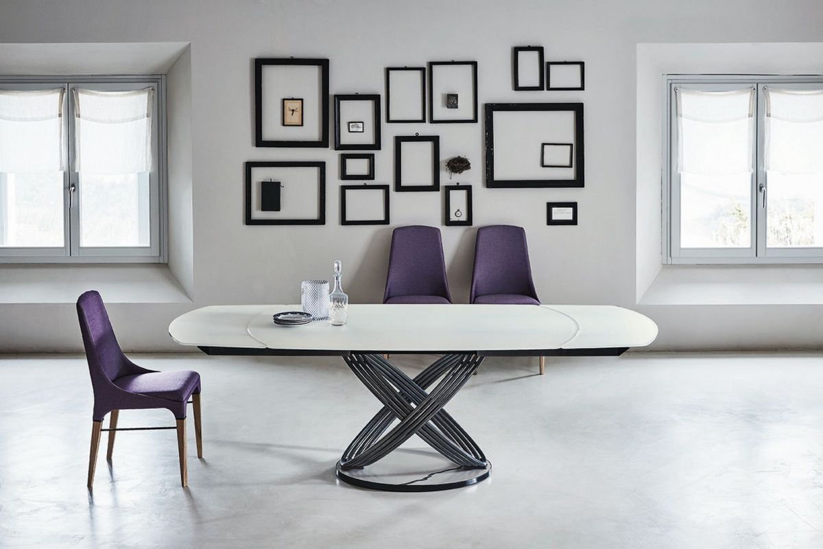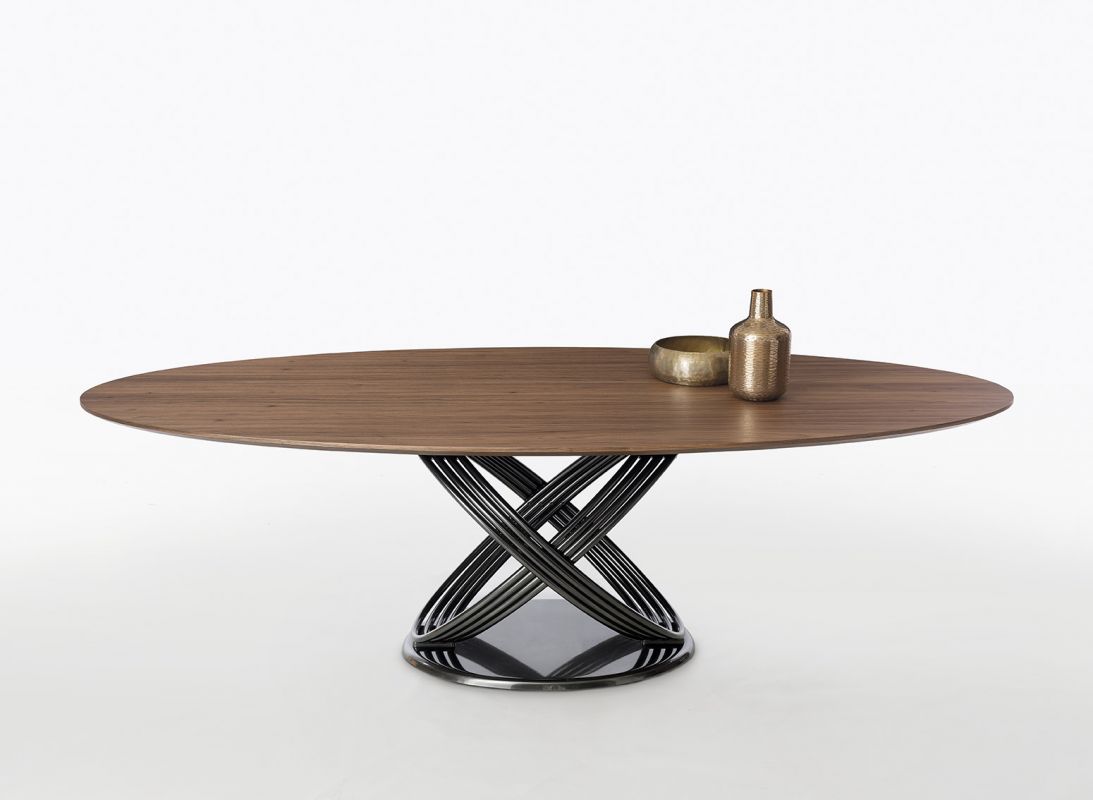 Table fix or with extensions with lacquered Metal rings. Base in lacquered Metal, veneer Wood or SuperMarble. Top in solid Wood, heritage walnut solid Wood, veneer with edge in solid Wood, veneer Wood, Glass, velvet matt-Anti scratch Glass natural Marble, SuperMarble or SuperCeramic