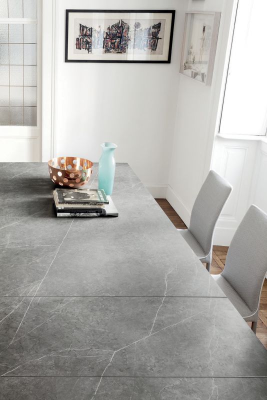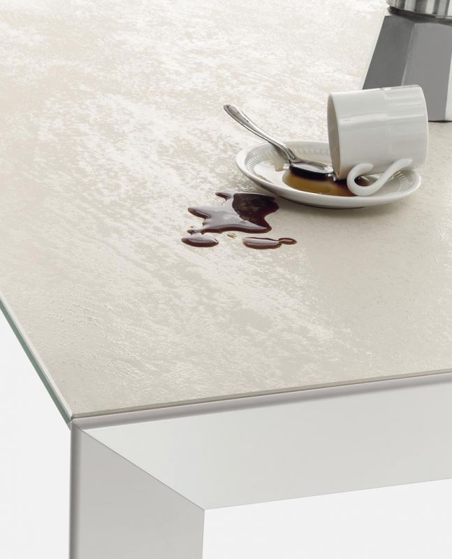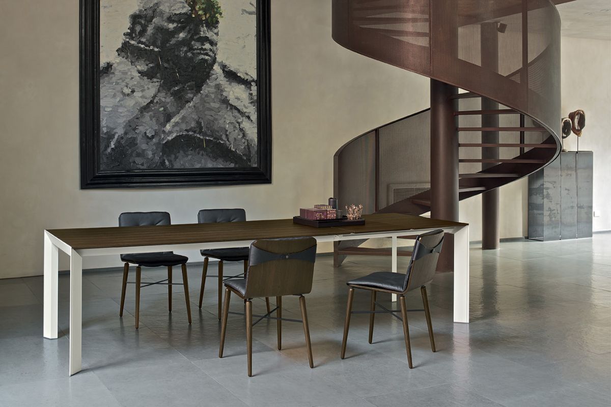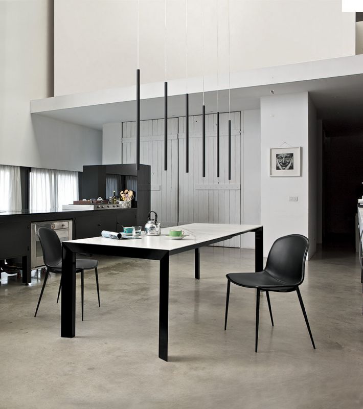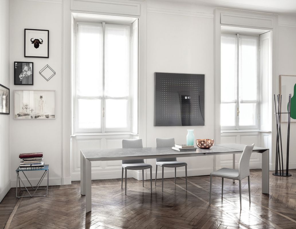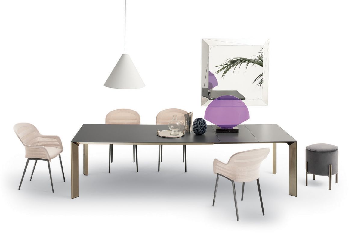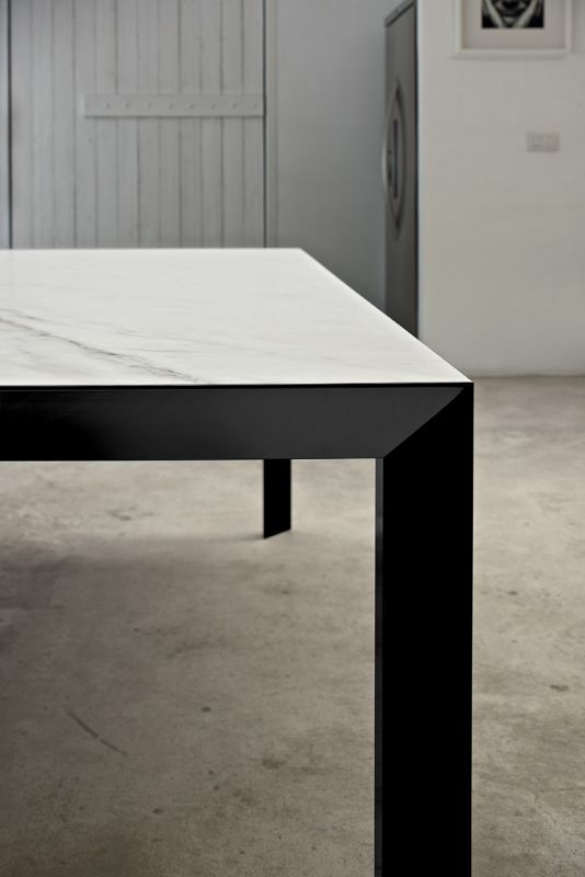 Table with extensions and lacquered Metal frame.Top in veneer, glossy Glass, velvet matt Anti-scratch Glass,SuperCeramic or SuperMarble.