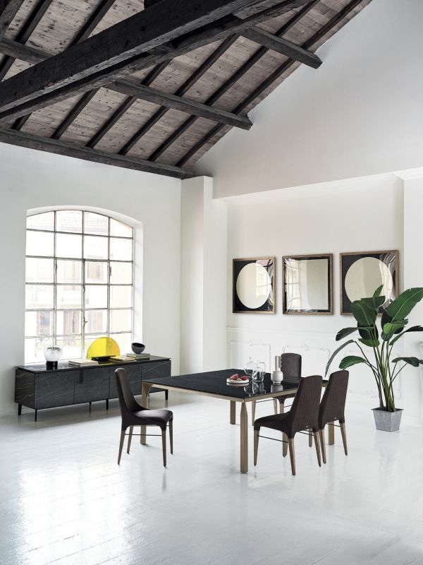 Fixed and extendable table with lacquered aluminium frame. Top in veneer wood, glass, SuperCeramic and SuperMarble.