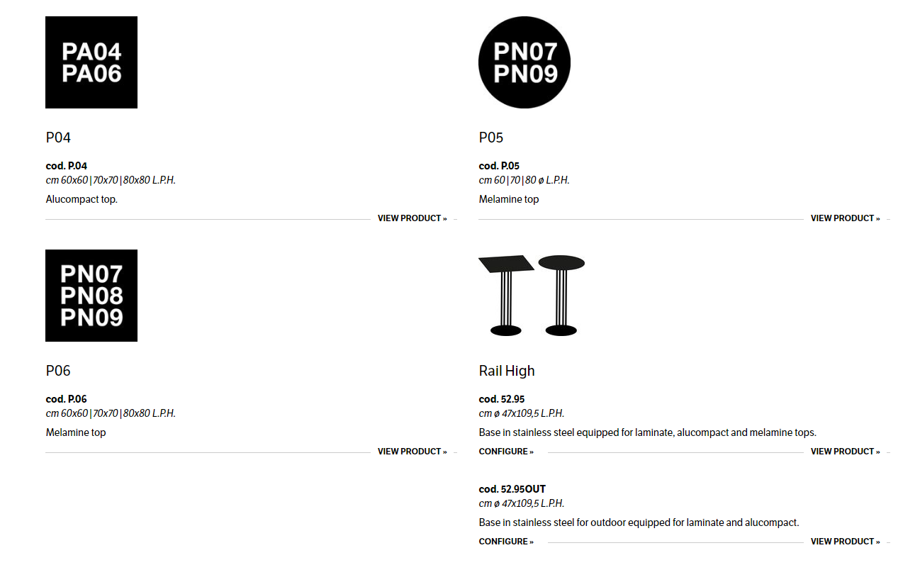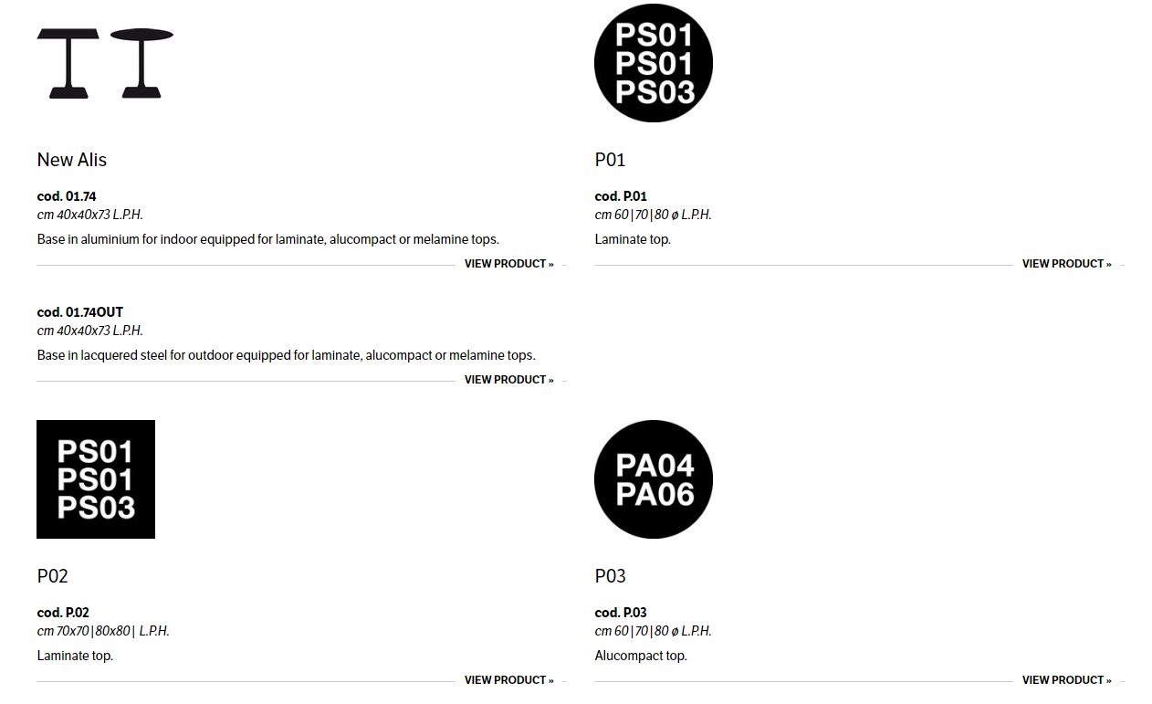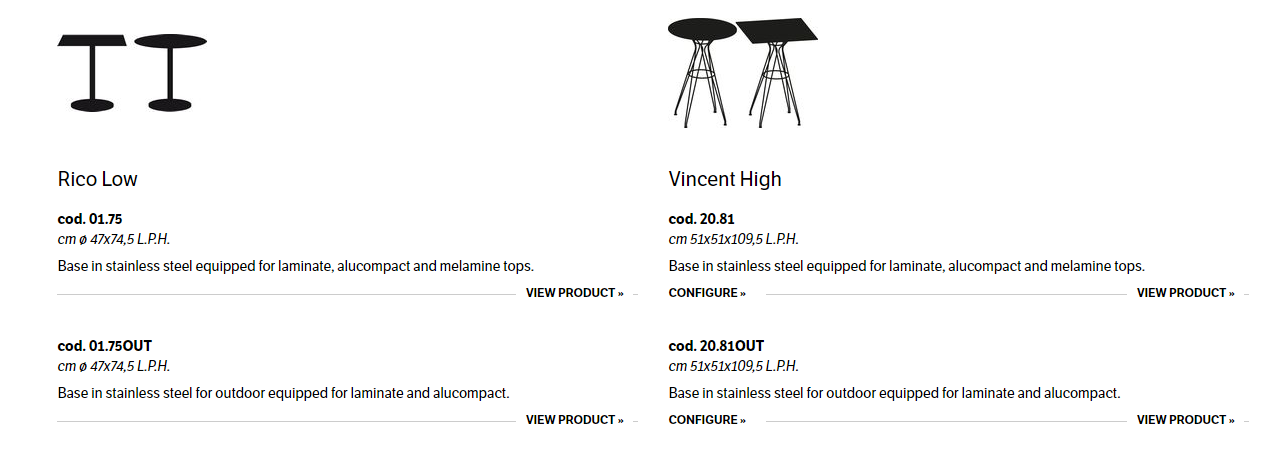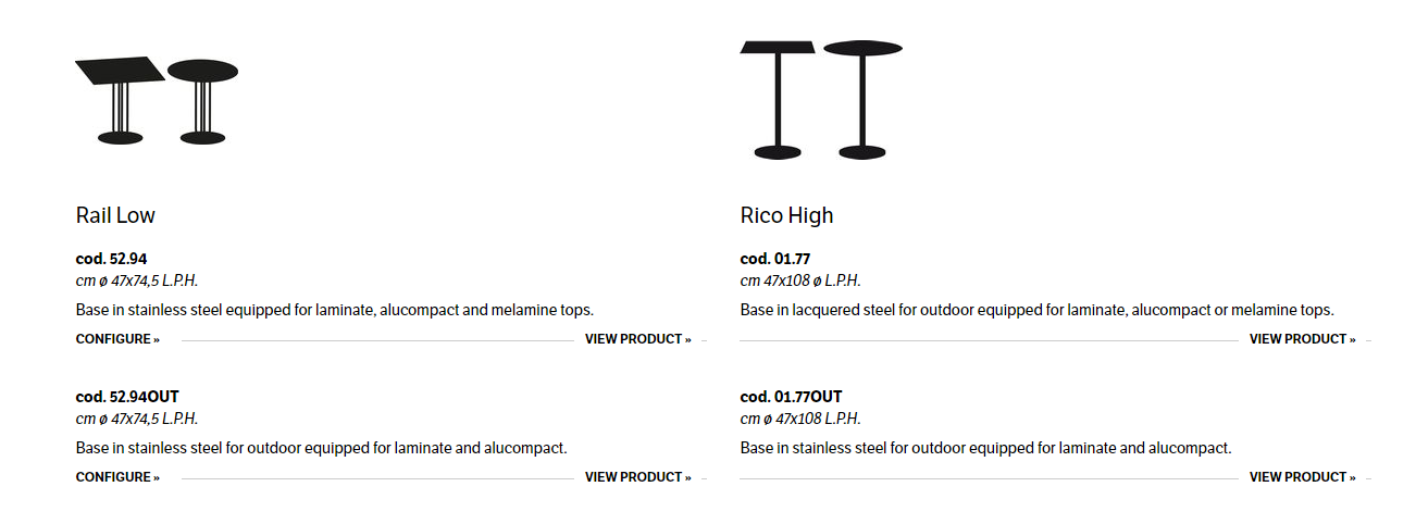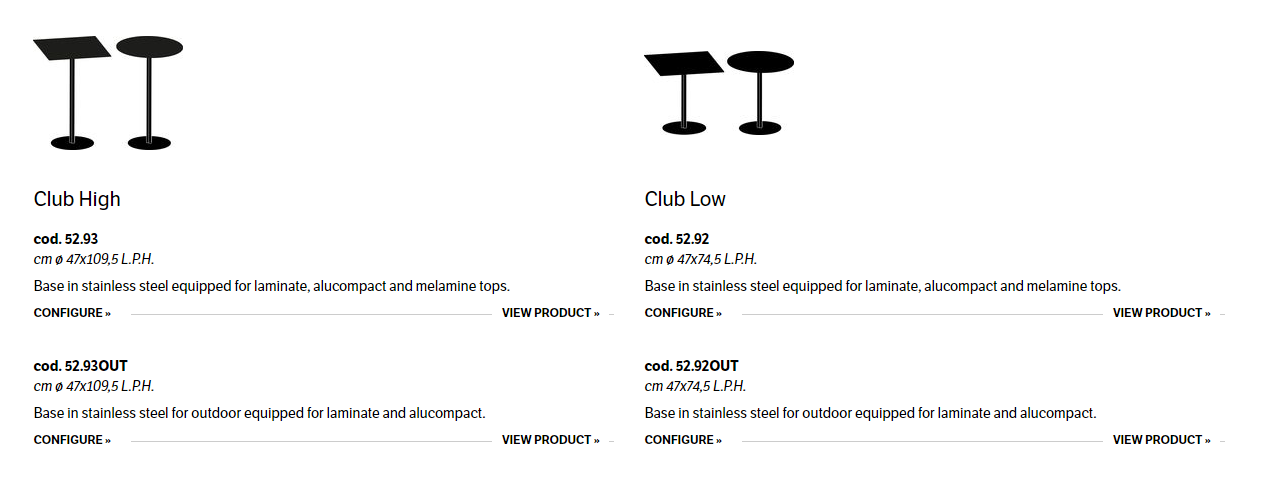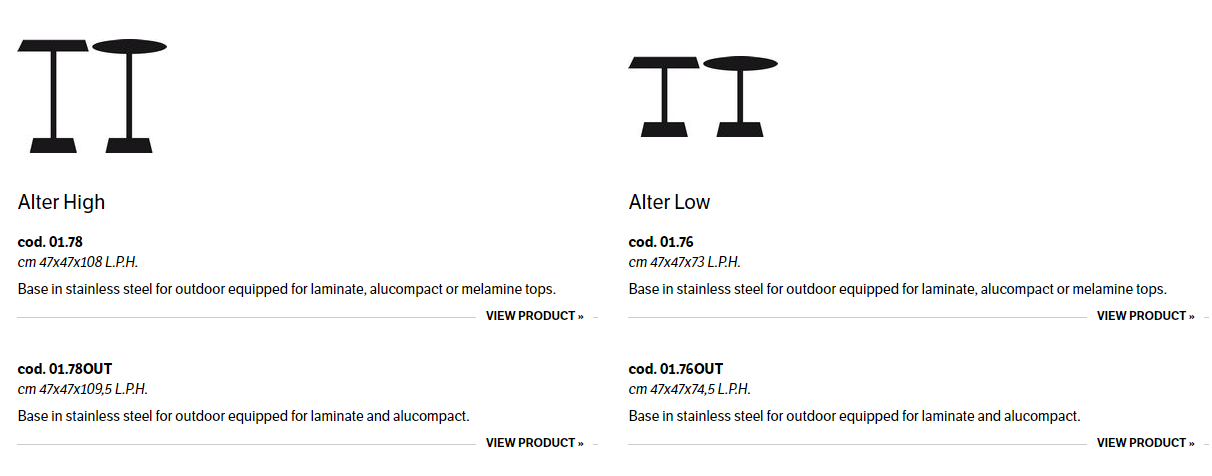 Bases in aluminium for indoor, stainless steel for outdoor and tops in laminate, alucompact or melamine.