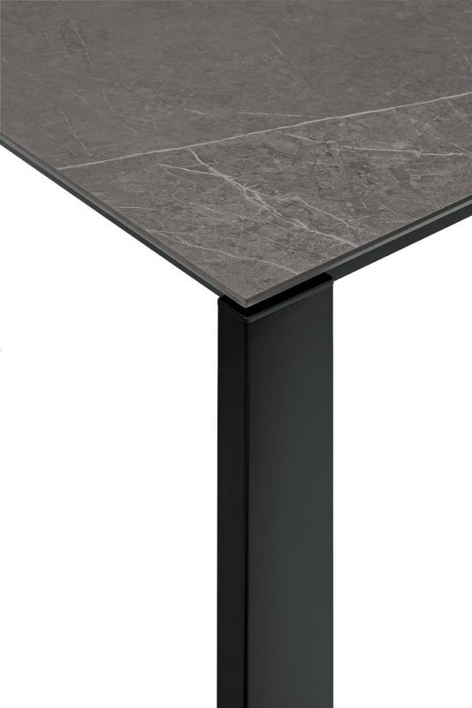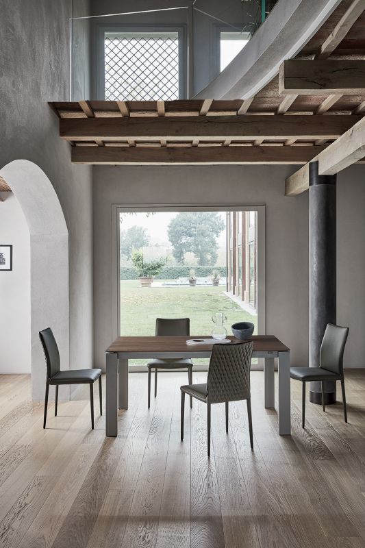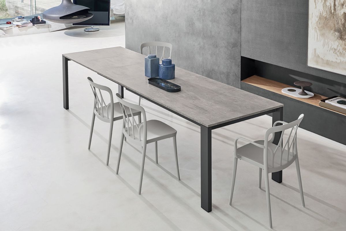 Extendible table with lacquered metal frame. Top in melamine, Wood veneer, glossy Glass, anti-scratch Glass, SuperCeramic and SuperMarble.