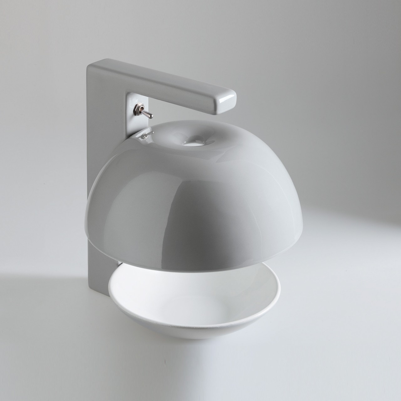Elle è una lampada in ceramica pensata per creare un'atmosfera soft, grazie all'utilizzo della luce riflessa che partendo dal basso si dirige verso l'alto. E' una luce che accompagna i nostri riti quotidiani e il suo trasporto è reso facile da una bella maniglia.