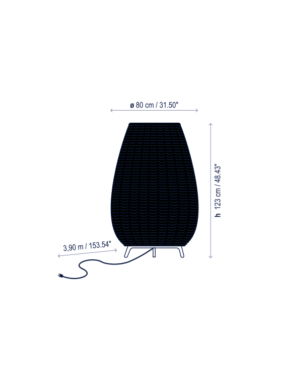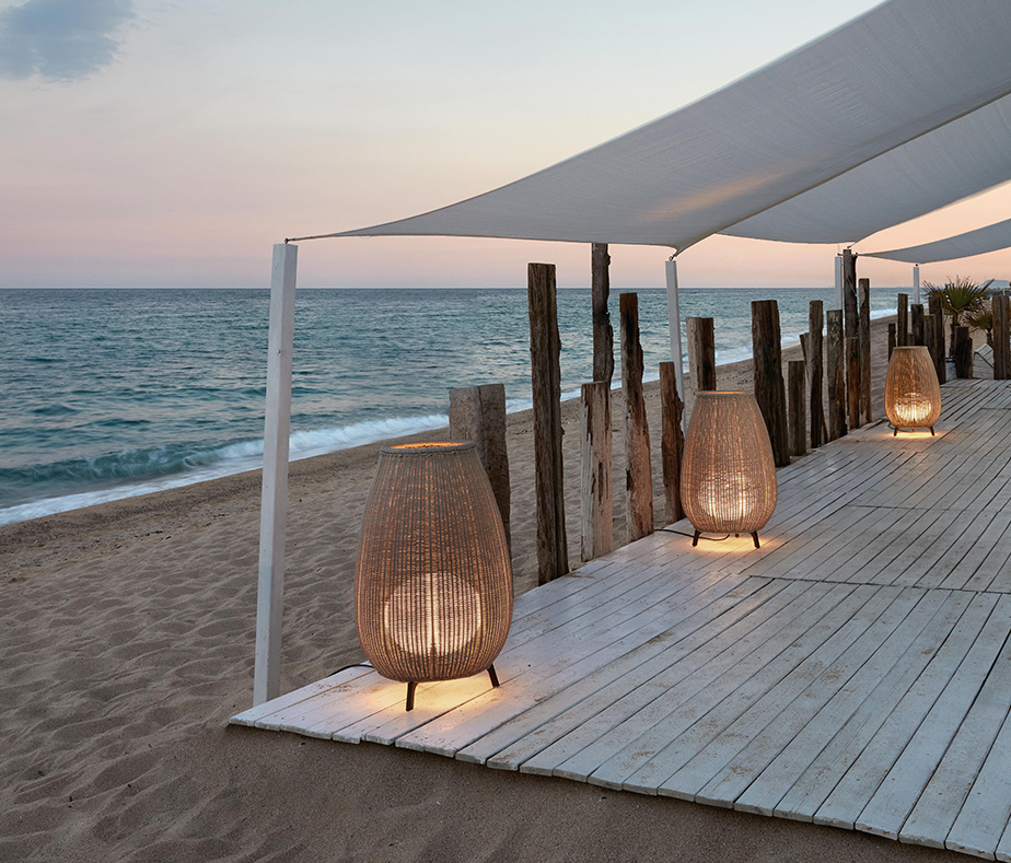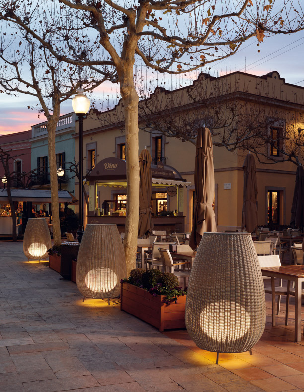 The AMPHORA collection has been designed to create a warm environment especially in outdoors. However, thanks to its highly decorative look, the Amphoras can equally be placed both in outdoor and indoor. The size and shape of this collection pay a subtle and discreet homage to the terracotta amphora formerly used for gardens and terraces decoration. In this collection we have used a synthetic wicker to make up big handmade baskets as shades with a tripod foot subjected to a cataphoresis treatment. The light source is located inside the polyethylene ellipse which grants its water tightness. The light emitted by the Amphora collection is full of nuances and shapes avoiding dazzling.