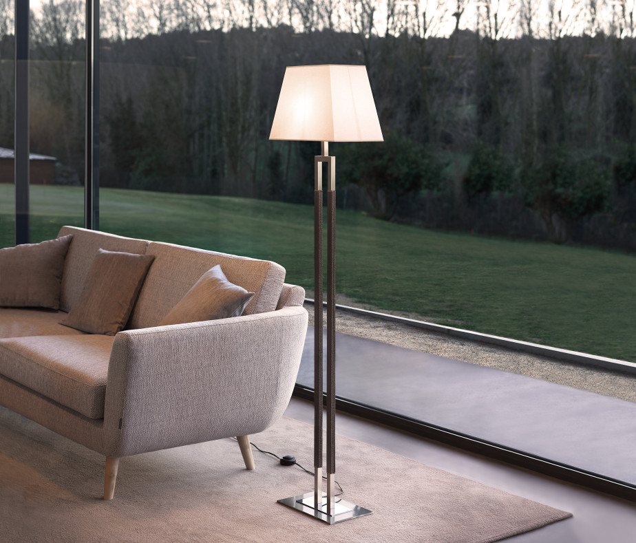 EMA is a classic and formal piece. The symmetrical nickel body combined with leather and a textile shade is balanced to provide indirect, soft and comfortable light.