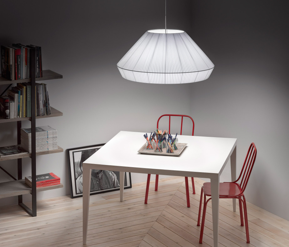 Mei is a pendant family composed of different shapes and lines but with a common denominator: the ribbon. The ribbon shades are entirely made in BOVER, starting with the frames welding to the ribbon process itself. This allows us to totally control the product quality, custom process and delivery terms. The Mei lamps are great for environments where a warm light is required. They mostly have a wide diameter, offering as a result a good direct light. Discrete and decorative since its mechanical structure is hidden inside the lamp, as if they were in a second place. Lamps are held by thin tensor wires that enhance its lightness. With Mei collection we have developed tailor-made lamps with important dimensions, and we have been able to make a quality packaging to ensure the shipment worldwide.