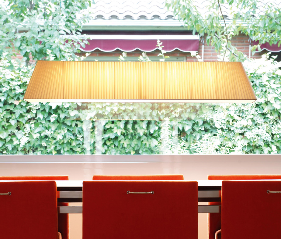Mei is a pendant family composed of different shapes and lines but with a common denominator: the ribbon. The ribbon shades are entirely made in BOVER, starting with the frames welding to the ribbon process itself. This allows us to totally control the product quality, custom process and delivery terms. The Mei lamps are great for environments where a warm light is required. They mostly have a wide diameter, offering as a result a good direct light. Discrete and decorative since its mechanical structure is hidden inside the lamp, as if they were in a second place. Lamps are held by thin tensor wires that enhance its lightness. With Mei collection we have developed tailor-made lamps with important dimensions, and we have been able to make a quality packaging to ensure the shipment worldwide.