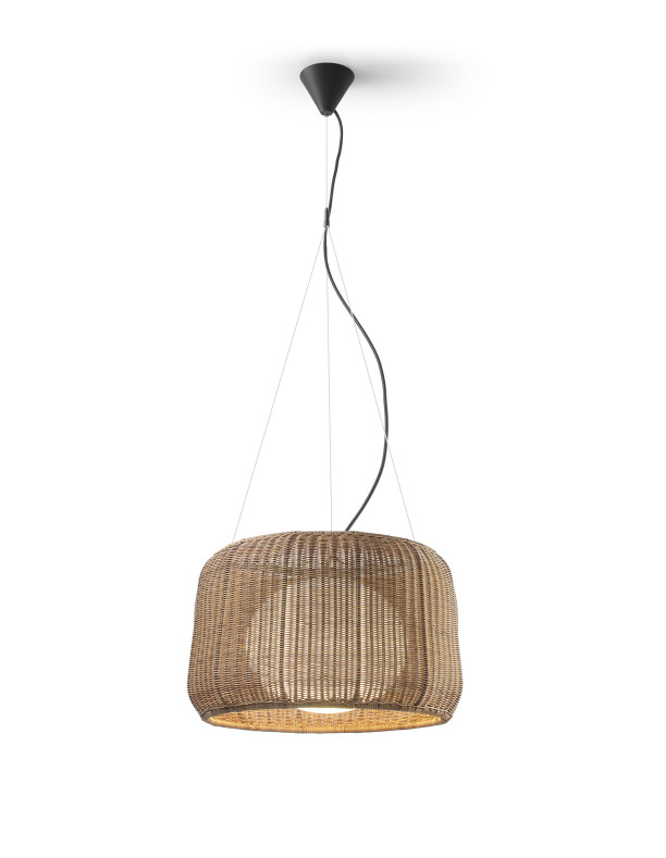 FORA is an outdoors lamp with IP-55. The cast iron base is distinguished by a radial base whose tubular desing improves durability and allows light to reach the grass. Light source is protected by an elliptical medium intensity and U.V. protection polythene globe, which guarantees a water tight electrical fixture. The shade is made of synthetic wicker, making it highly resistant to weathering while casting a pleasant, diffuse light. The result is a luminaire that adapts well to all types of indoor and outdoor environments. Its versatility is remarkable and difficult to find in products of this category. This family consists of a table lamp, floor lamp, ceiling, pendant retail and pendant big format.