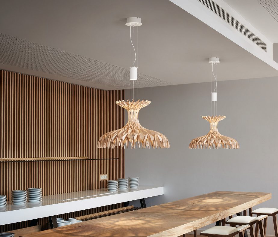 The integration of design, art and light in architecture dates back to a long time ago, and maybe this is the reason why lamps have gradually stop being just an item emitting light to become a light sculpture which confers a special personality to the product and its environment. It is such the importance of light that any change on the item can alter the formal concept of the whole project. A sculpture may seem more or less static, depending on the light received. With DOME we decided to take the light out of the object so it becomes a light sculpture designed to receive and emit a delicate light, a play of shadows and nuances that enrich the space for which they were created. Developing this project with Benedetta has allowed us to reflect on the art of lighting, on how to reinterpret light and on the creation of products with a more artistic approach and a less industrial look. It has also allowed us to be swept away and do what we really like to do. These light sculptures are completely handmade and they are entirely produced in the Bover Barcelona HQ. More than 170 big and small wood fragments are wisely intertwined and sewed one by one to end up in such a jigsaw puzzle.
