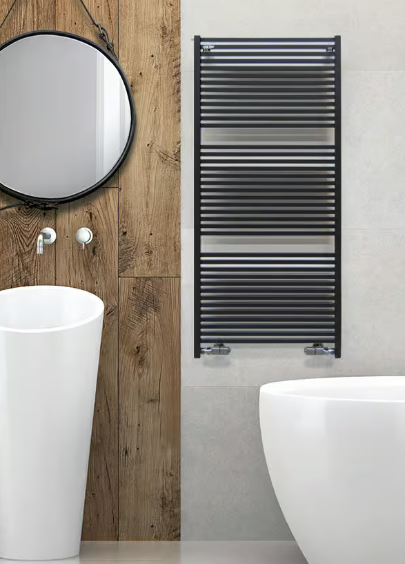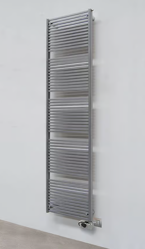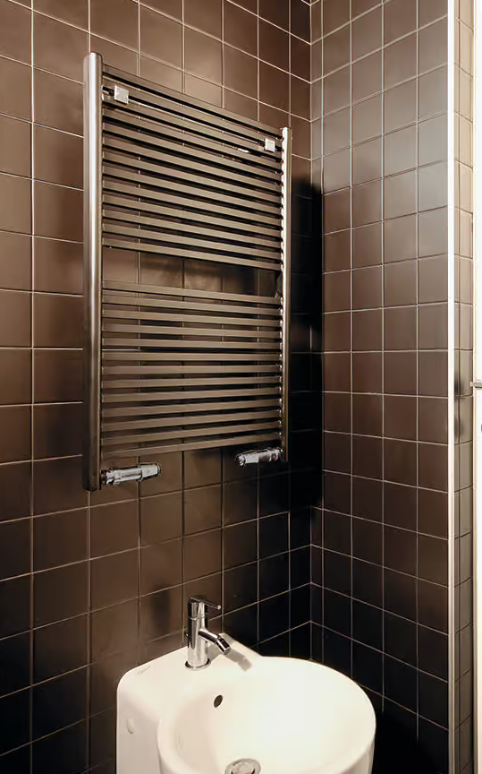 A new sense of harmony in the bathroom: KUAD is a reversible towel-heater that can be fitted with either the flat or the curved side of the collectors in full view. We recommend using Quadra valves if the flat side of the collectors is visible.