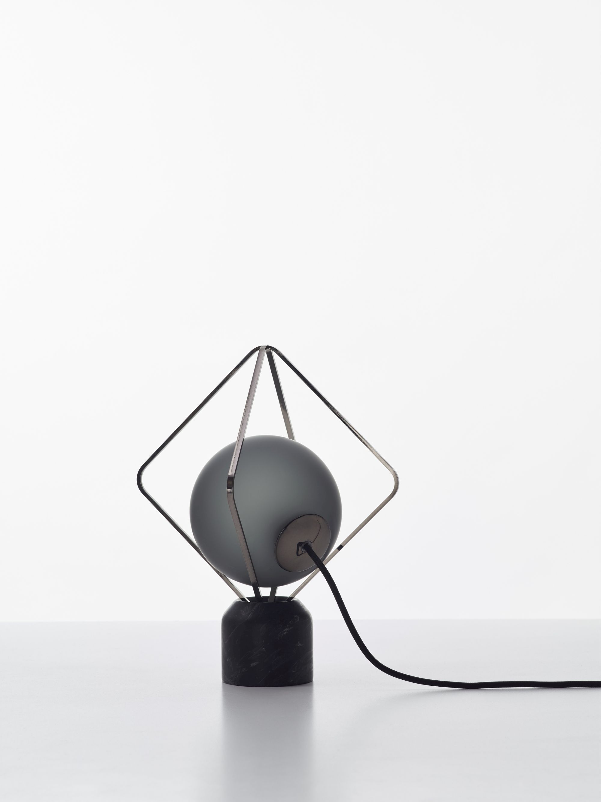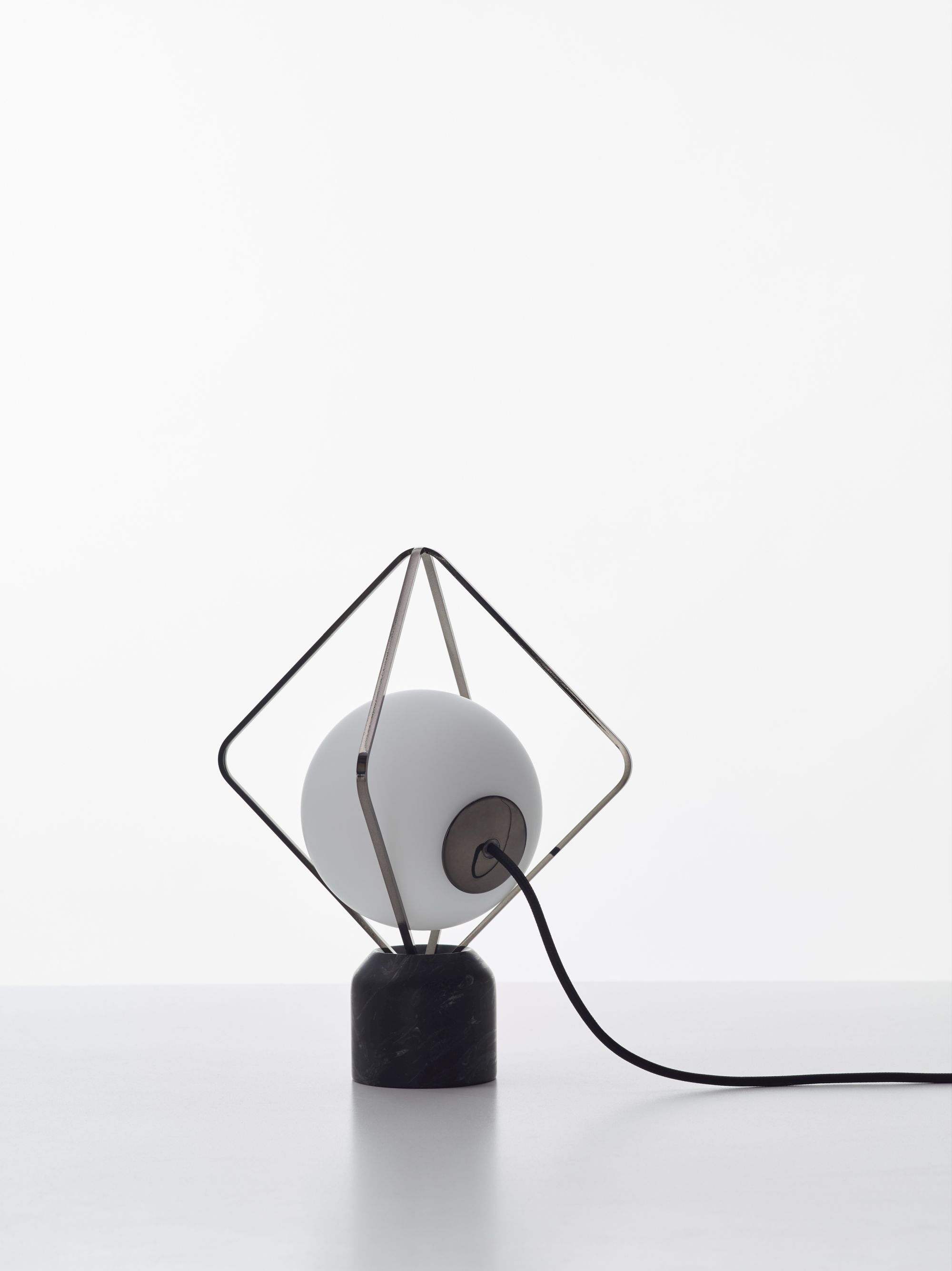 This modern lighting element with marble base, metal frames and a “pearl” placed inside, designed by Lucie Koldova, rounds out the variable Jack O’Lantern family. The new table version combines the beauty of handblown acid etched glass in smoke grey, light pink or triplex opal colours with marble base Carrara or Satinated nero marquinia, in frames with copper, chrome or chrome black liquid metal coating.