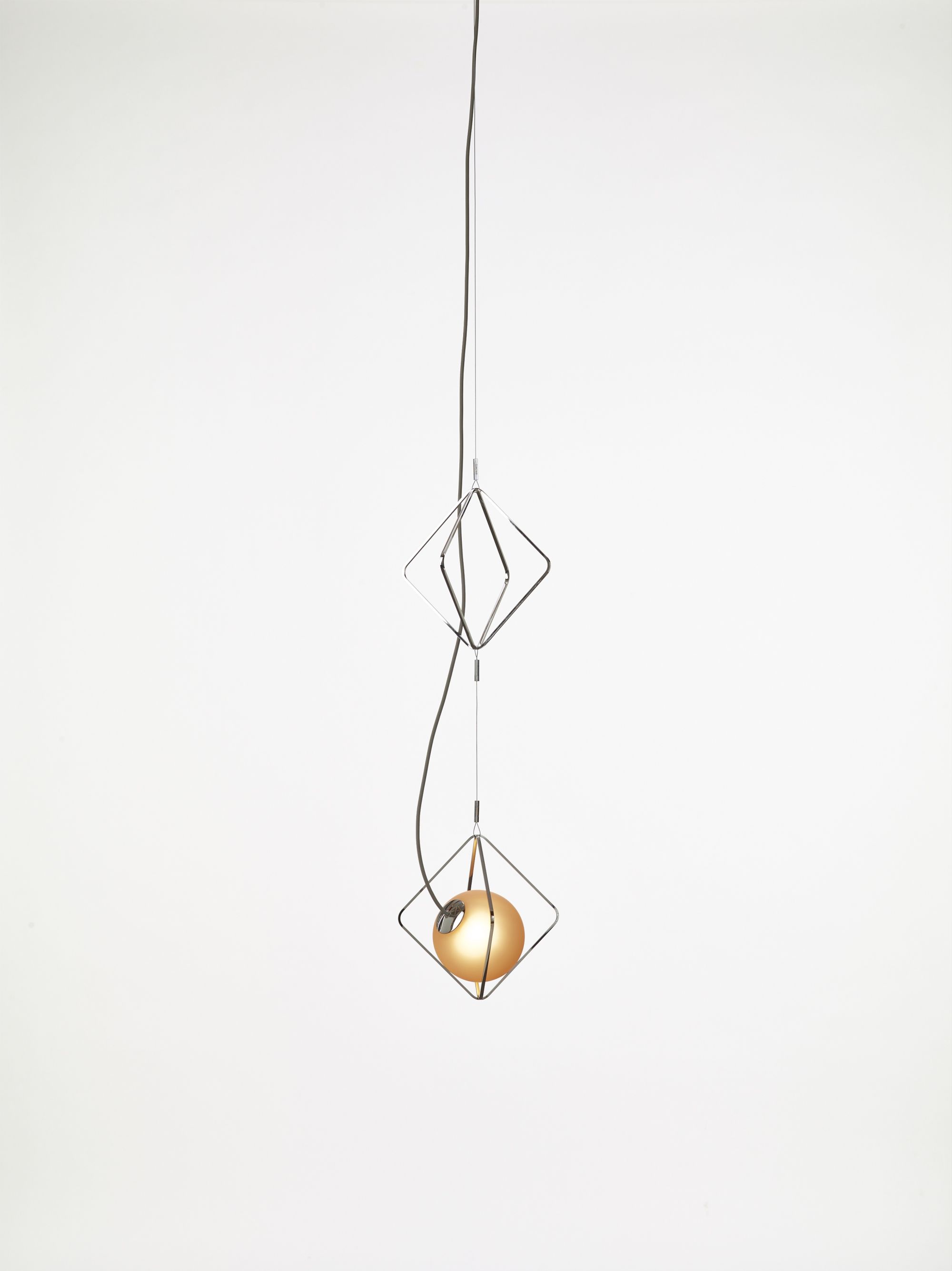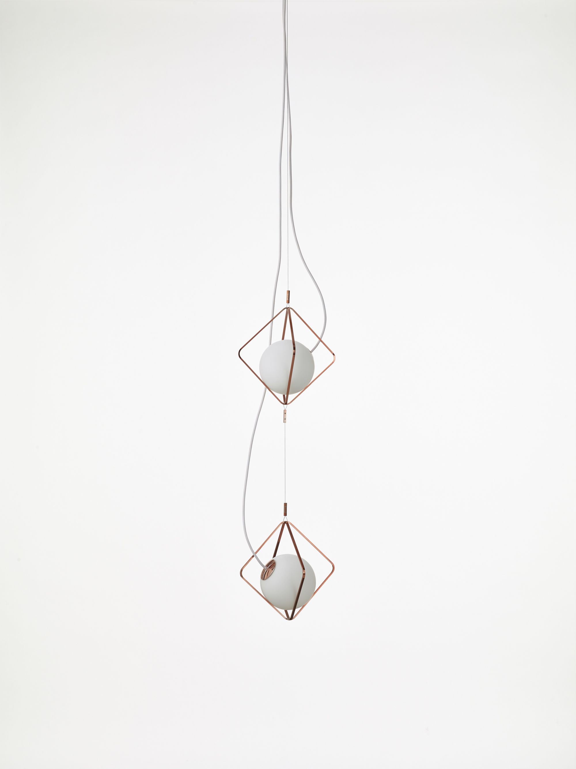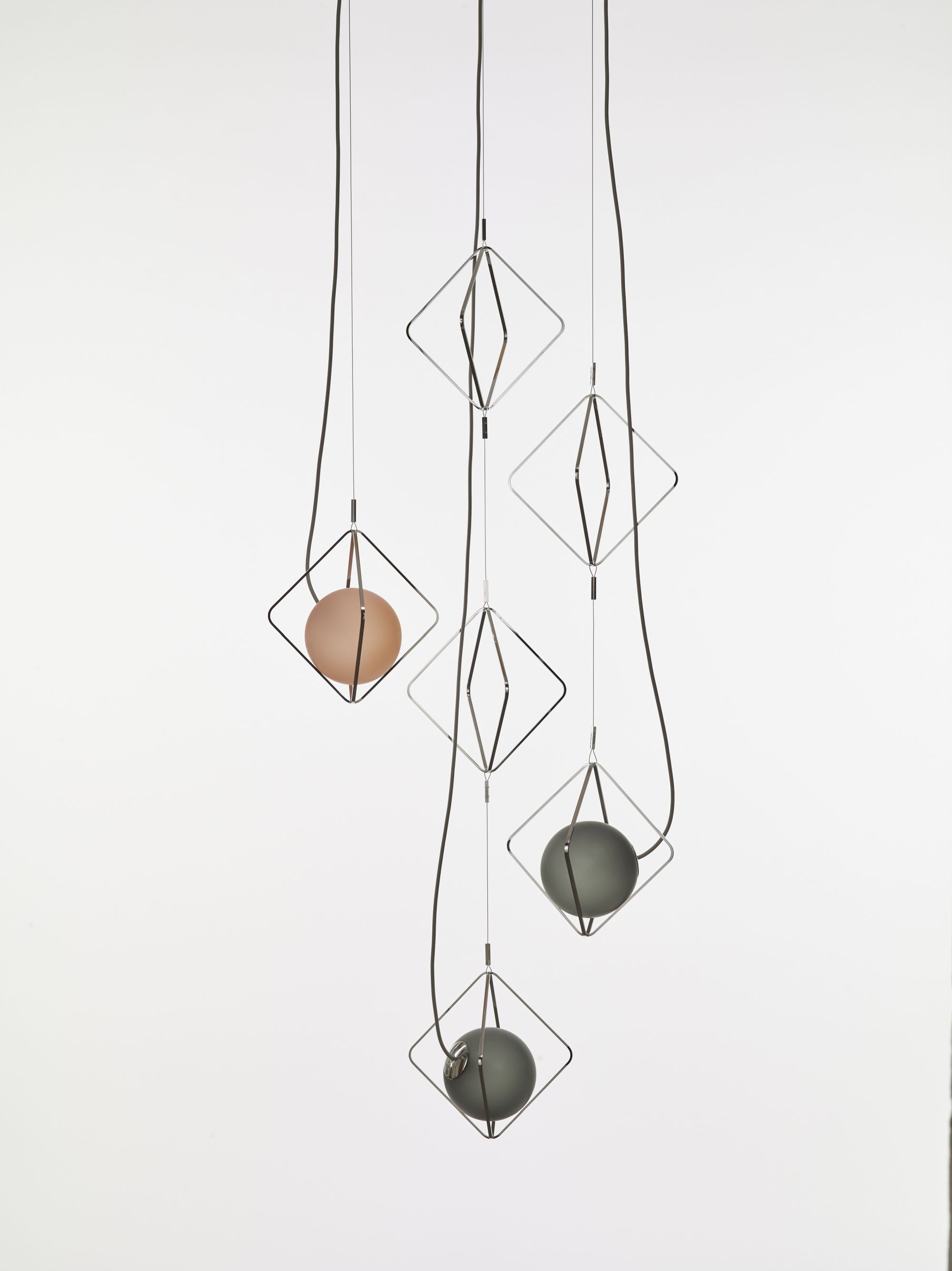 The Jack O’Lantern Table is available in two sizes and its Small version comes in size of 325 x 260 mm. This subtle and geometrically balanced light offers a wide variety of combinations. It can be hung separately or in vertical lighting arrangements. In addition to the suspension variant, there is also a wall composition comprising five frames joined in a single module for up to five glass spheres, which rely on nothing more than gravity to stay in place.