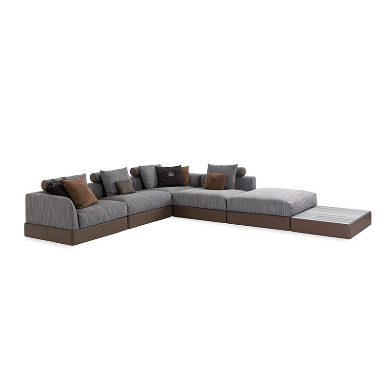 The band of fabrico or leather running along the fascia embraces the extremely high performance padding. A comfortable, spacious sofa embellished by the coffee table featuring Olympic Striato marble top. The back cushions sport a headrest roll pillow to afford even greater comfort and EB printed logo.