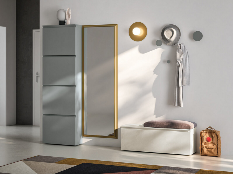 With a linear entrance furniture such as Sessanta every entrance, hallway or even the smallest space can be elegantly transformed and find its function. There are endless possibilities to customise cosy and functional solutions made up of hanging elements, drawers, mirrors, coat racks and open units.