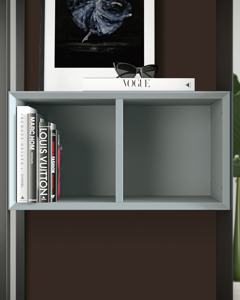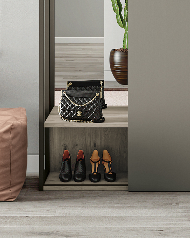 An entrance cabinet conceived as a single wardrobe unit, yet space-saving, thanks to its depth of only 35 centimetres. Its harmonious and well-balanced impact is due to its light and modern design, between full vertical lines, designed by sliding doors, and airy open compartments.